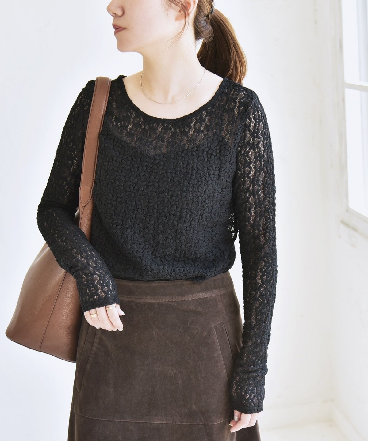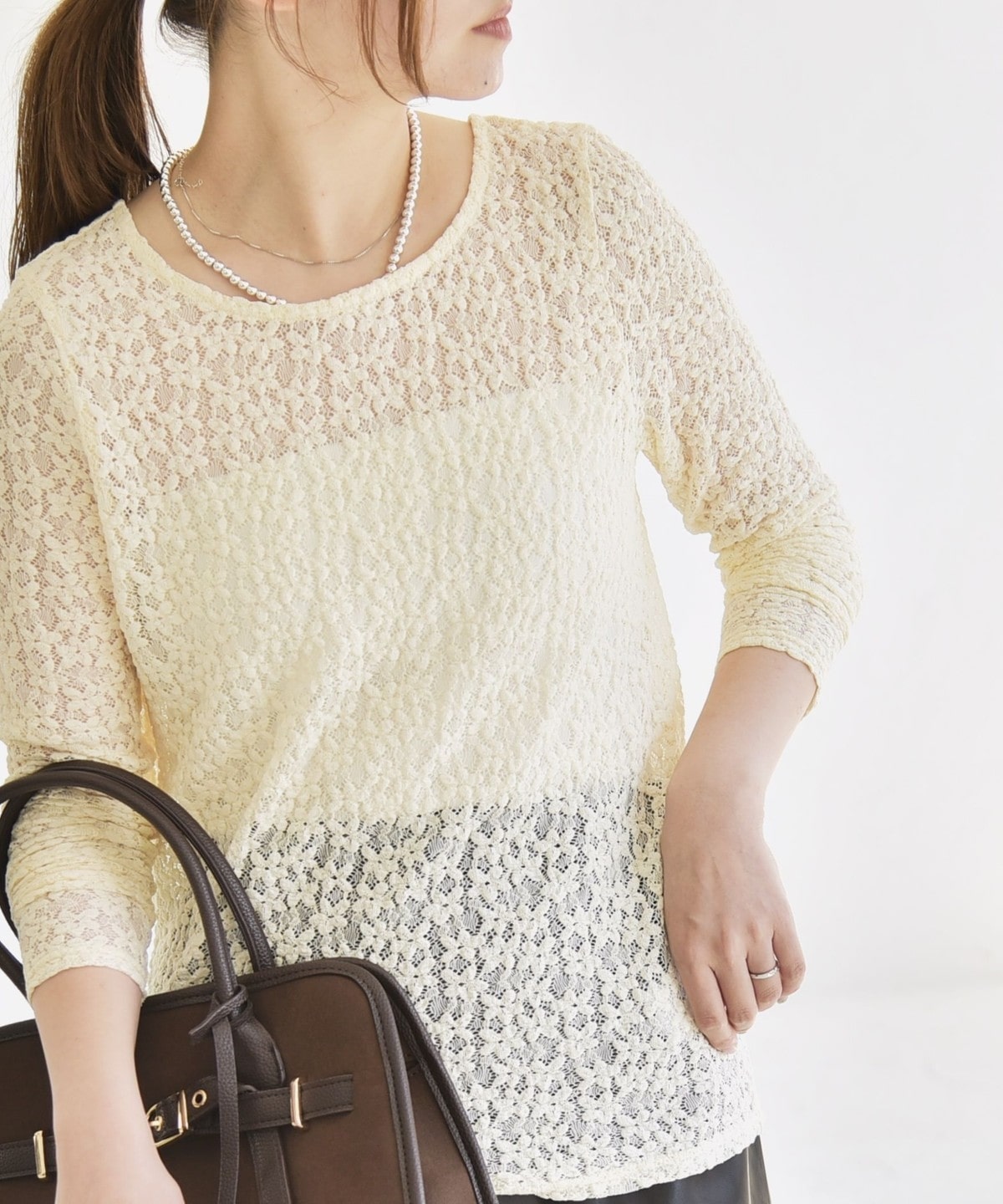 季節をまたいで重宝する、フラワーレースのシンプルカットソー。