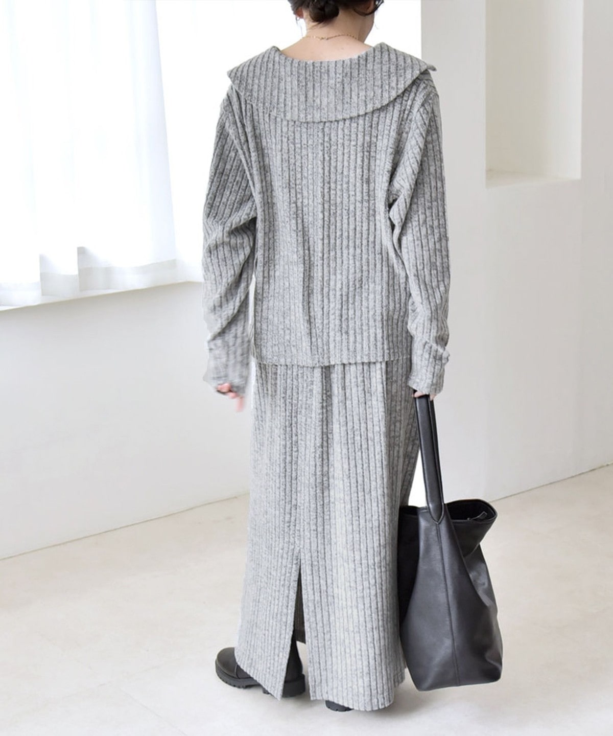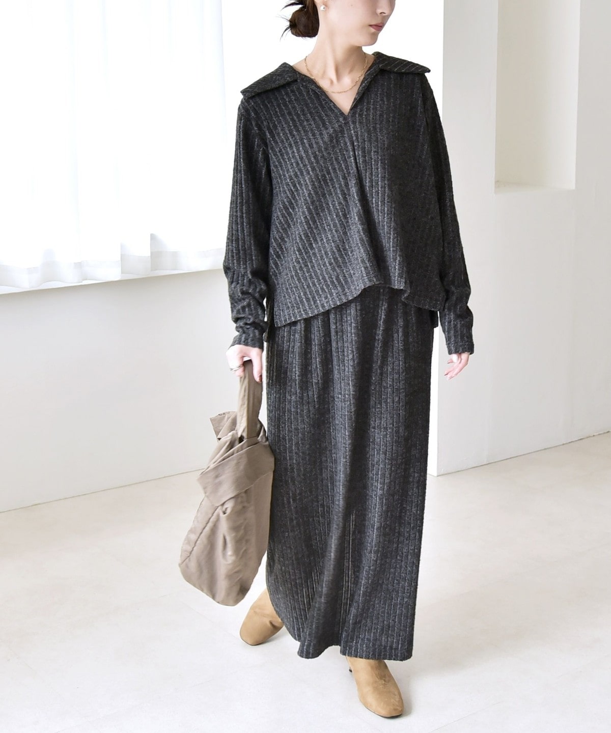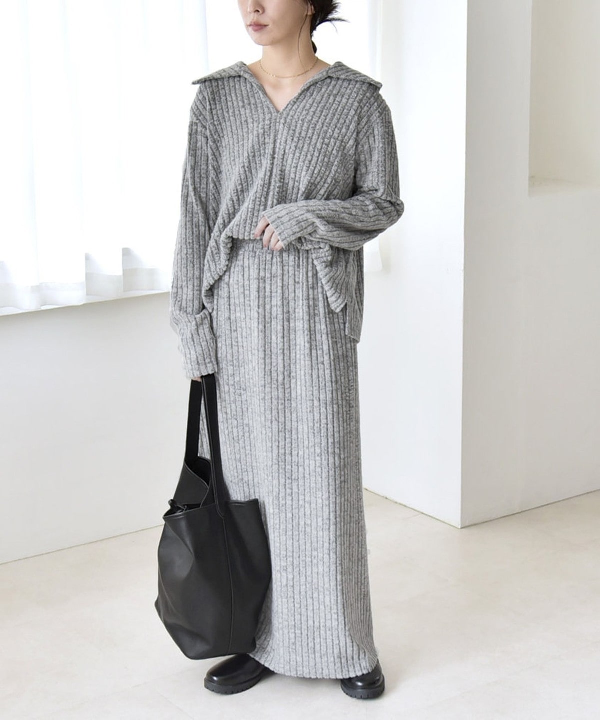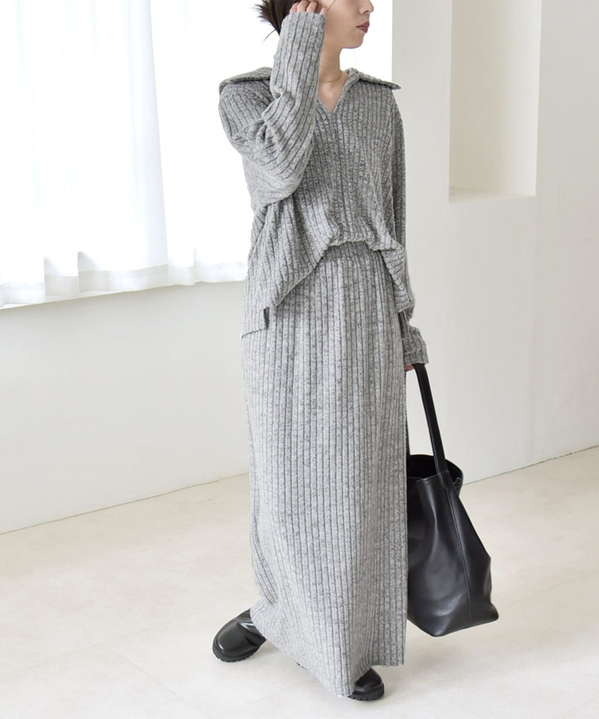 起毛感があり、柔らかく着心地の良いリブニット素材のトップス×スカートセットアップ。