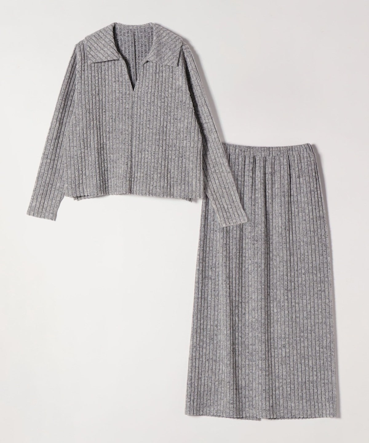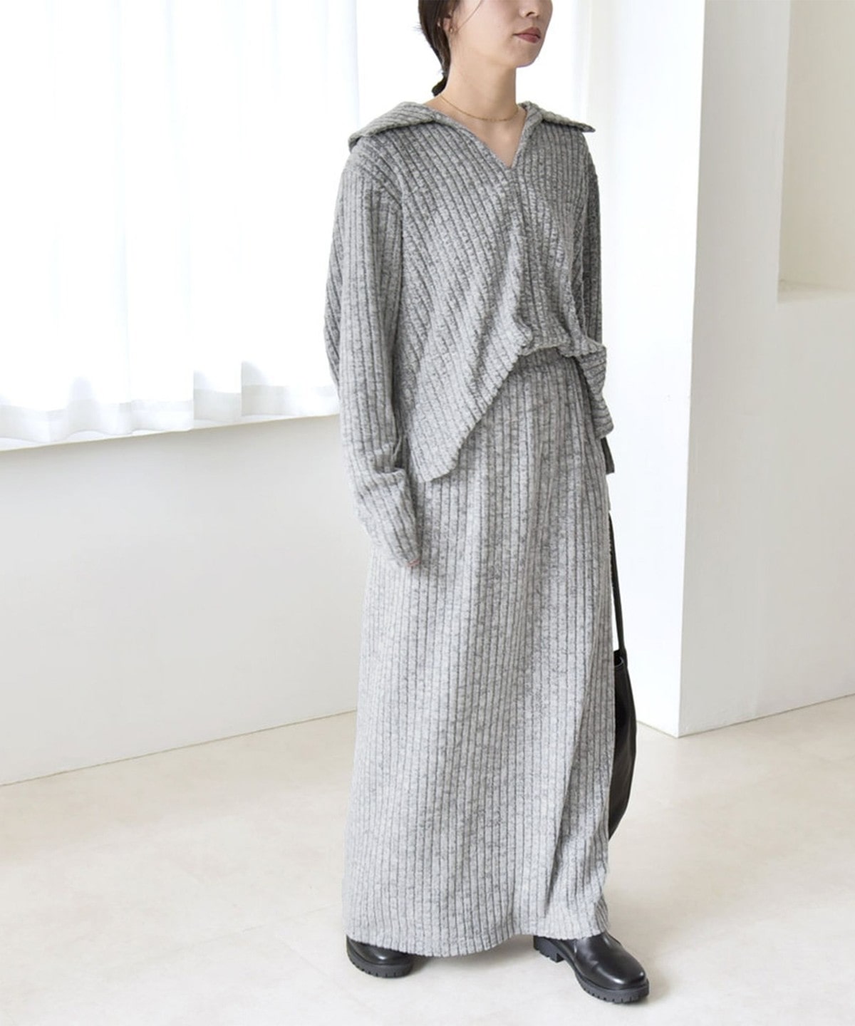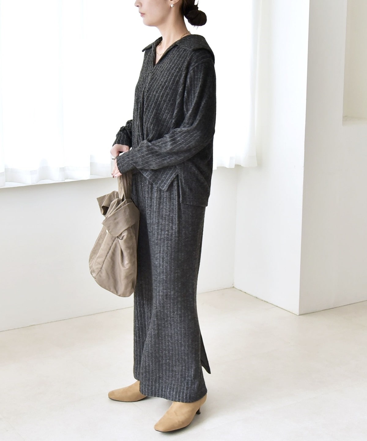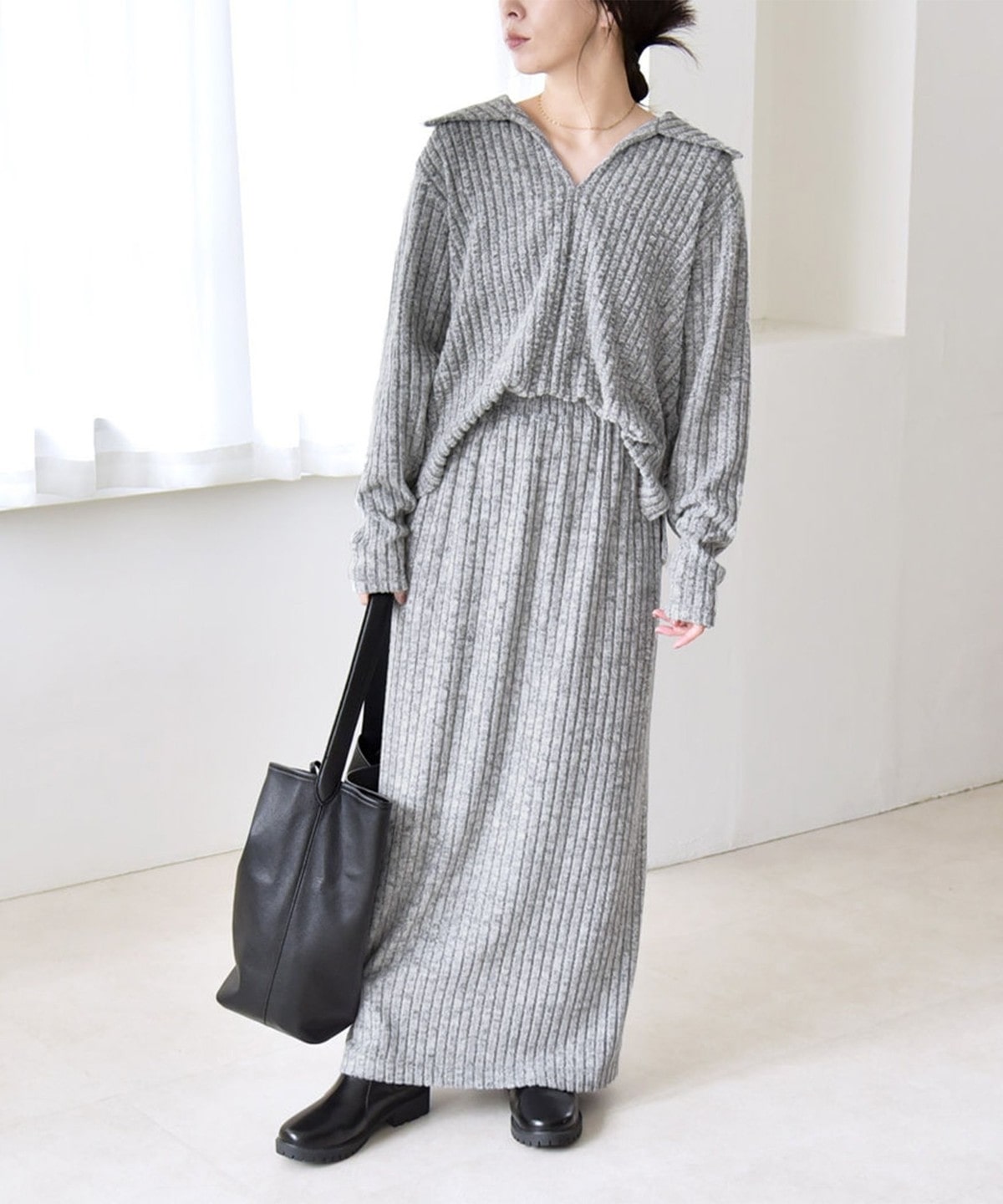 起毛感があり、柔らかく着心地の良いリブニット素材のトップス×スカートセットアップ。