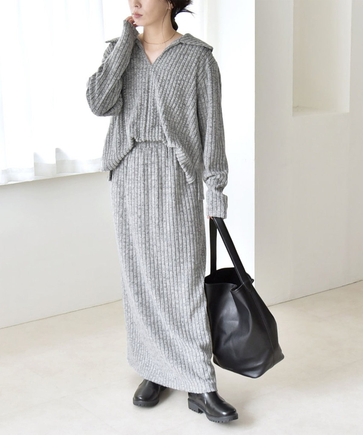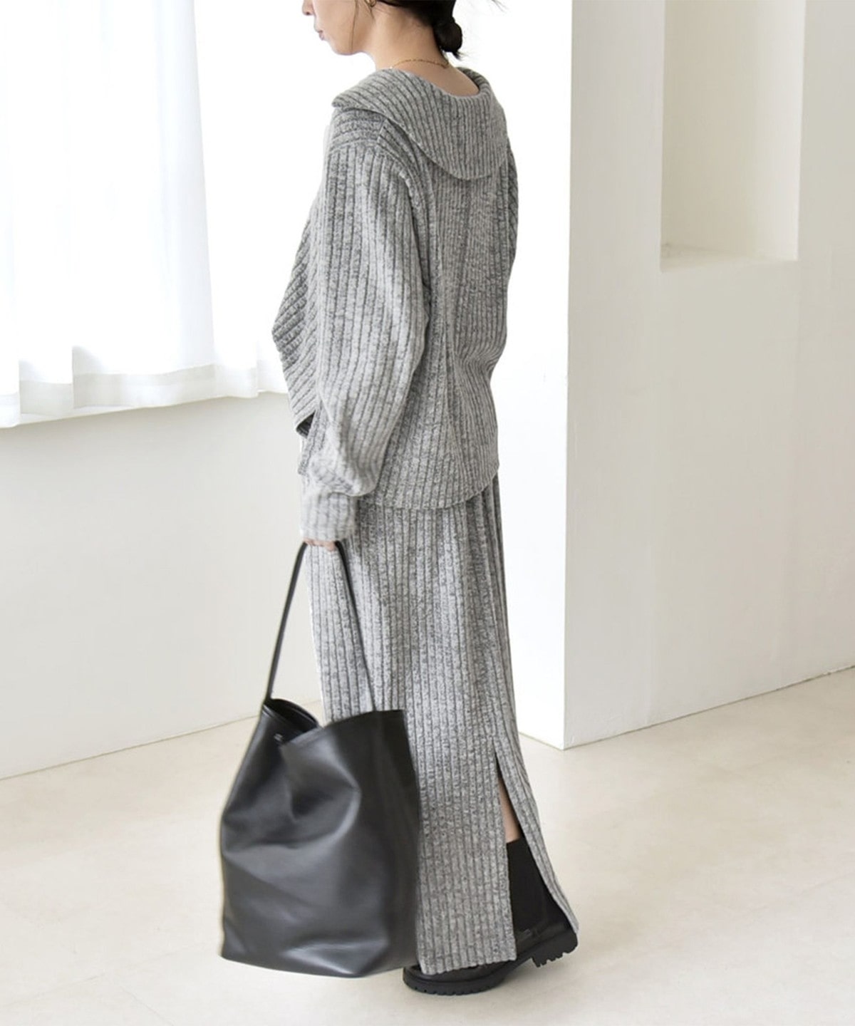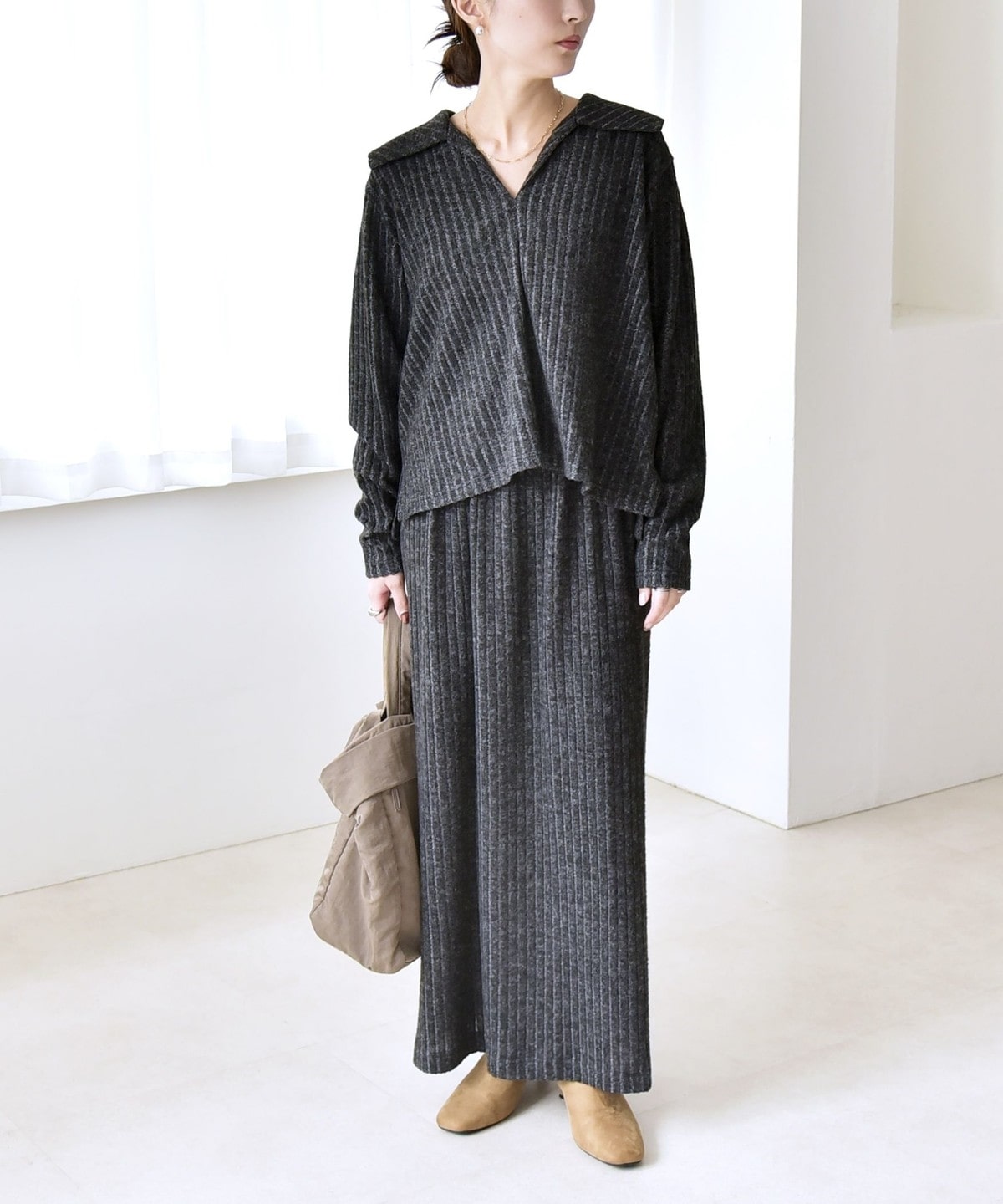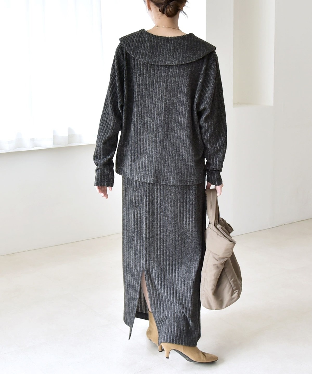 起毛感があり、柔らかく着心地の良いリブニット素材のトップス×スカートセットアップ。