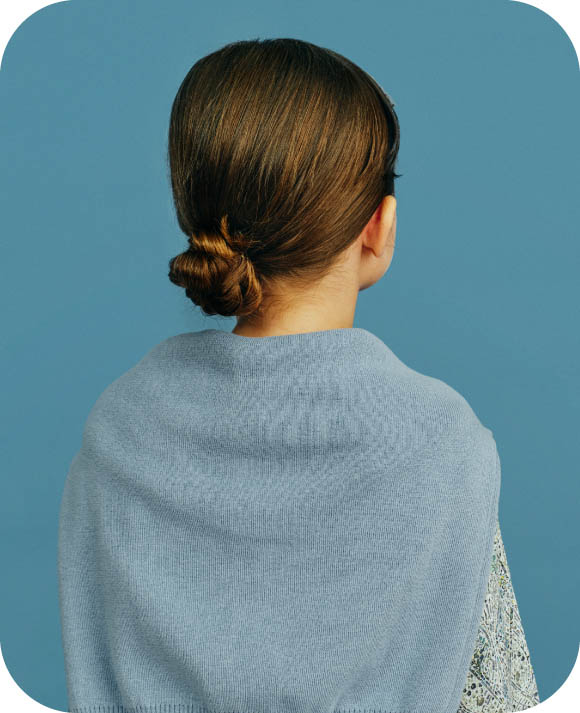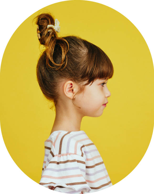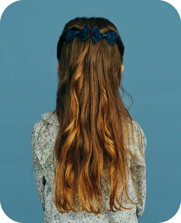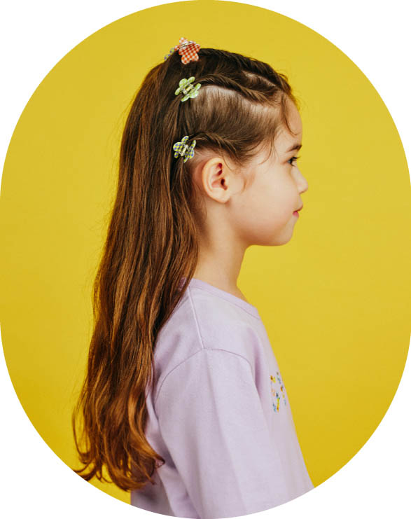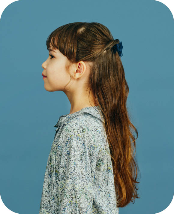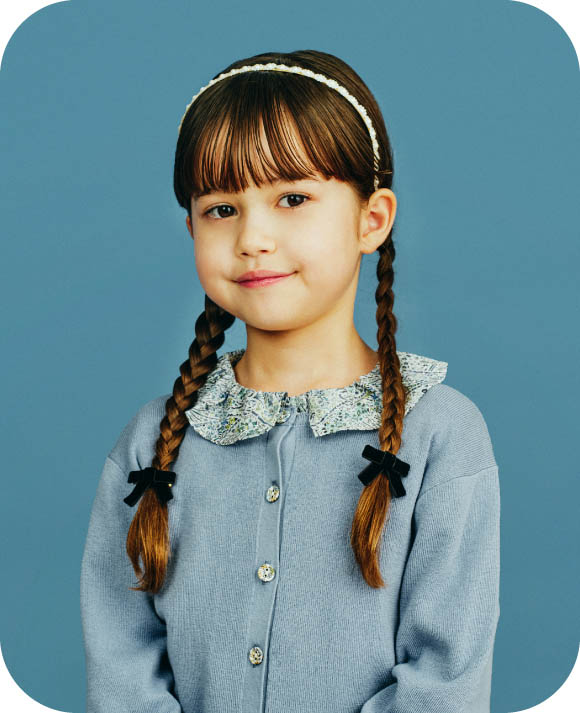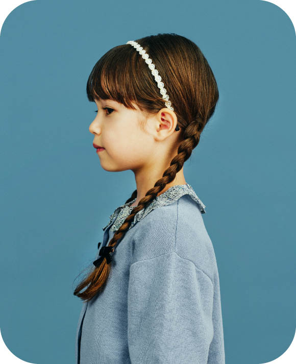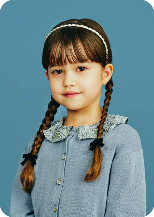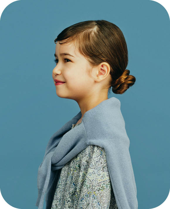 低い位置でくるくるねじり、U ピンでとめてタイトなおだんごを作ったら、深めのサイドパートで前髪を流して、ミニサイズのフラワーピンでキュッ。顔まわりの毛をすこし残してうぶ毛にニュアンスをつければ、キッズの愛らしさもキープ。お出かけに、家族の食事、記念撮影などのきちんとデーにもぴったり。