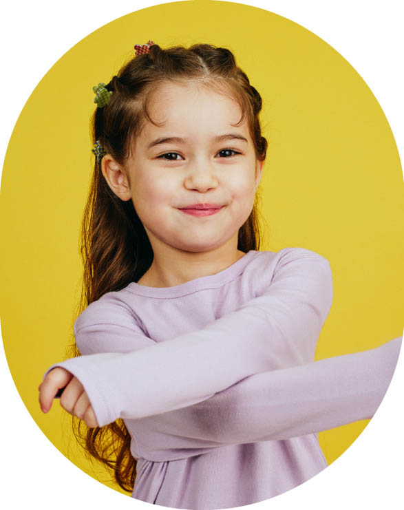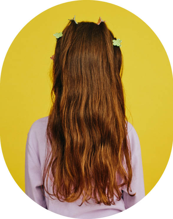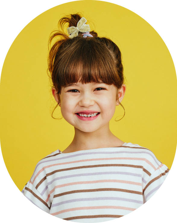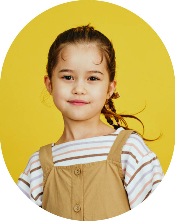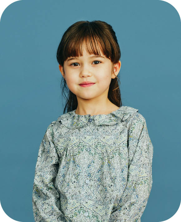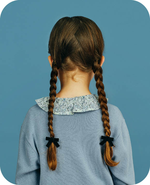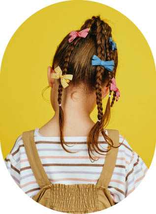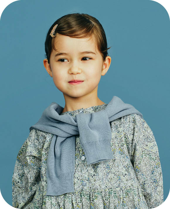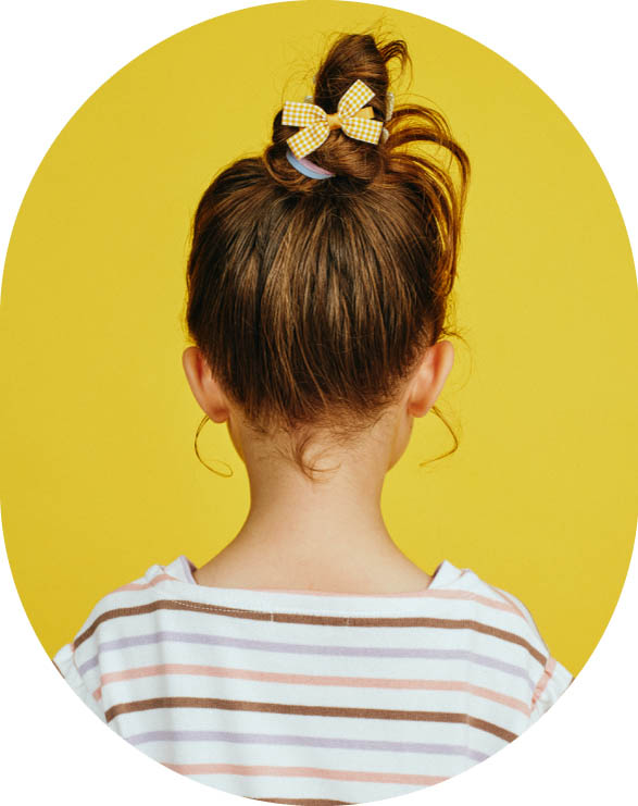 低い位置でくるくるねじり、U ピンでとめてタイトなおだんごを作ったら、深めのサイドパートで前髪を流して、ミニサイズのフラワーピンでキュッ。顔まわりの毛をすこし残してうぶ毛にニュアンスをつければ、キッズの愛らしさもキープ。お出かけに、家族の食事、記念撮影などのきちんとデーにもぴったり。