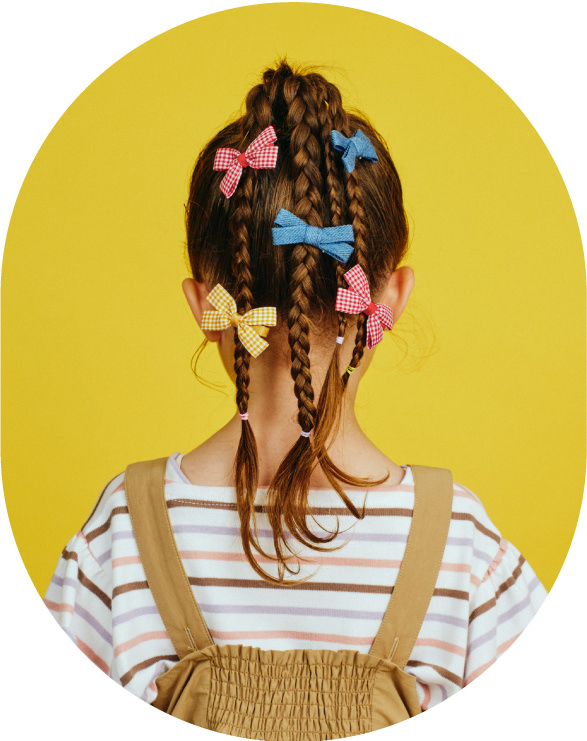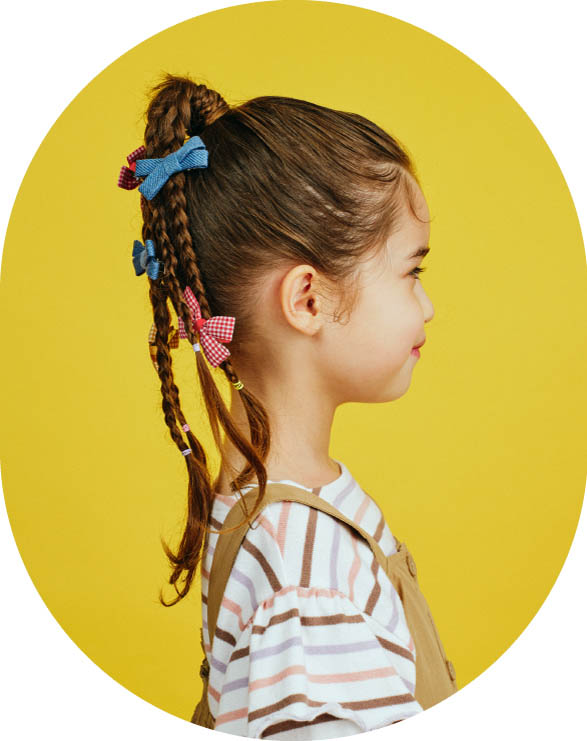 高い位置でポニーテールを結んだら、毛束をランダムに取り分けて、好きな本数で三つ編みをして毛先をゴムでとめて。編んだ部分にギンガムとツイルのリボンをランダムにつければ、カジュアルなアクセントになるよ。いつものポニーに特別感をプラスして、いつもの日だって記念日に!