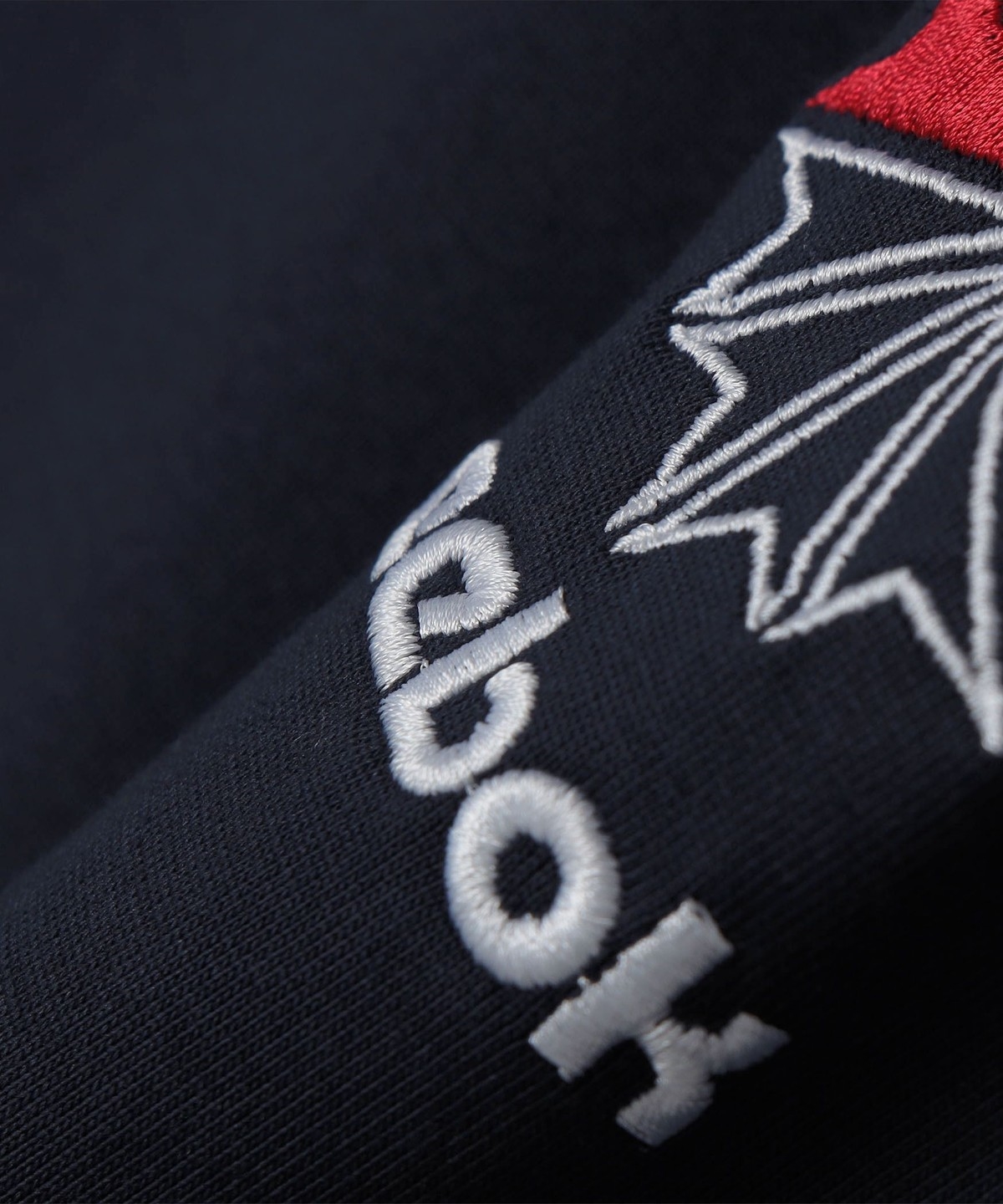 胸にはクラシックロゴとCAPのモチーフ、襟裏にはベクターロゴをボディと同色で刺繍しています。