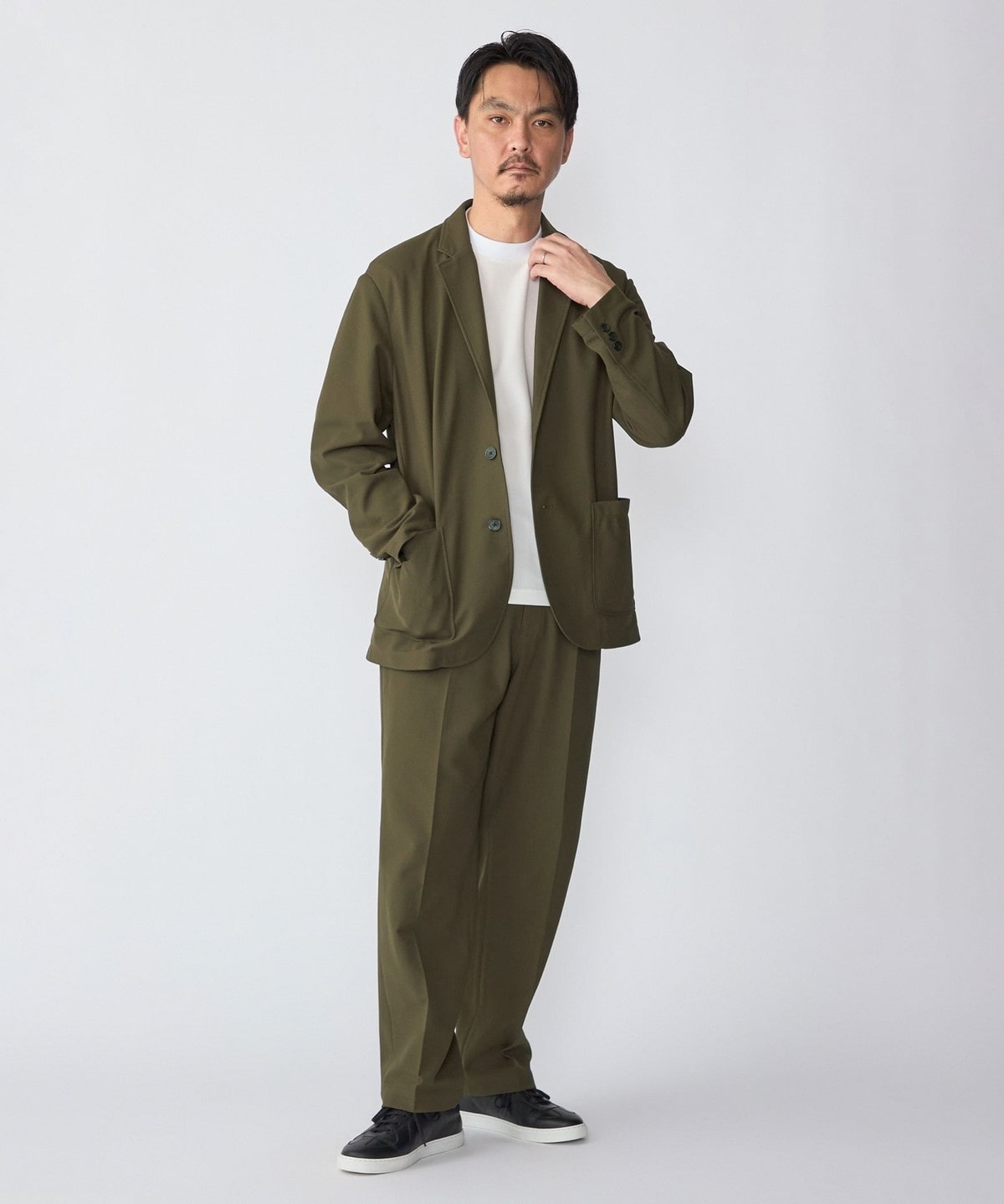 同素材でセットアップ着用可能なジャケット、パンツ、ポロシャツを展開。