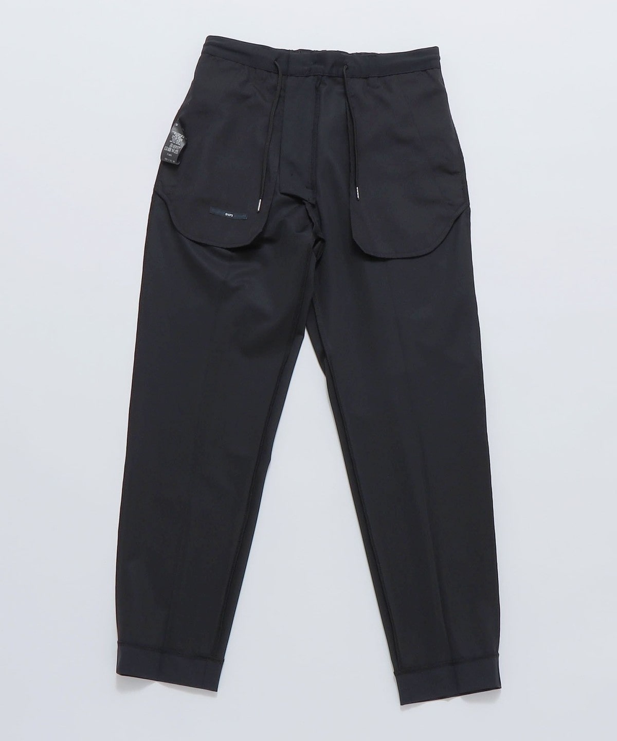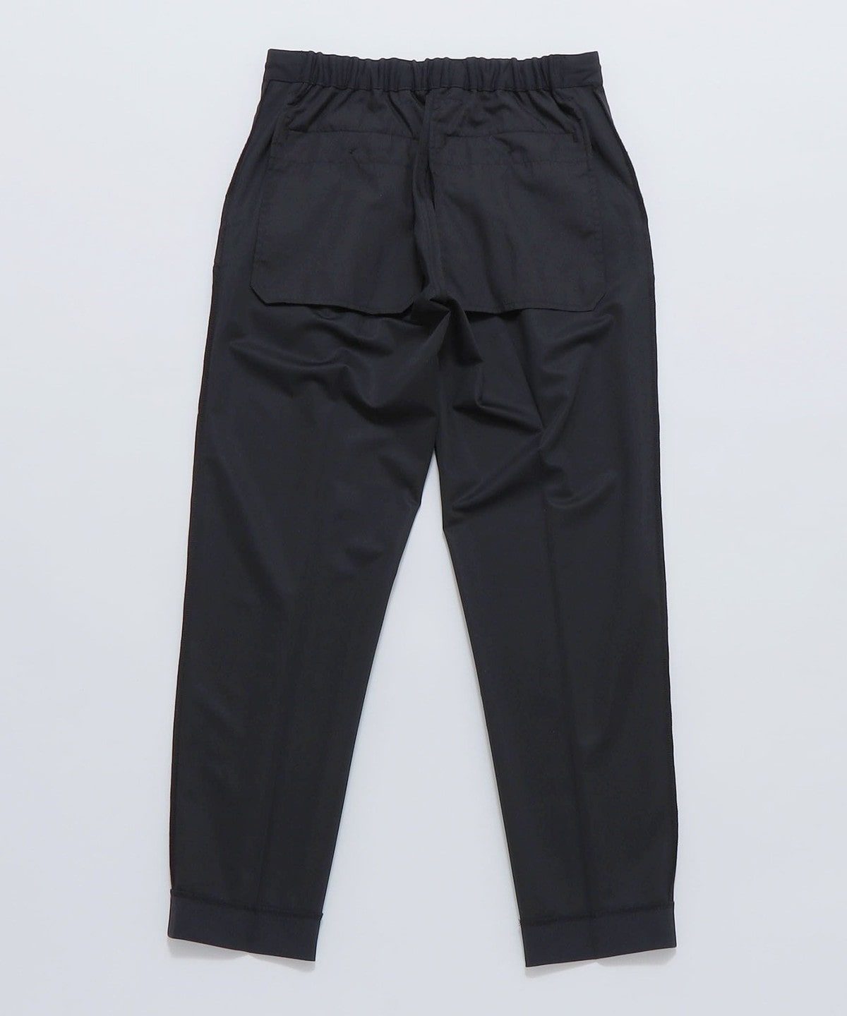 ウエスト部分は後身頃のみゴム仕様にして、ドローストリング(紐)で調整が可能なためラクチンな穿き心地です。