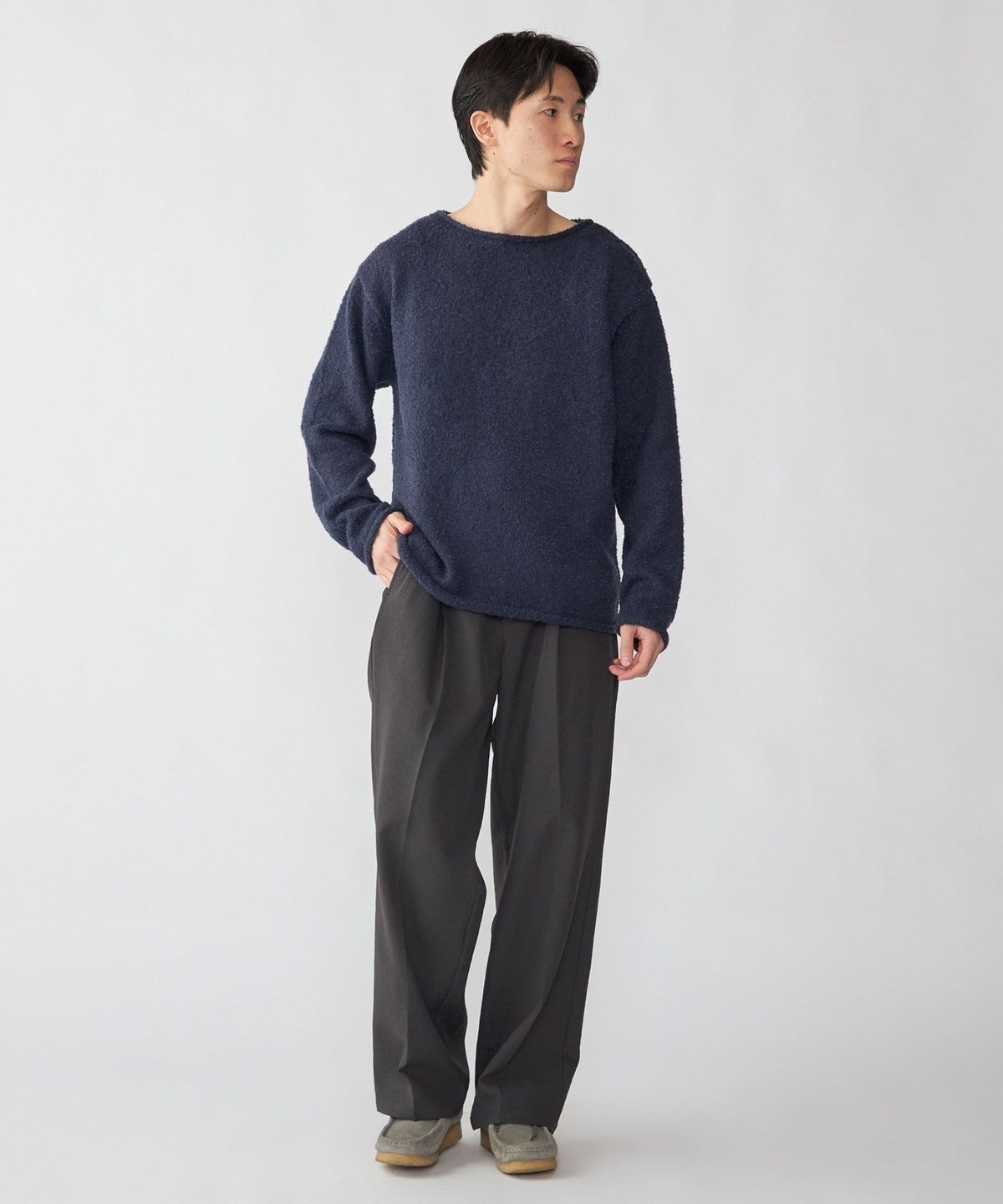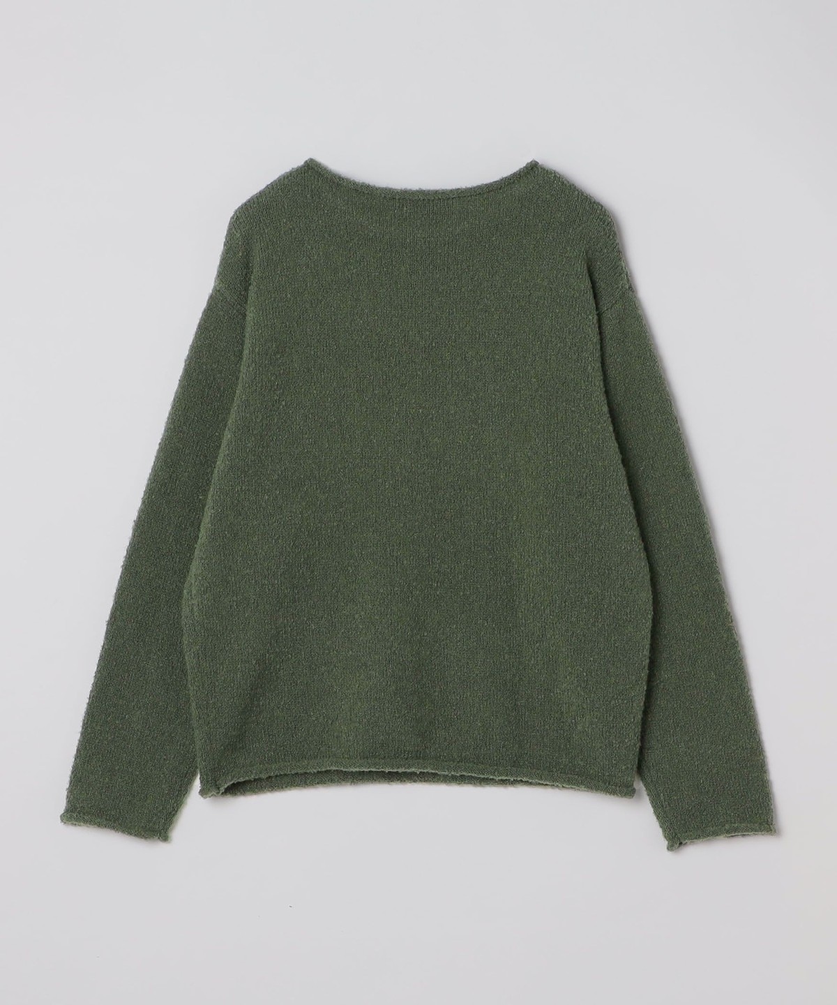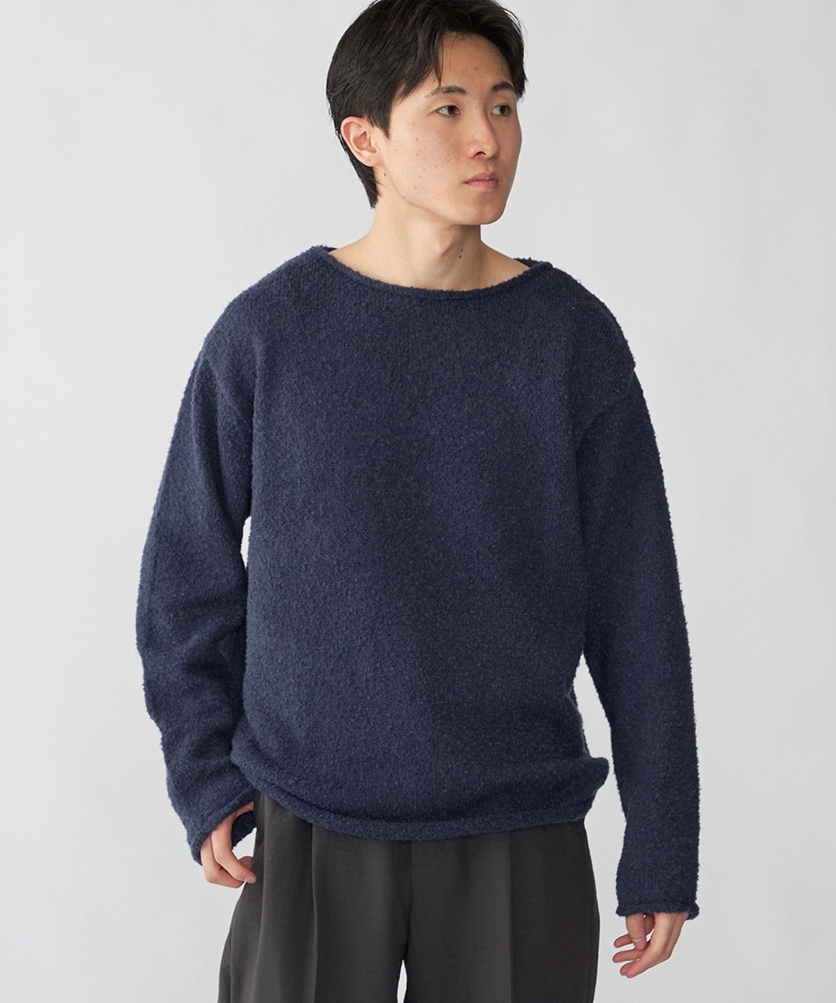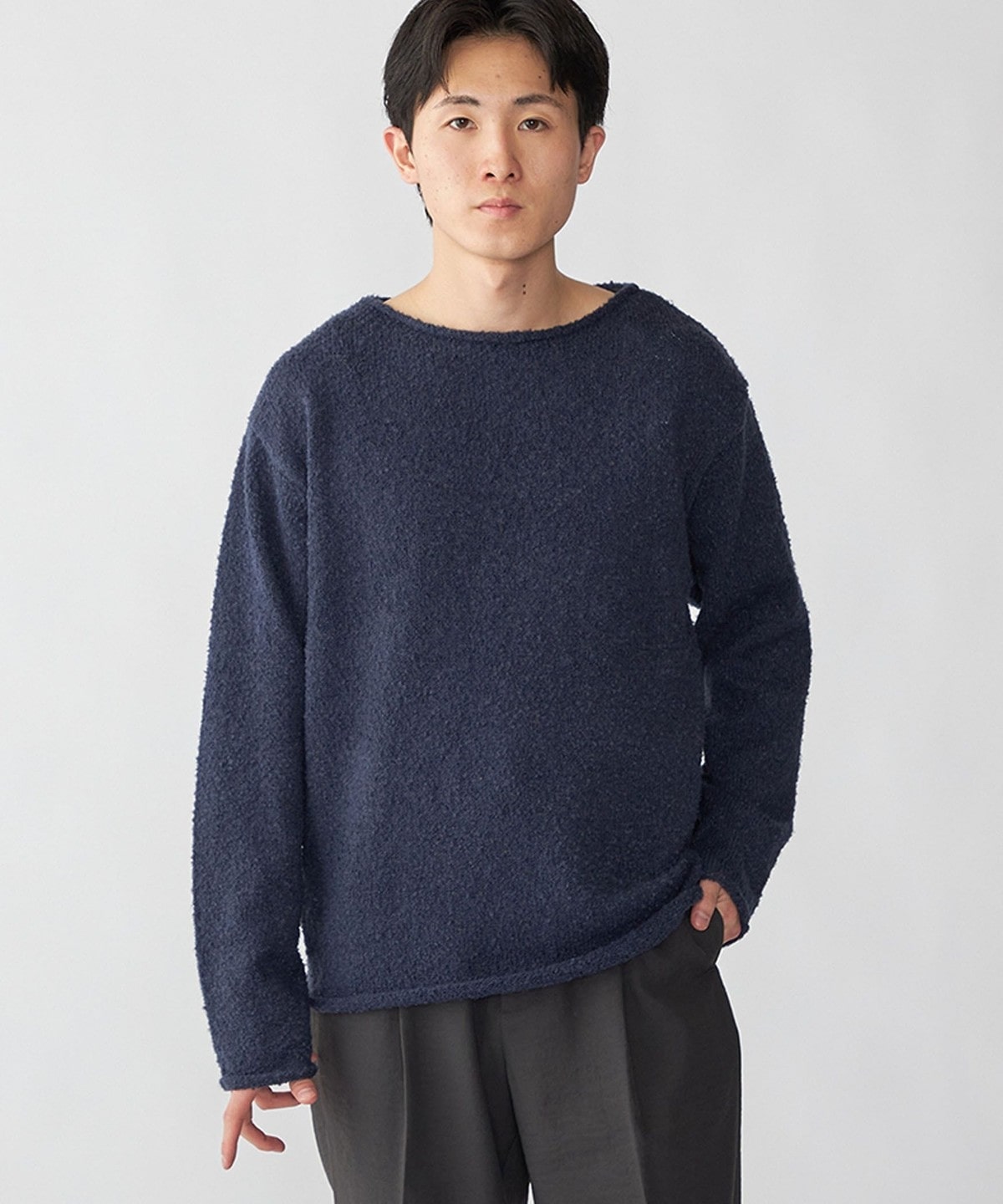 フリースのような柔らかいブークレヤーンを使用したソフトで着心地の良いニットプルオーバーです。