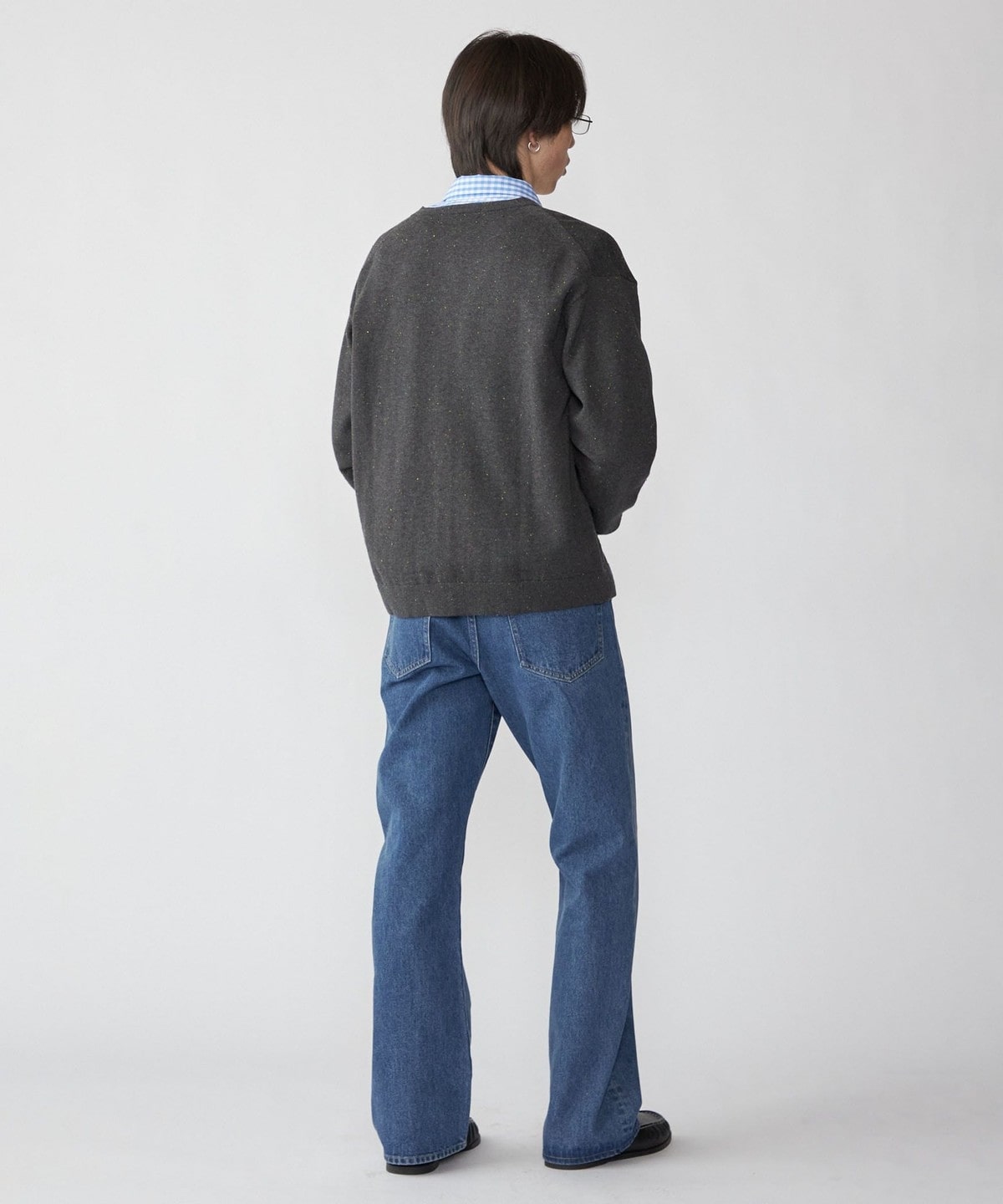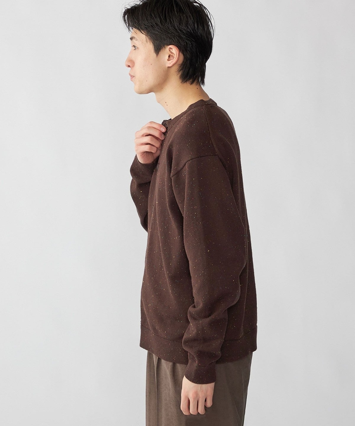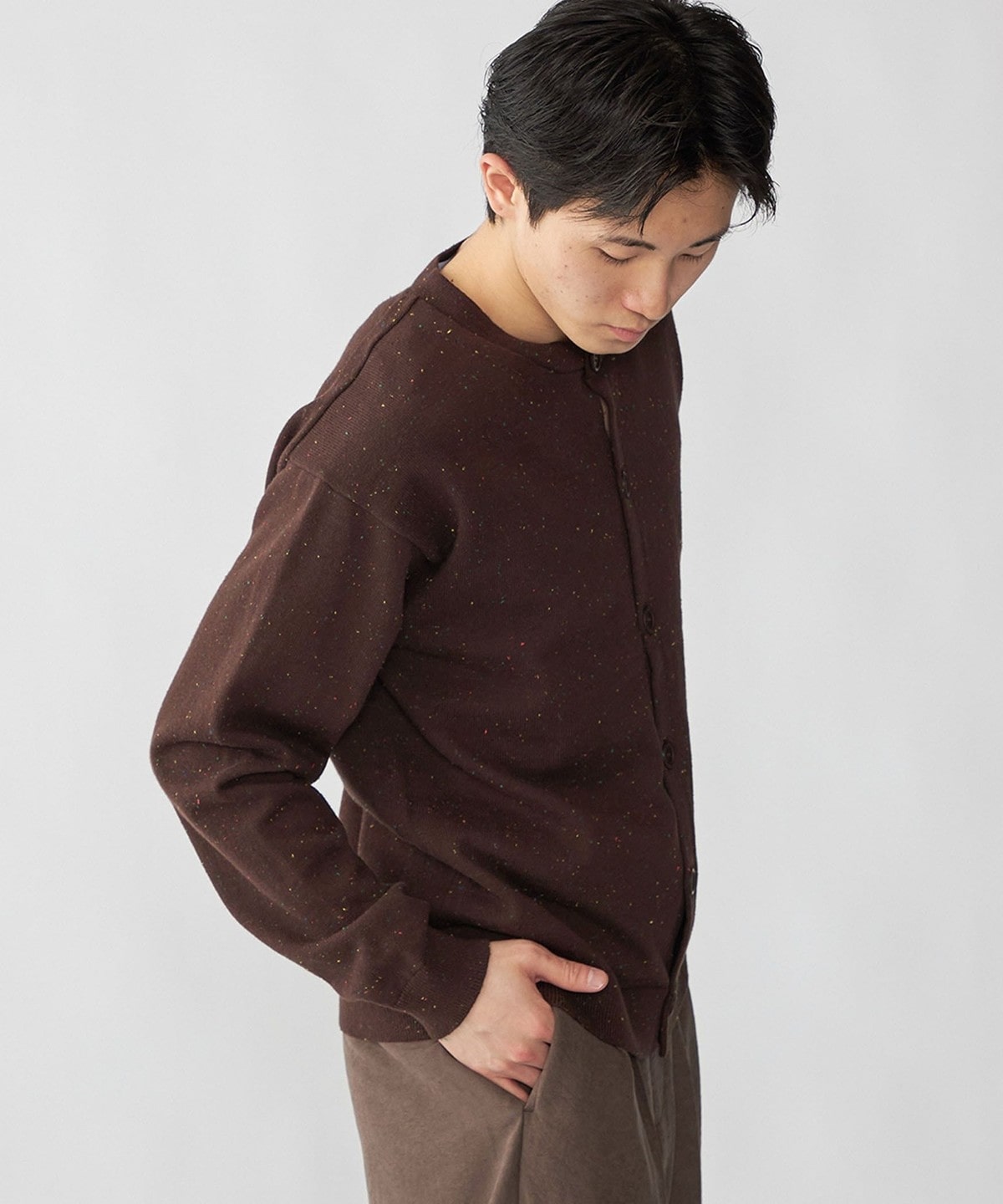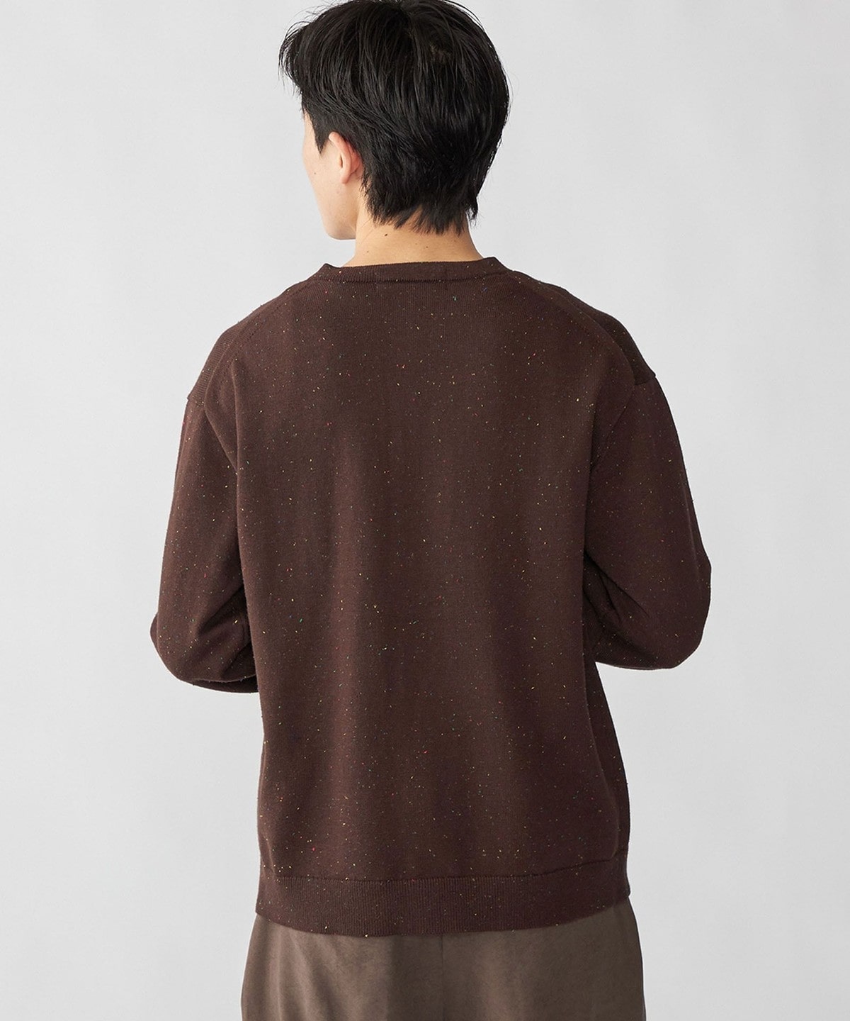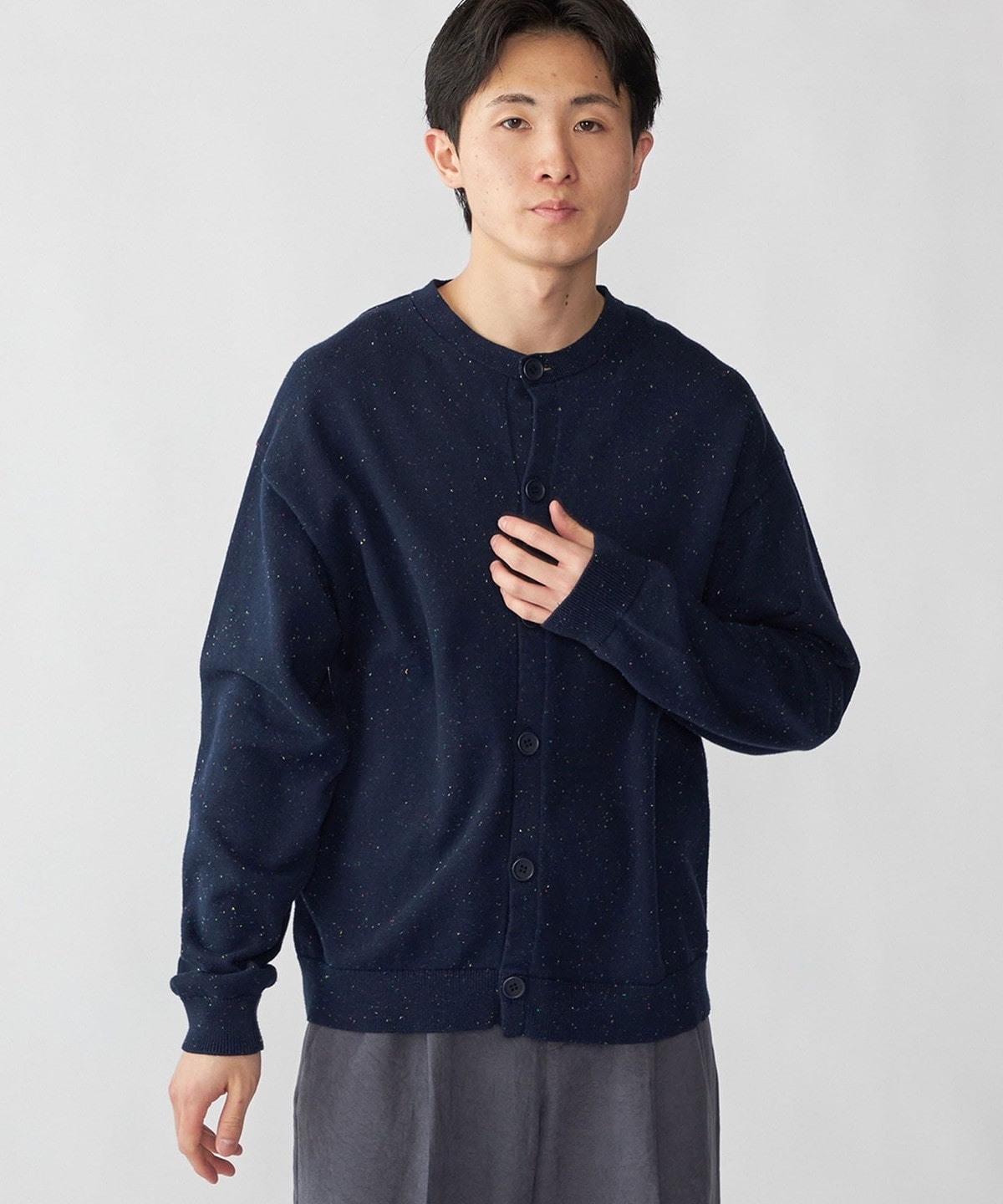 トレンド感のあるカラーネップ糸を使用したクルーネックカーディガン。
