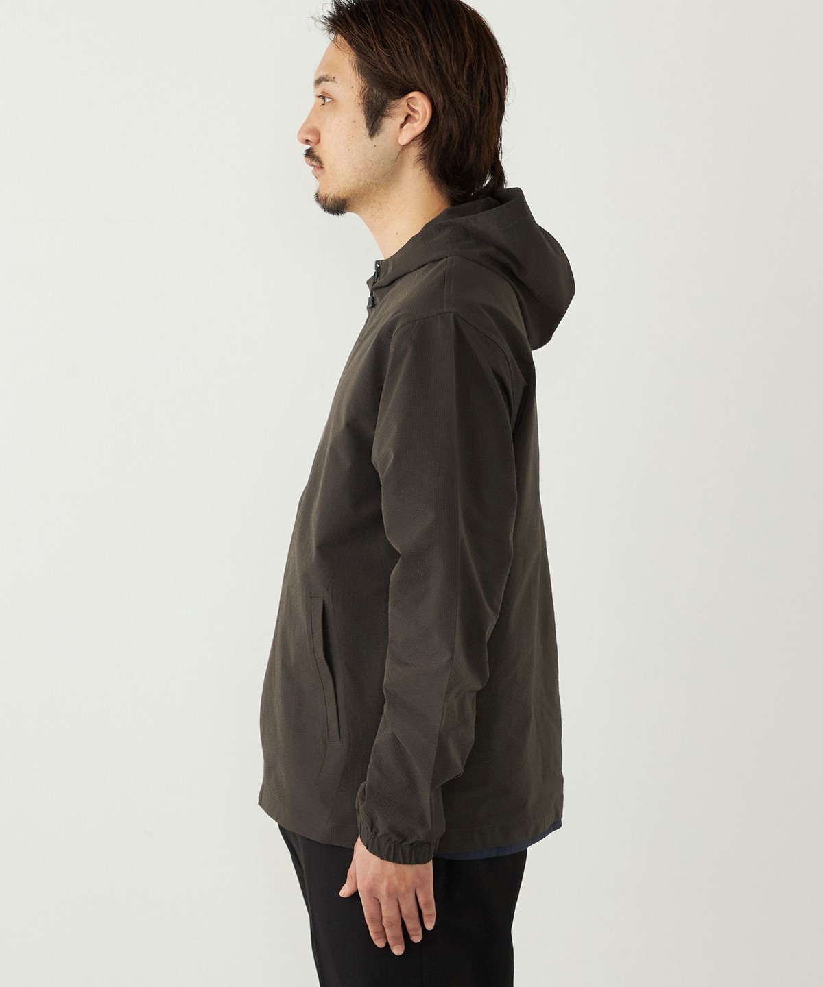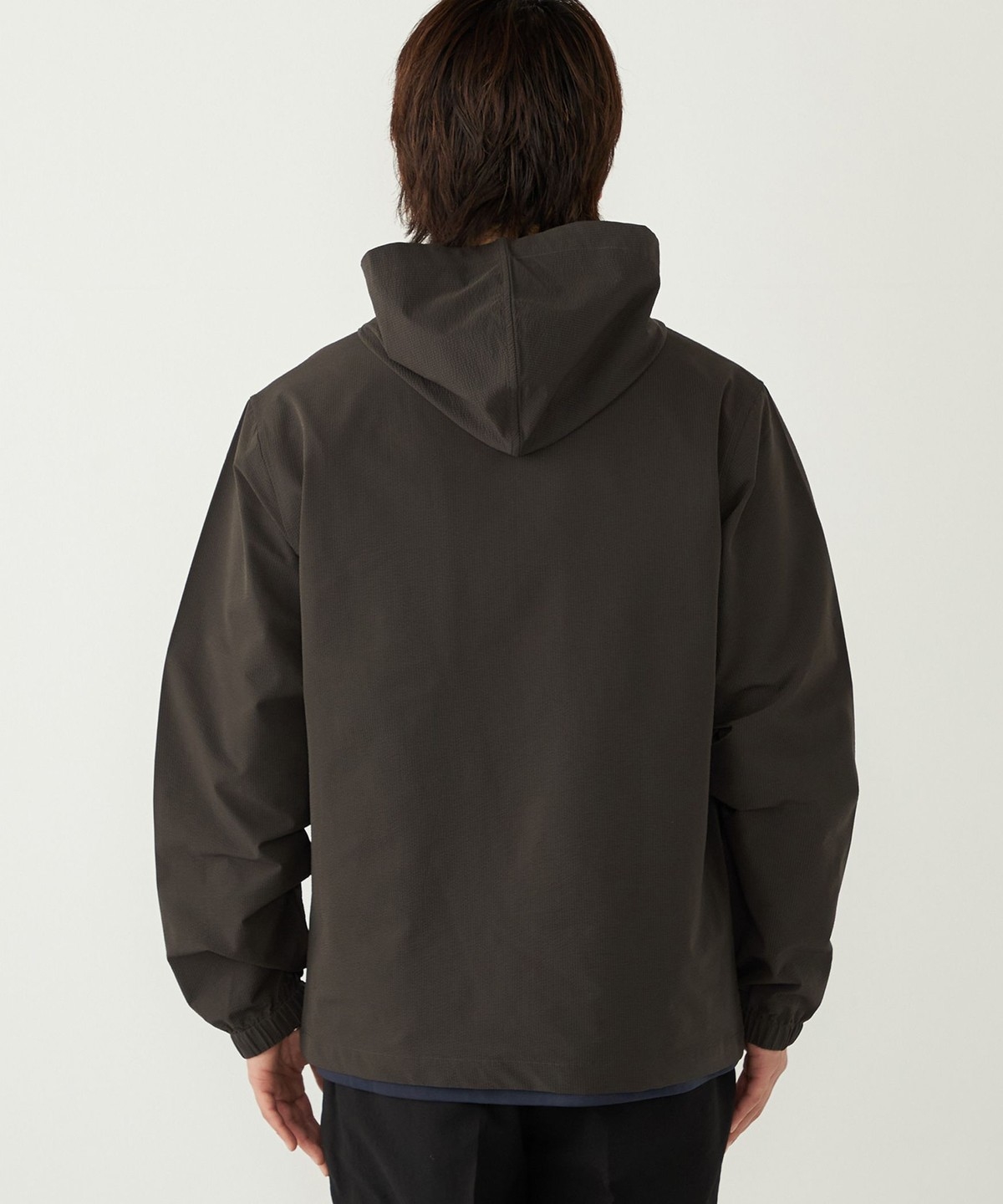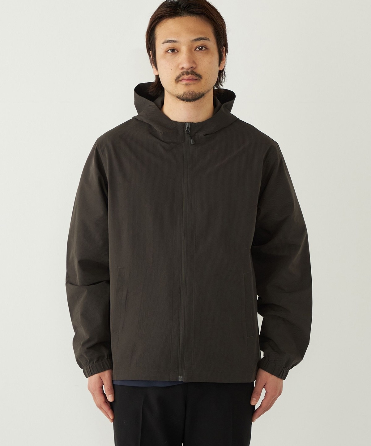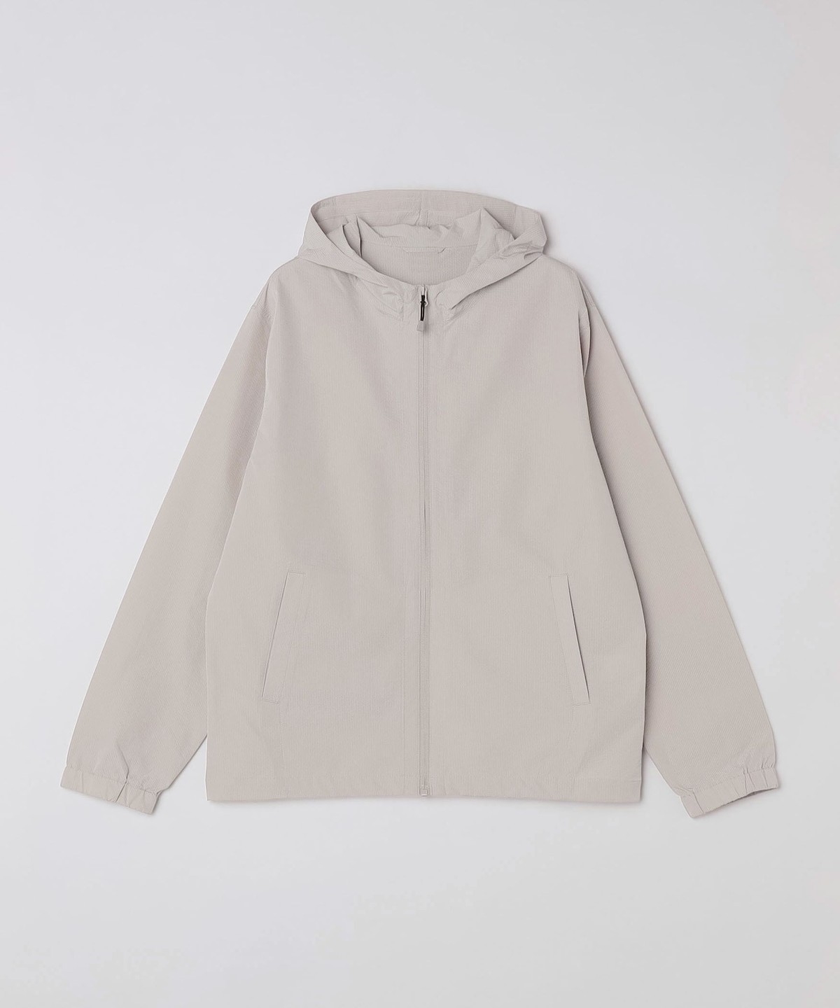 サッカー素材を使用したパーカー型ブルゾン。