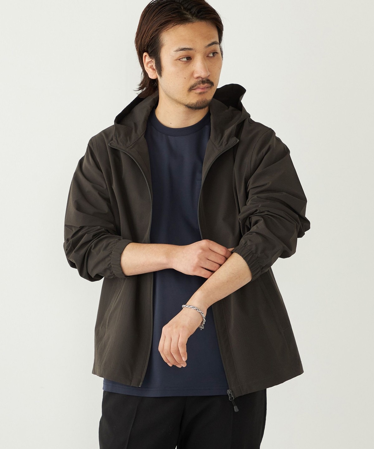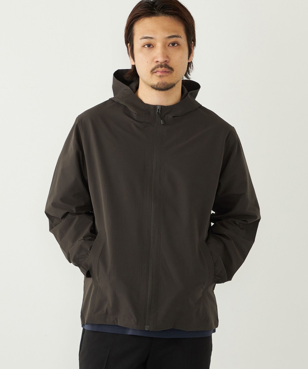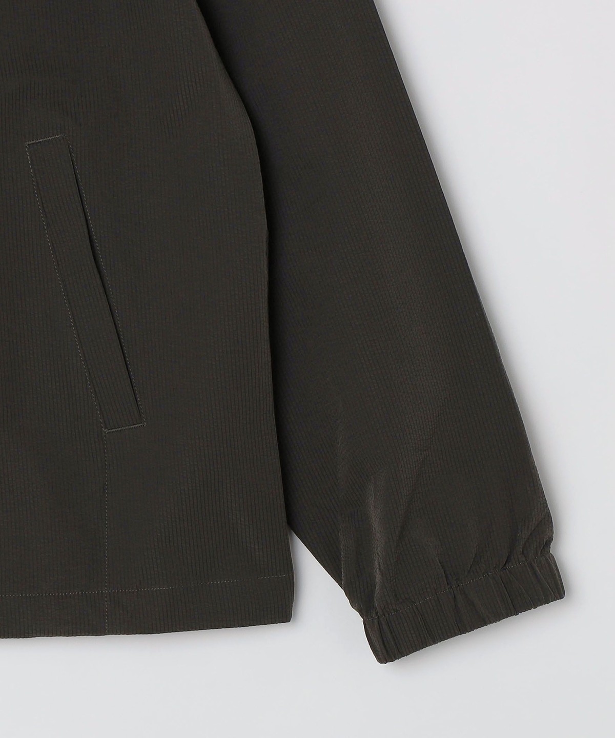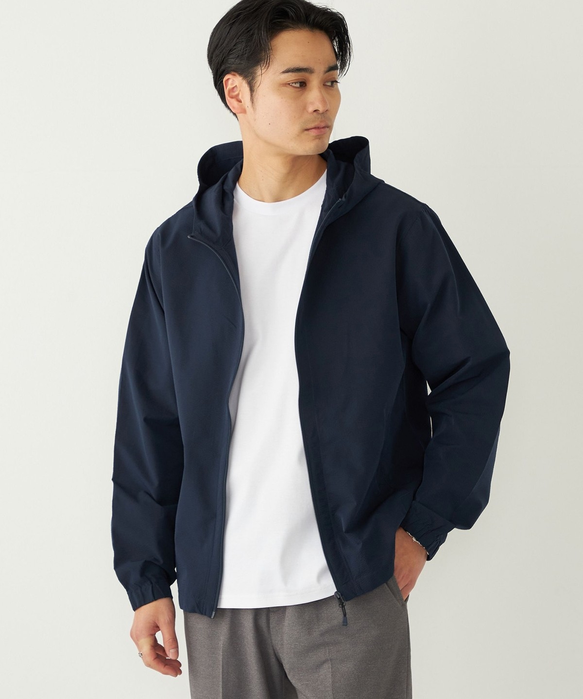 サッカー素材を使用したパーカー型ブルゾン。
