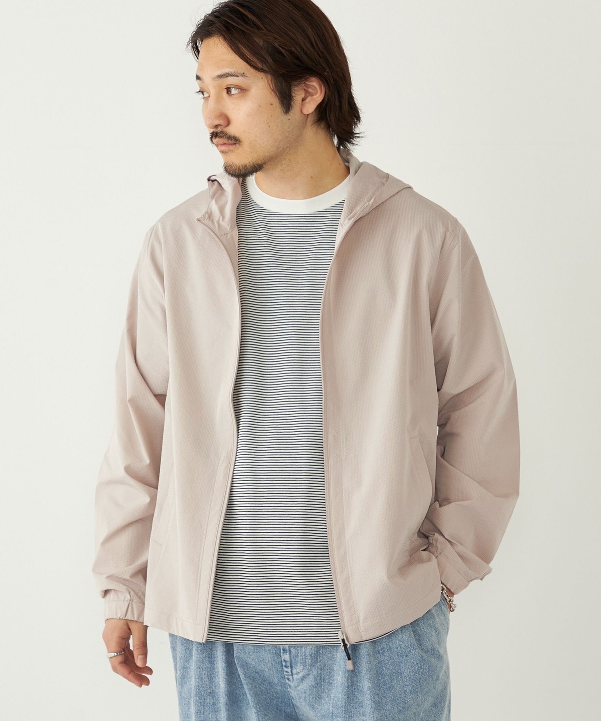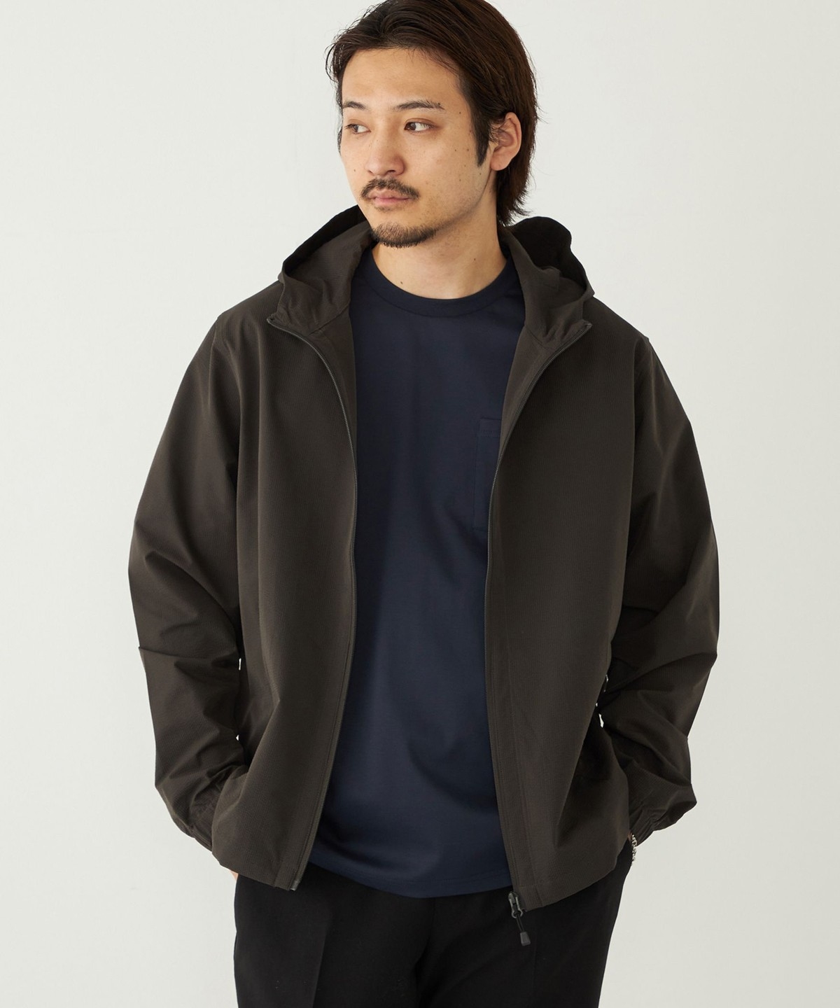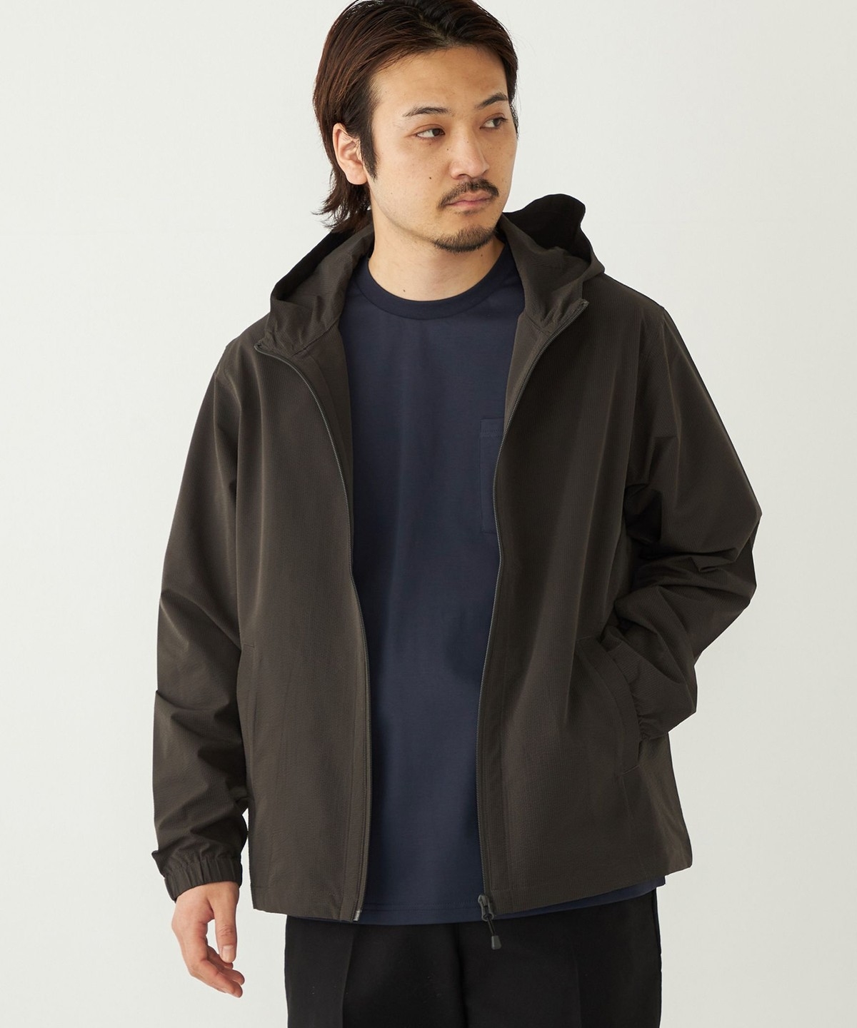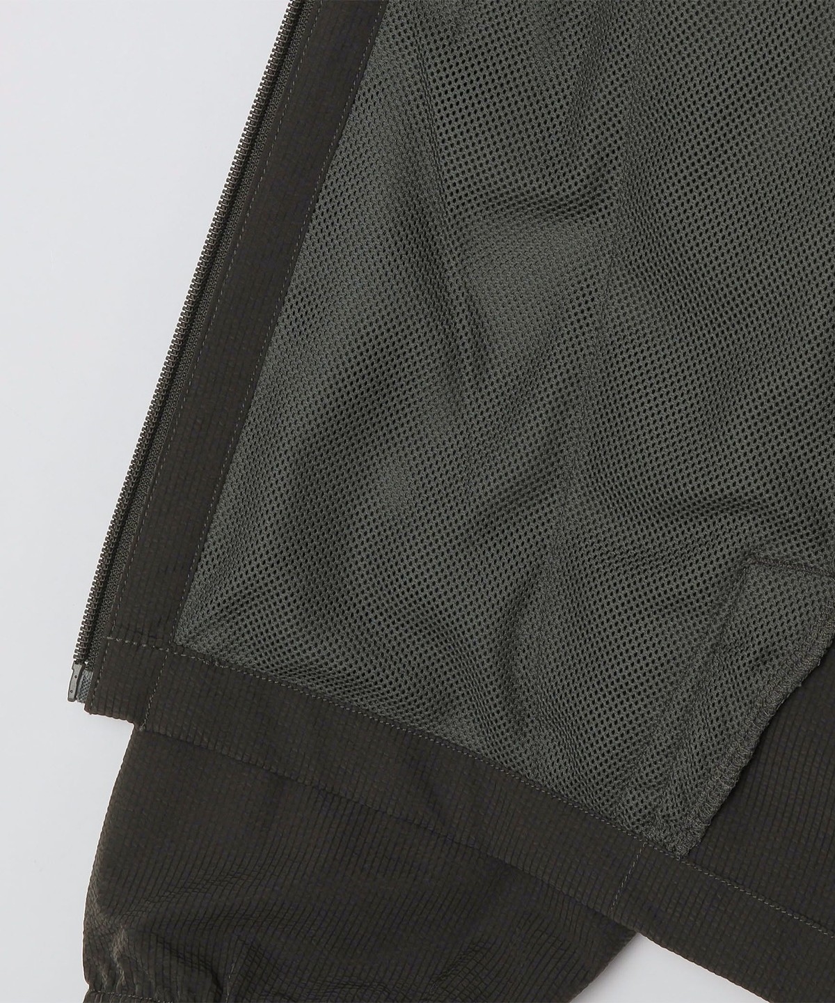 サッカー素材を使用したパーカー型ブルゾン。