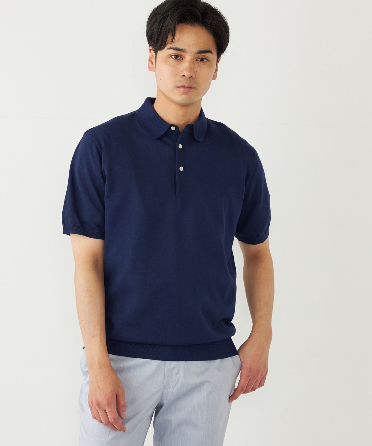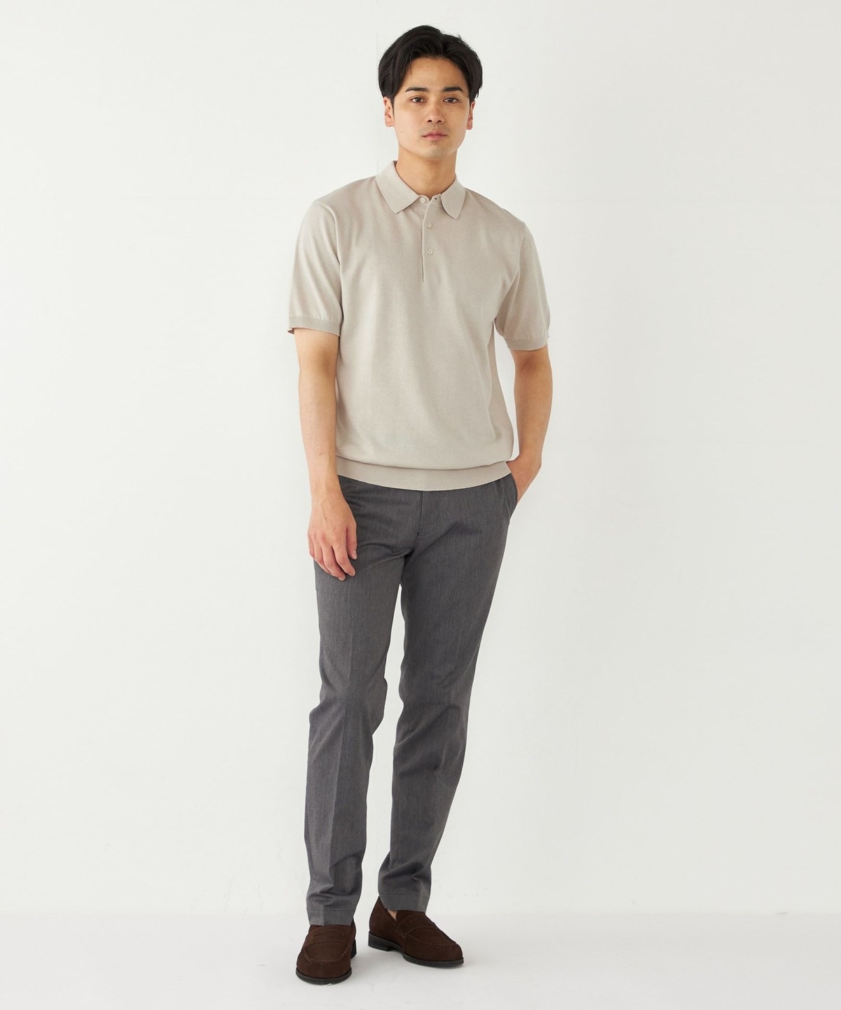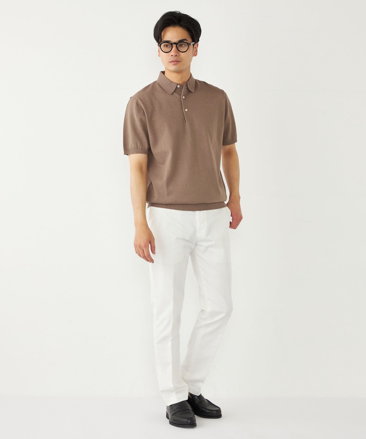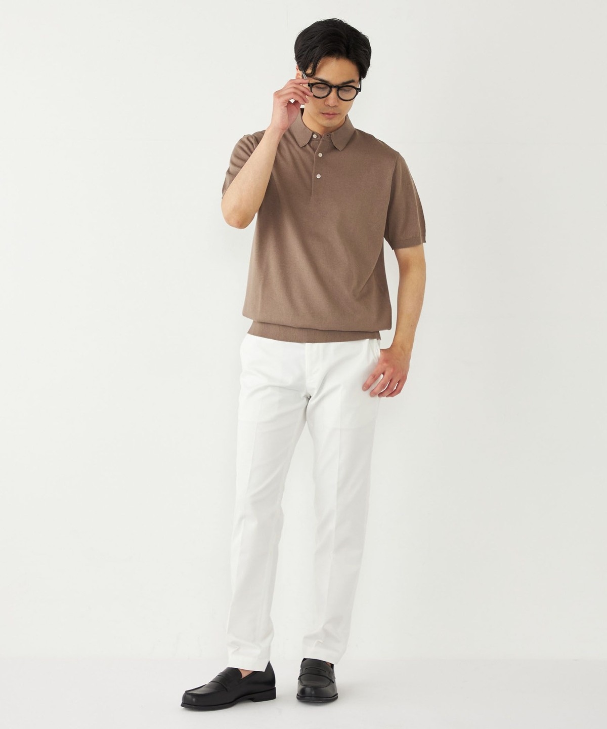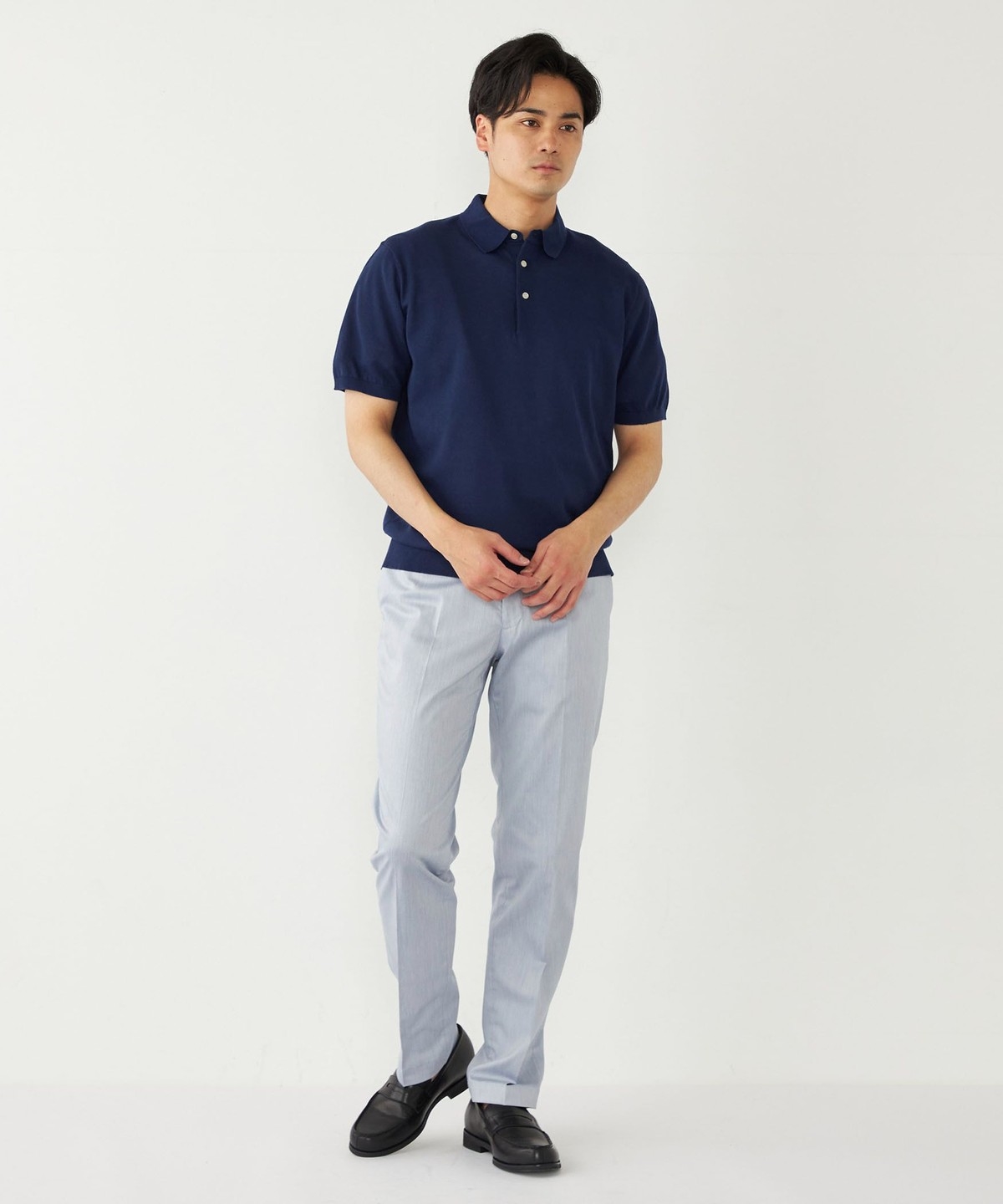 鹿の子素材のポロシャツにくらべ、上品さのあるニットポロはジャケットのインナーにもおすすめです。