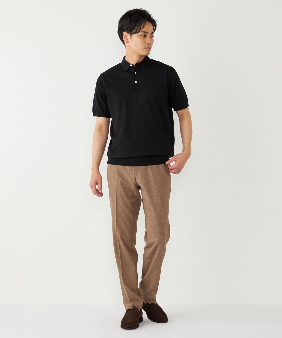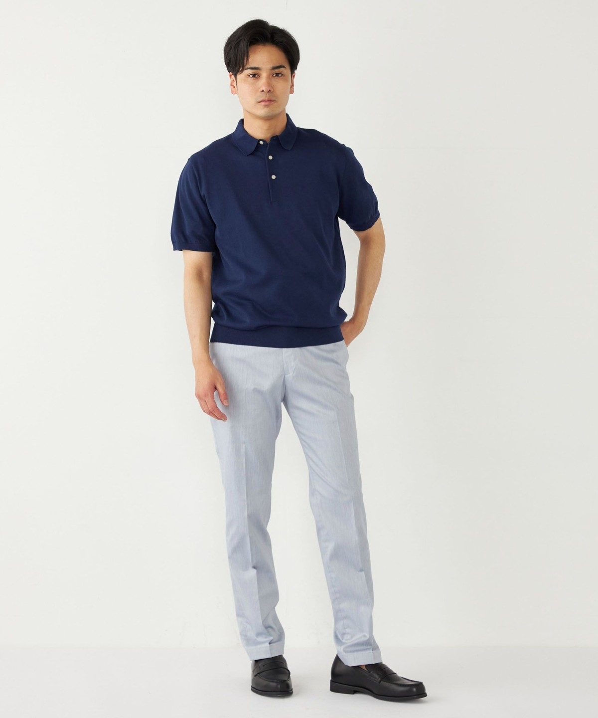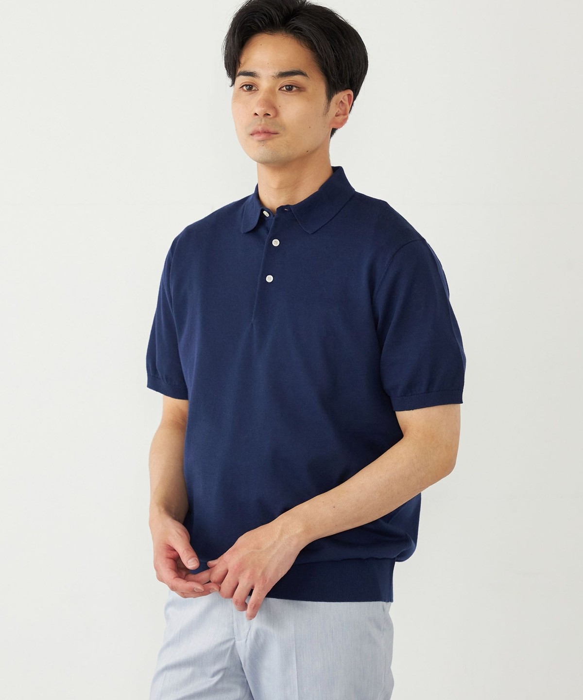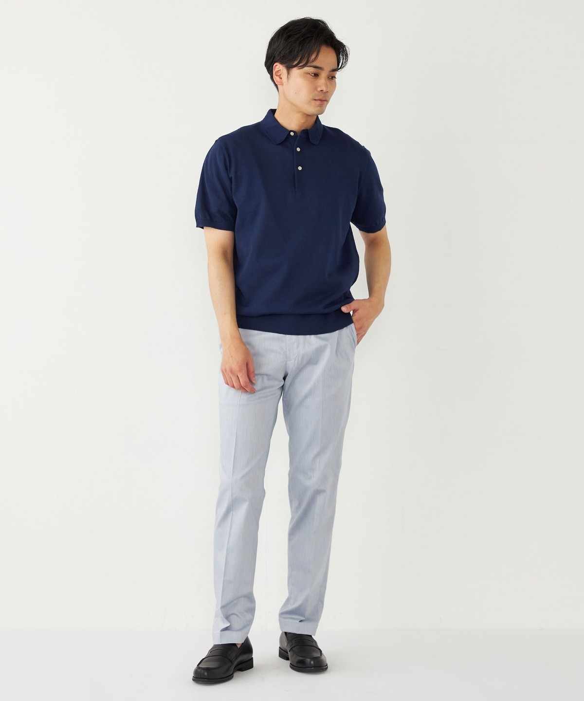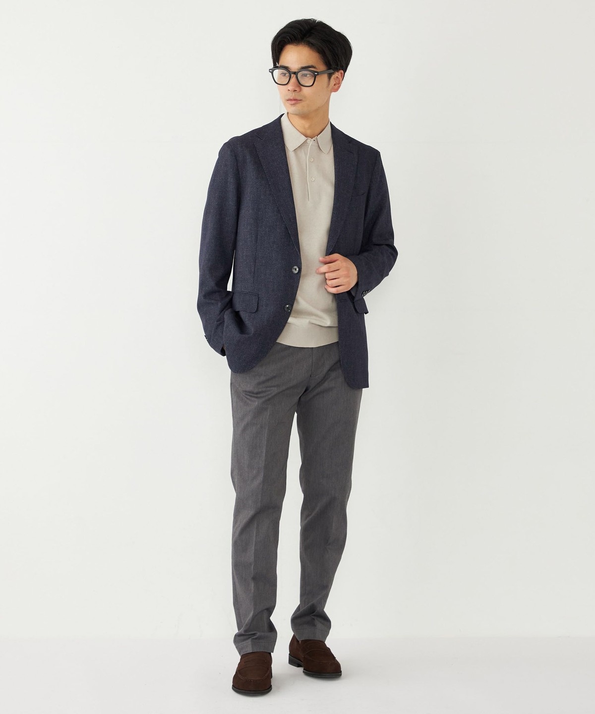 鹿の子素材のポロシャツにくらべ、上品さのあるニットポロはジャケットのインナーにもおすすめです。