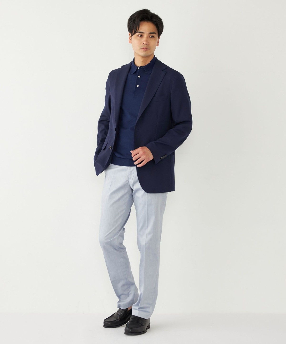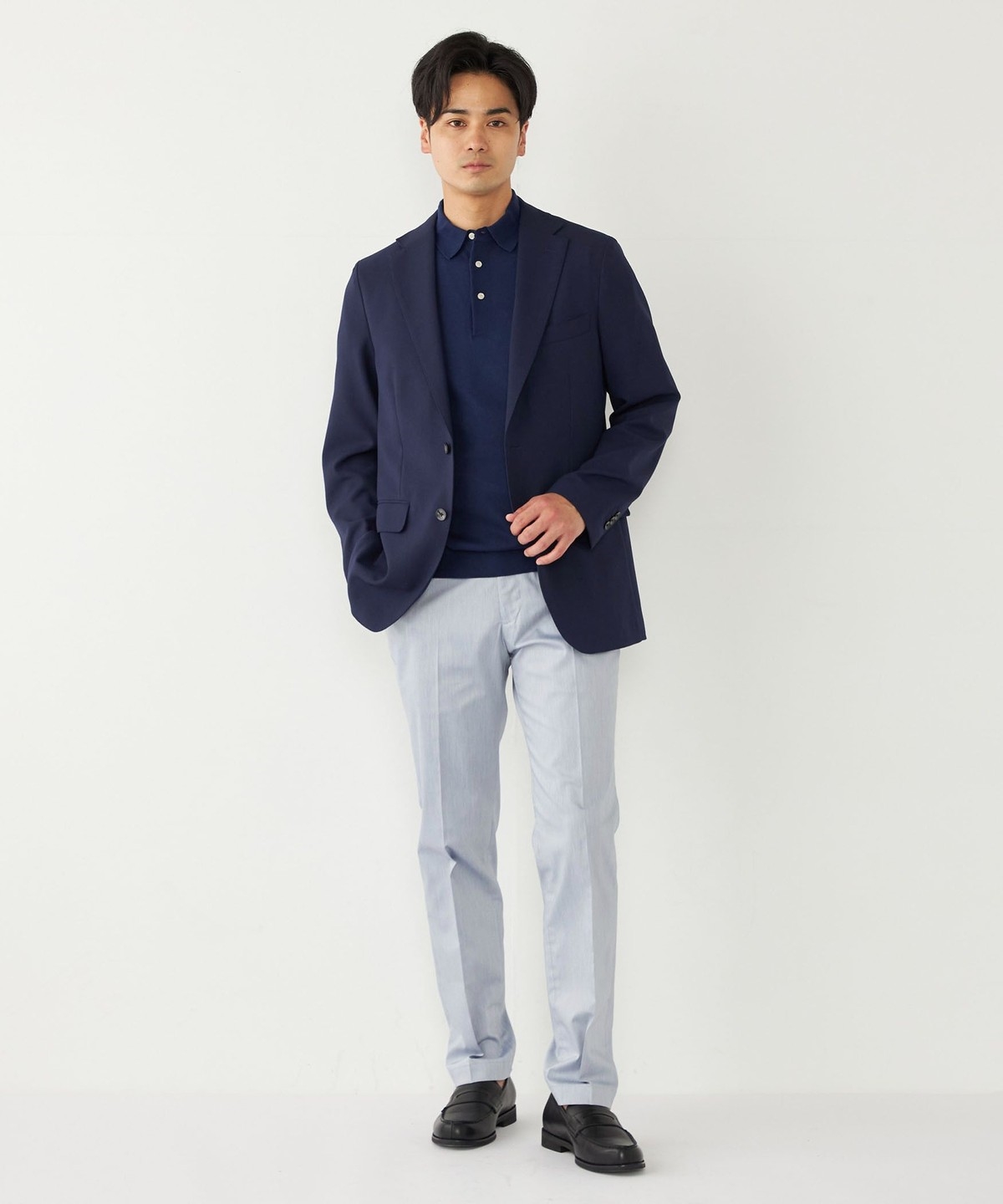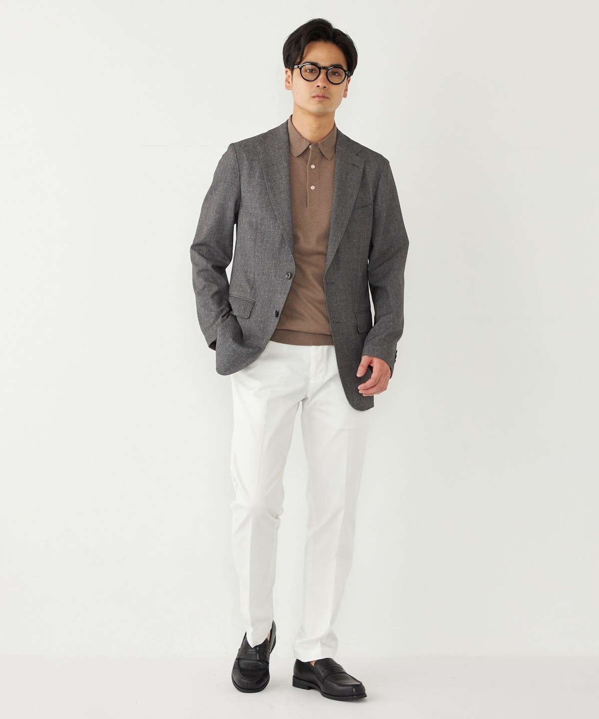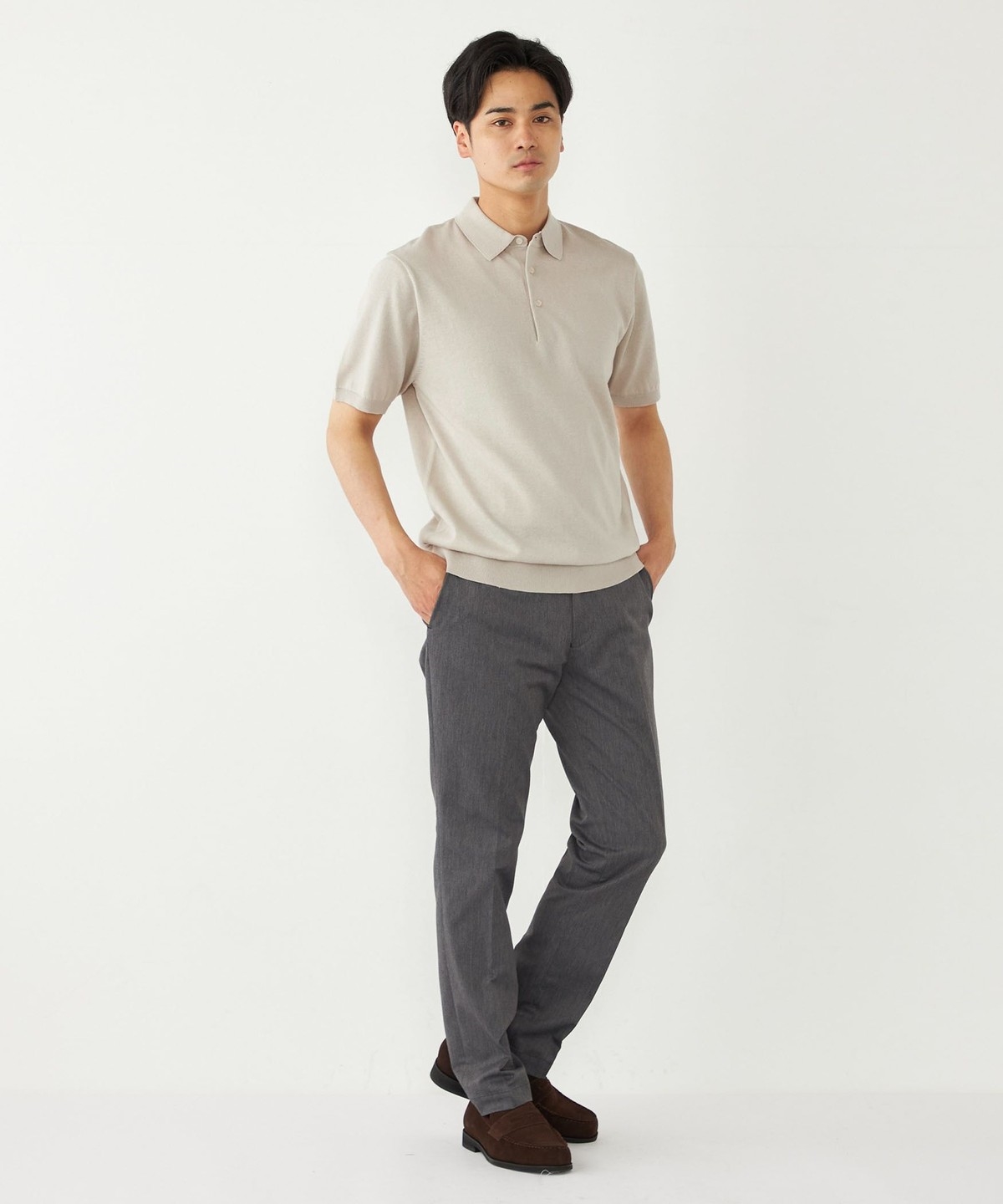 鹿の子素材のポロシャツにくらべ、上品さのあるニットポロはジャケットのインナーにもおすすめです。