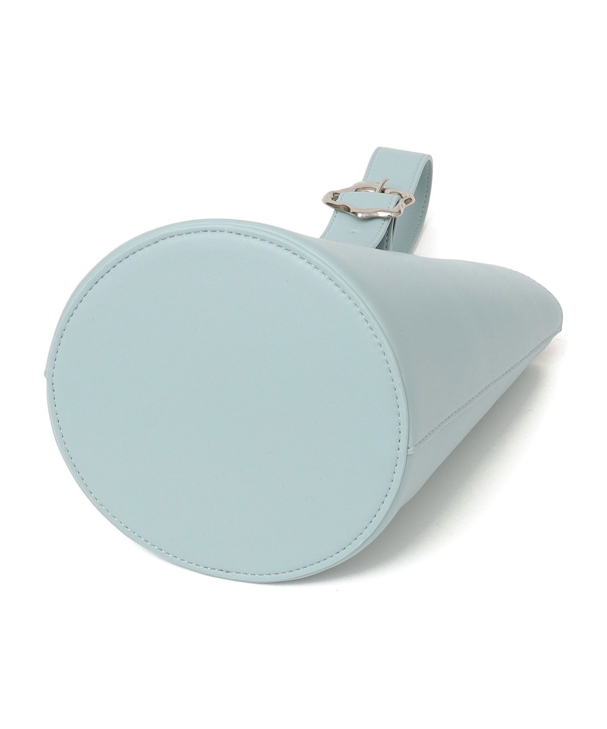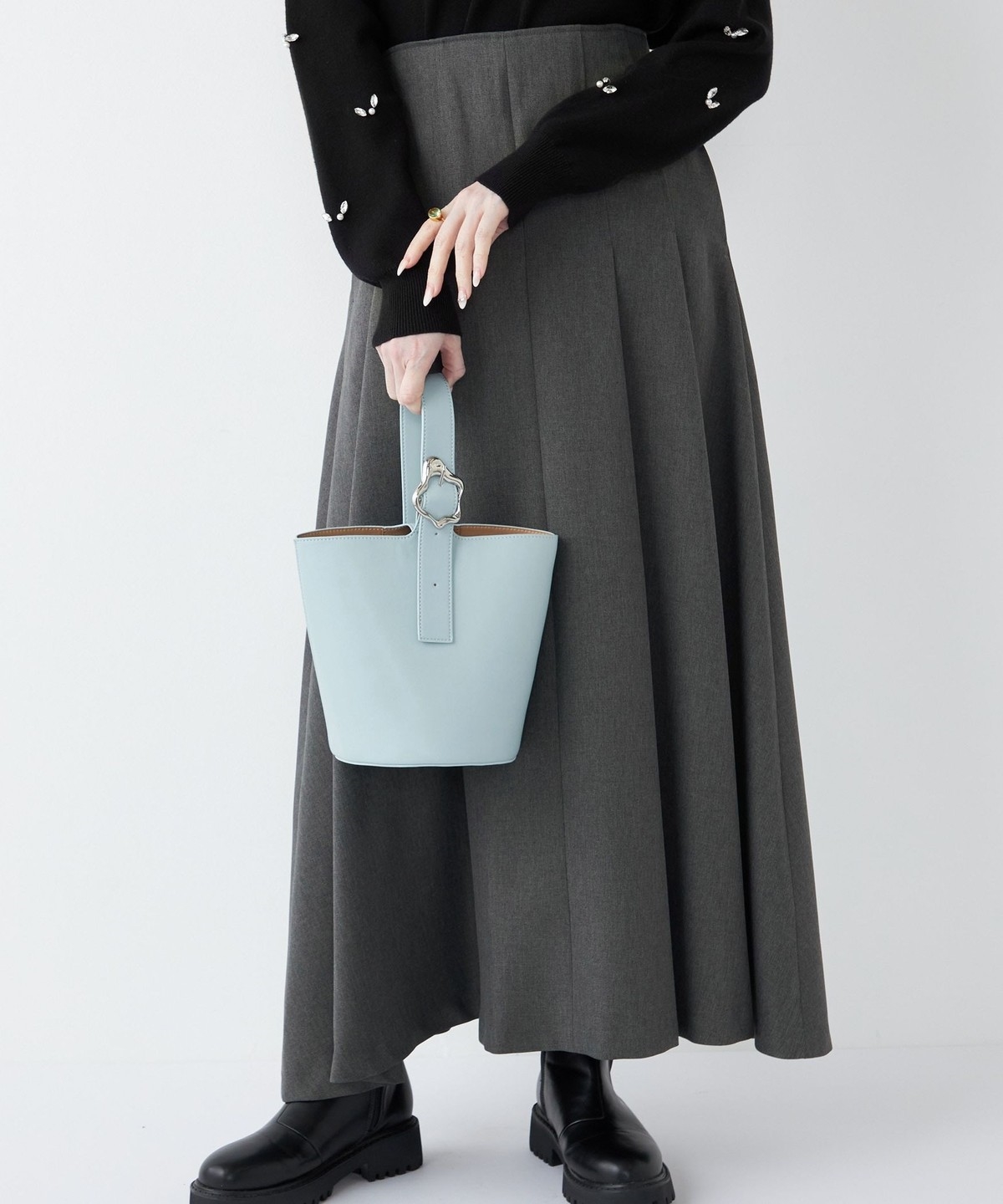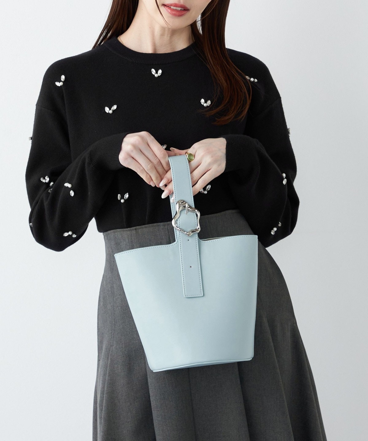 バックルのデザインが目をひくミニサイズのバケットバッグ。