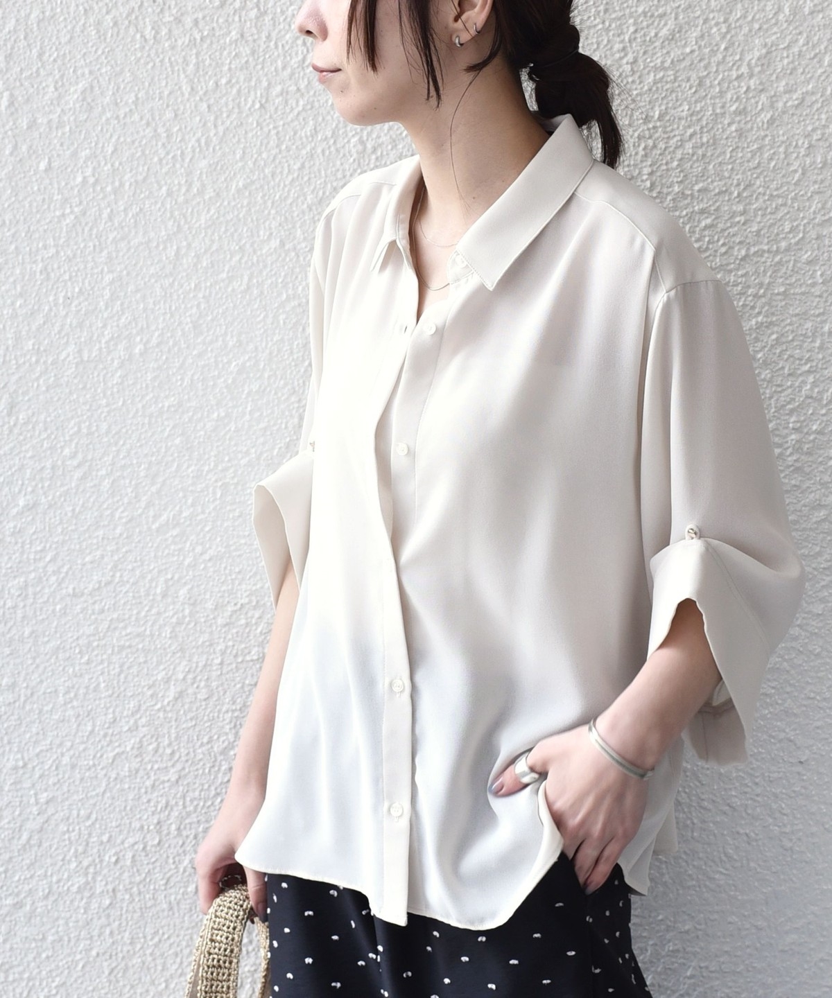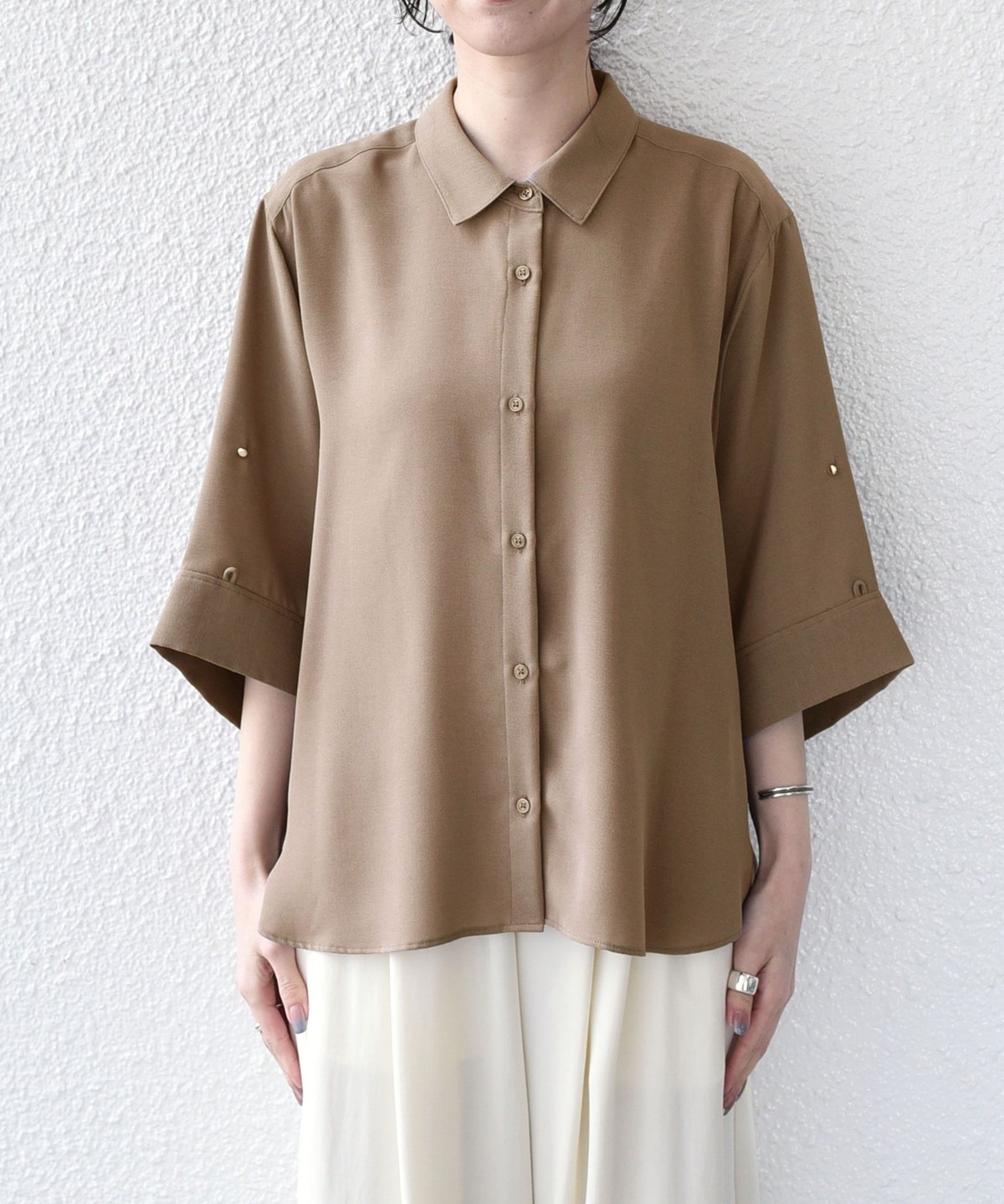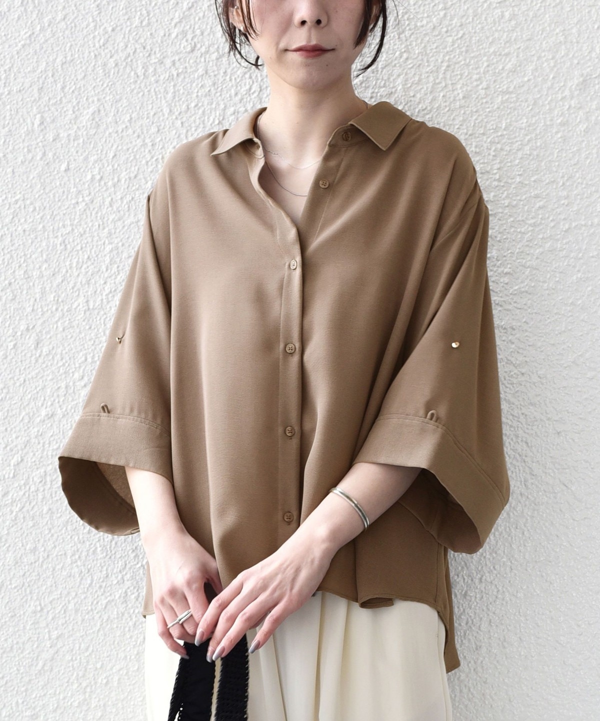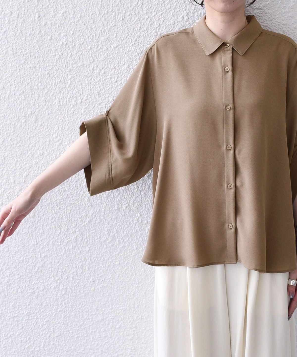袖のアレンジで2WAYの着こなしが楽しめる、とろみ素材のシャツ。