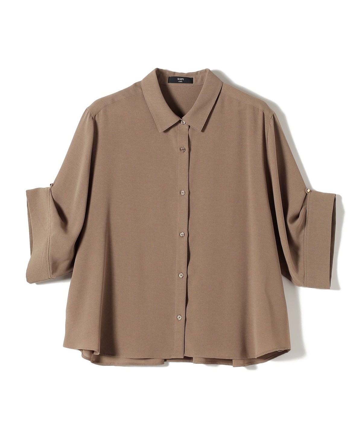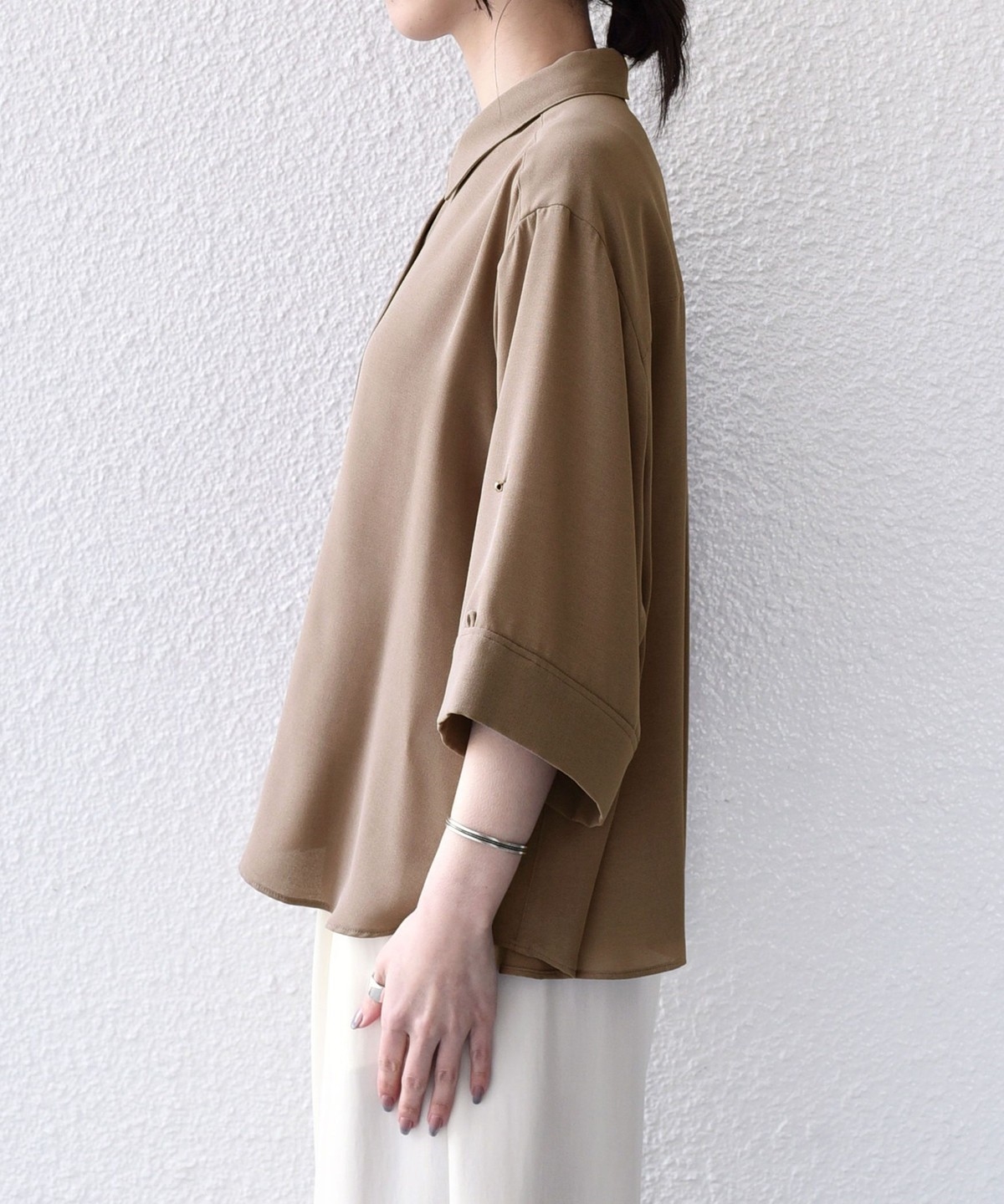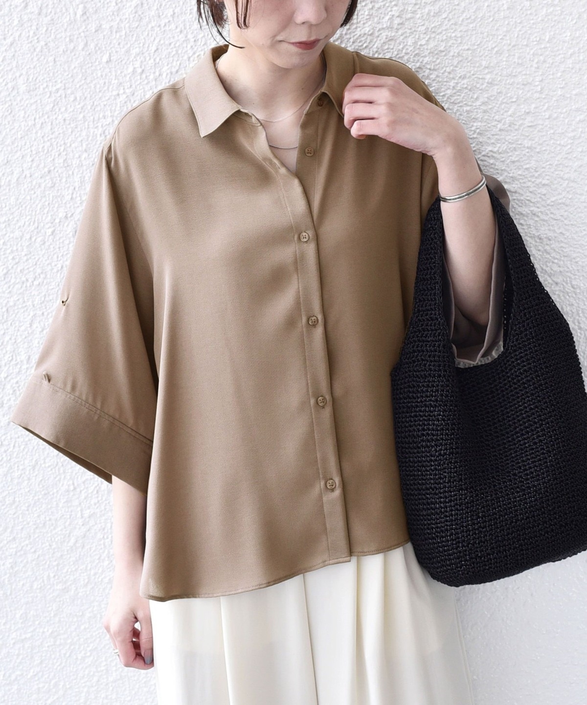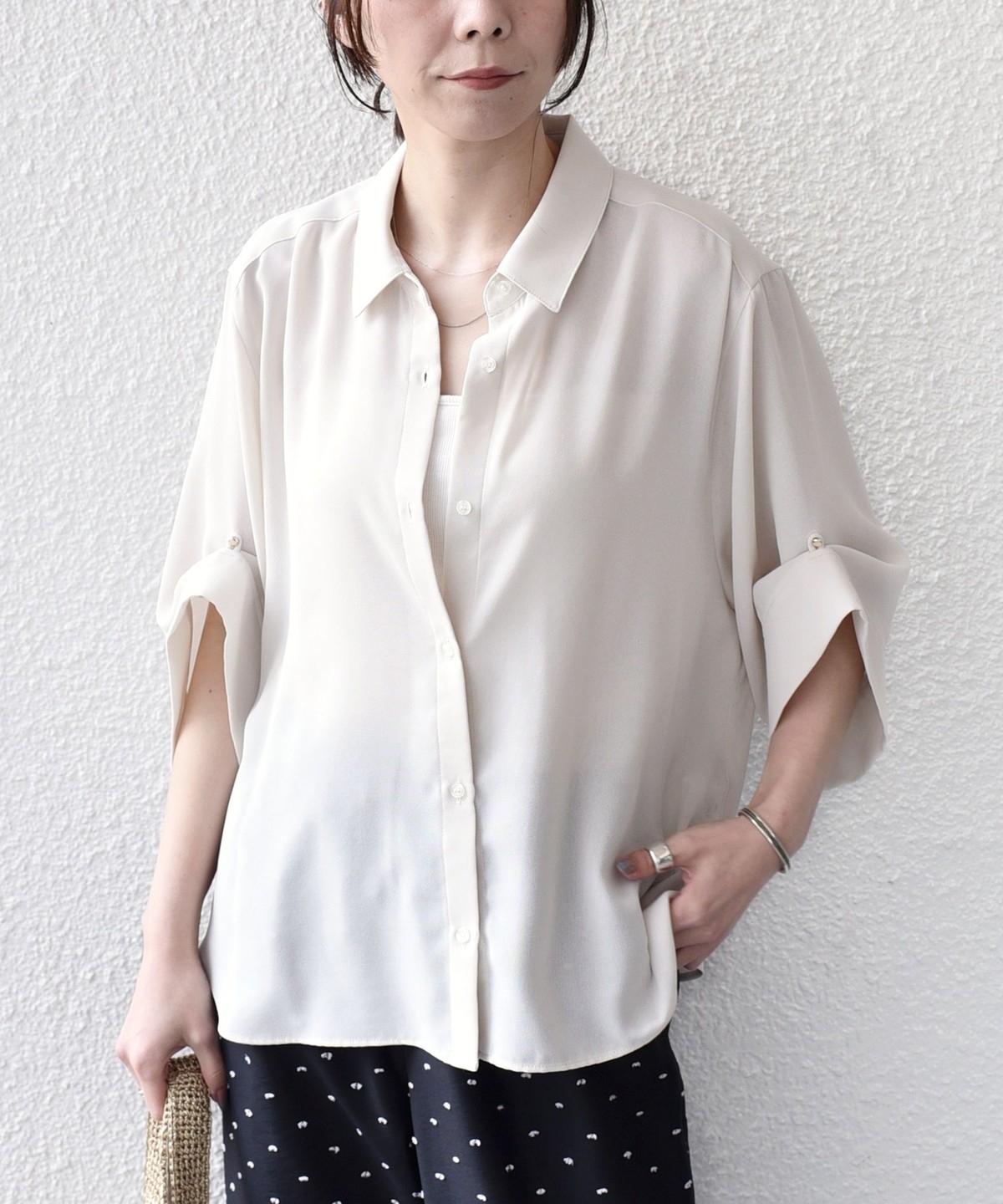 袖のアレンジで2WAYの着こなしが楽しめる、とろみ素材のシャツ。