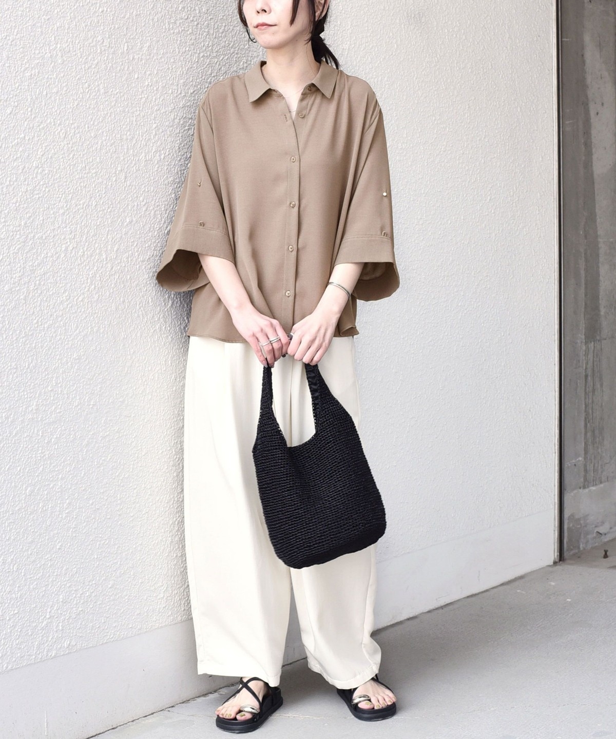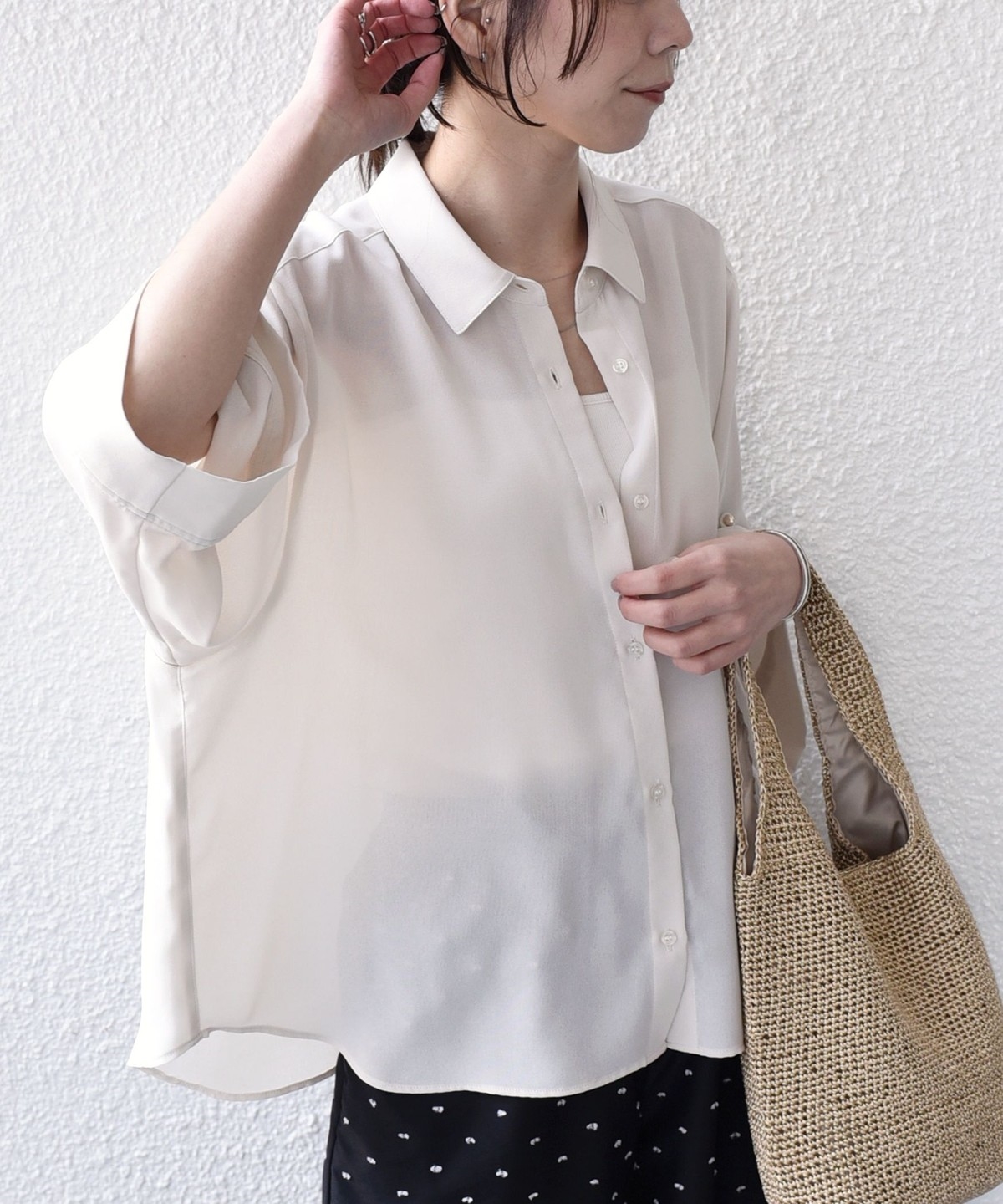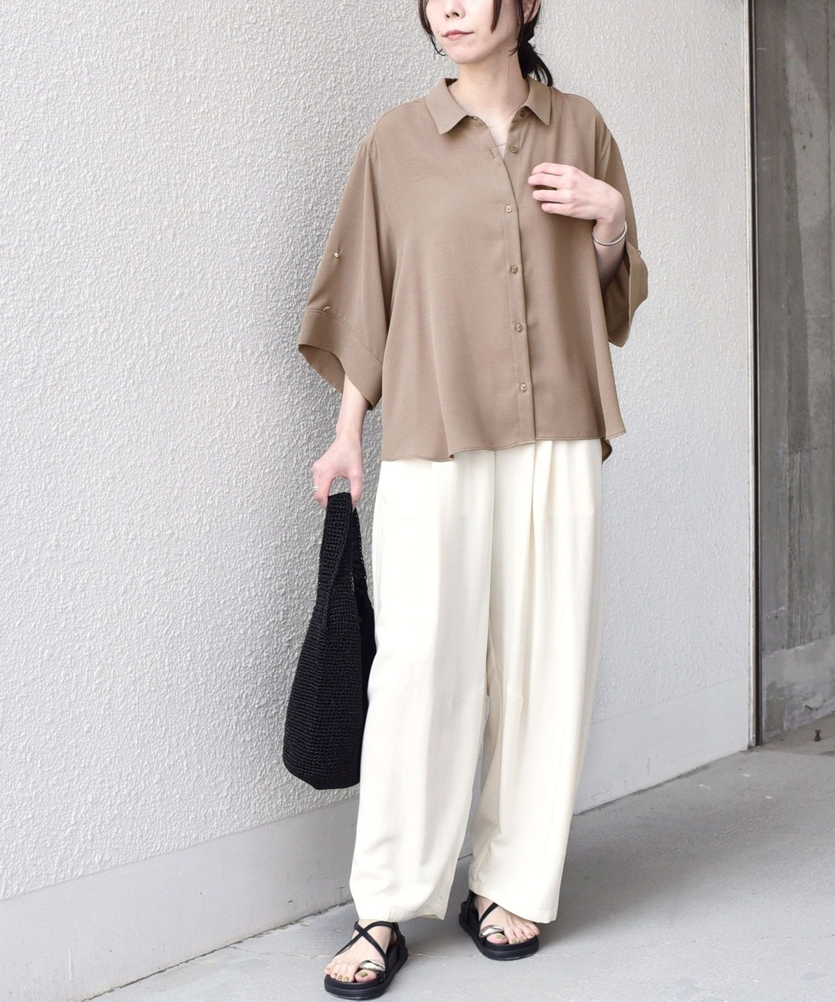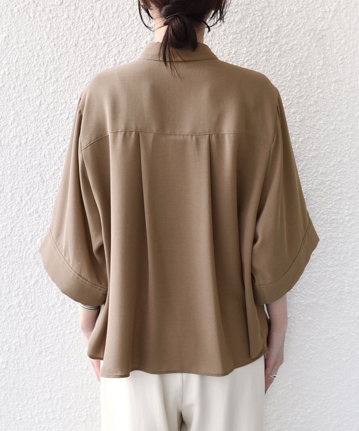 袖のアレンジで2WAYの着こなしが楽しめる、とろみ素材のシャツ。