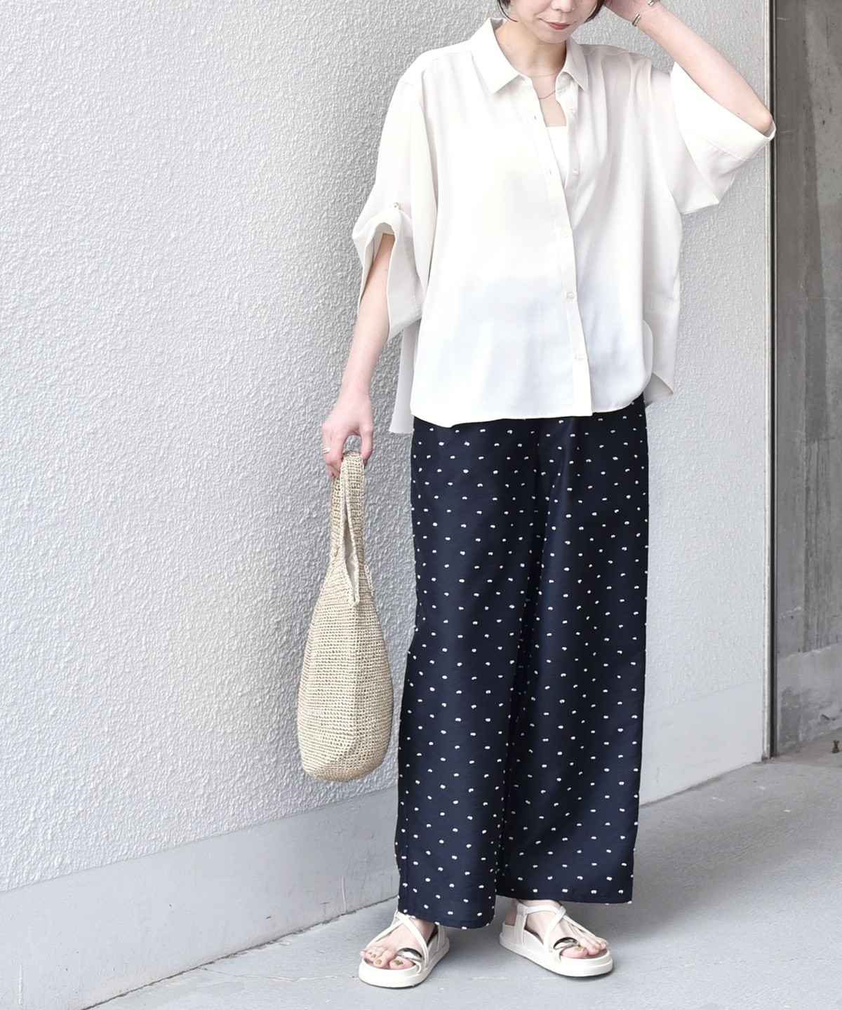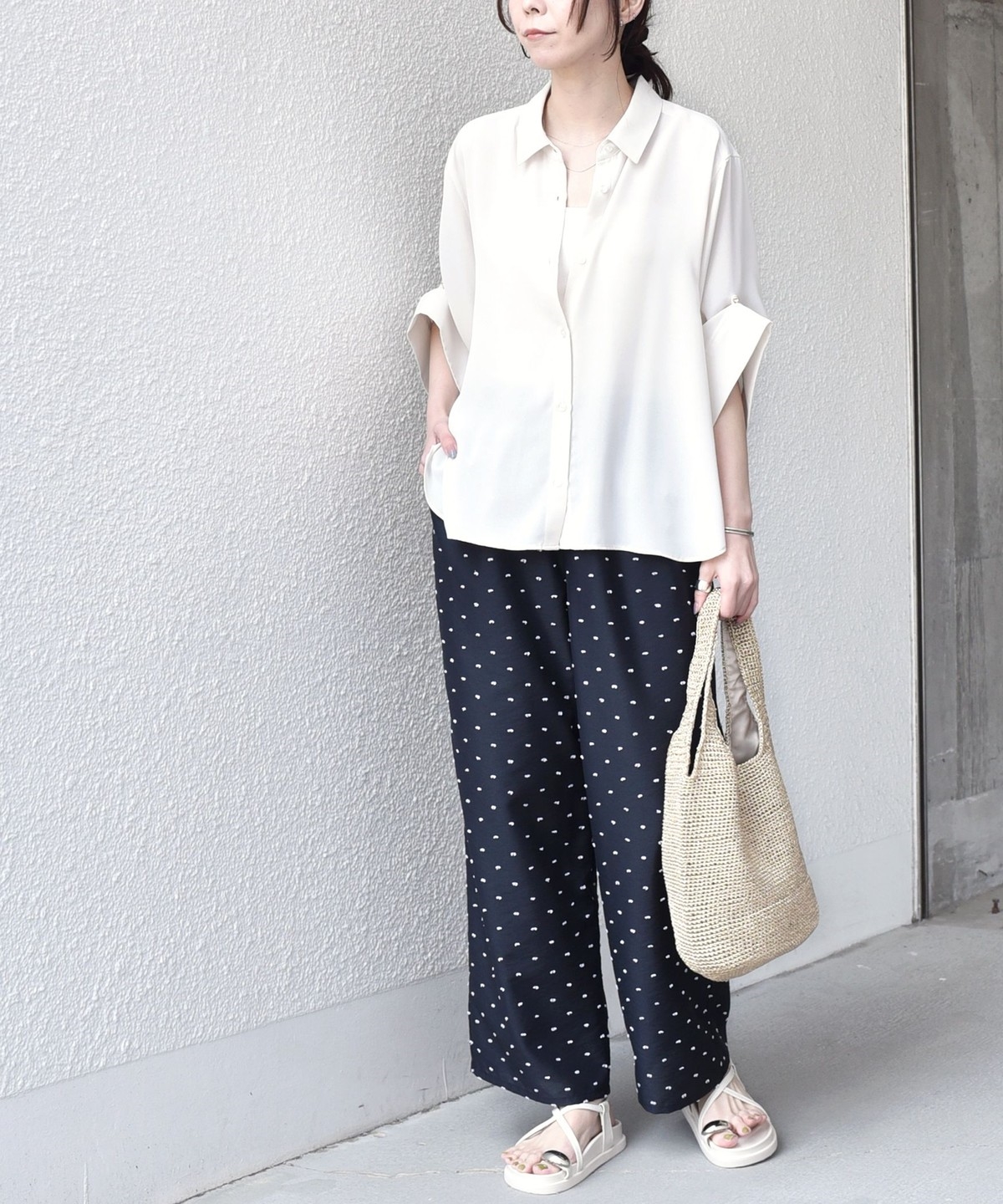 イージーパンツと合わせた、ラフさの中に上品さのあるスタイルがおすすめ。