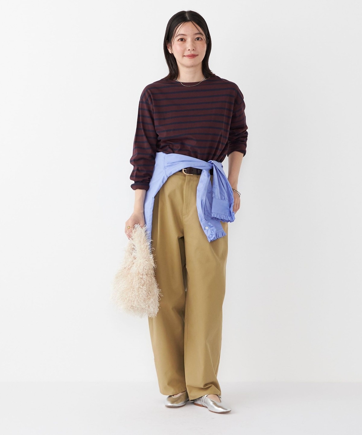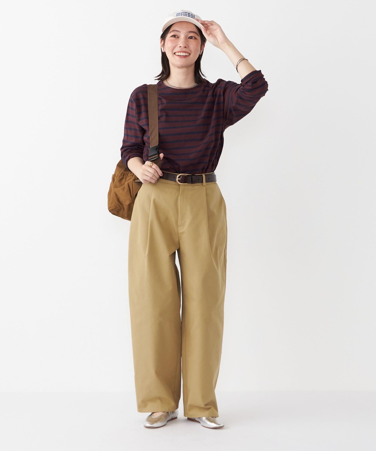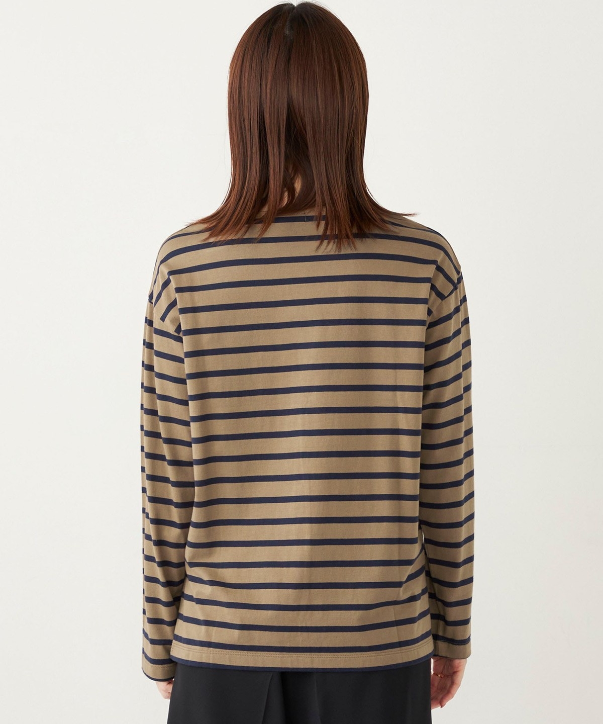 綺麗なツヤのある綿素材を使用し、首回りもボートネックのすっきりとした印象で、女性らしいカジュアルスタイルを演出します。