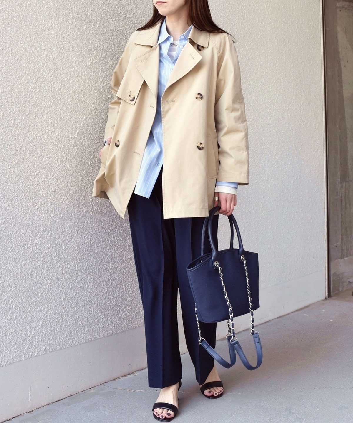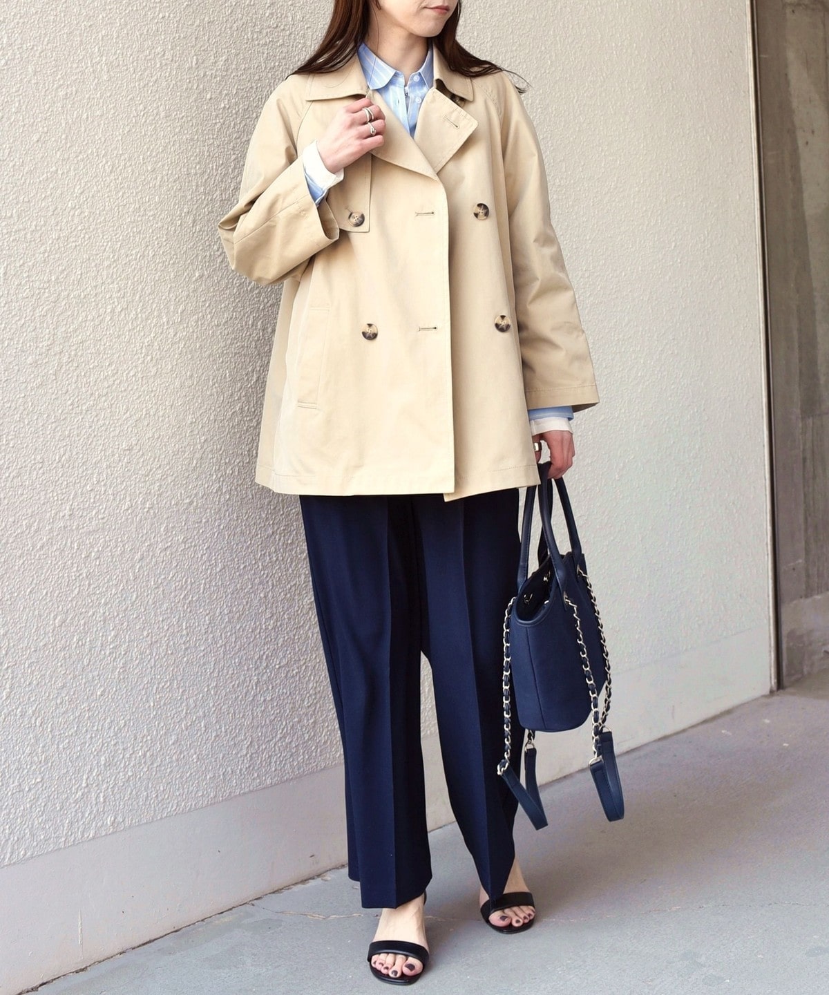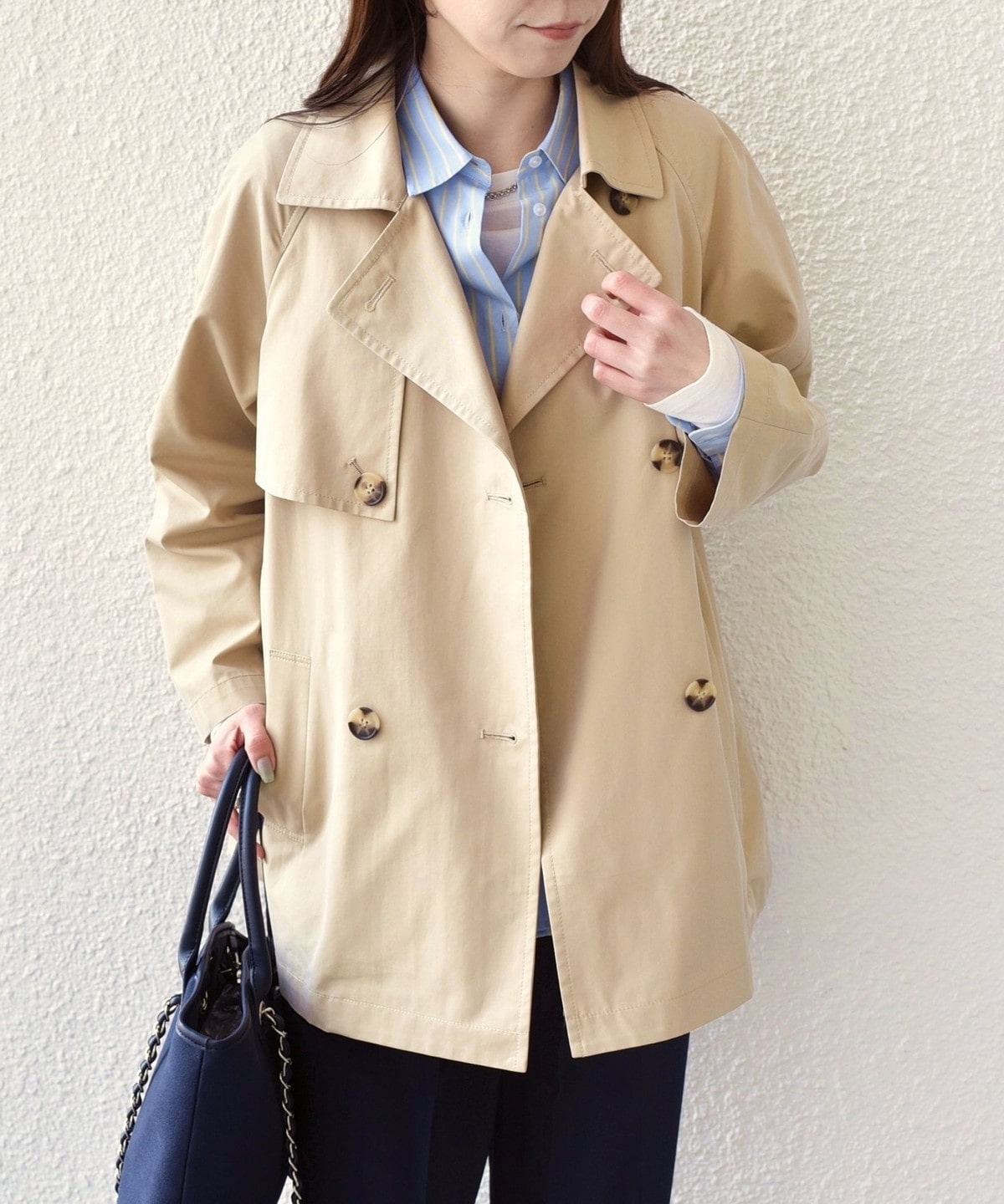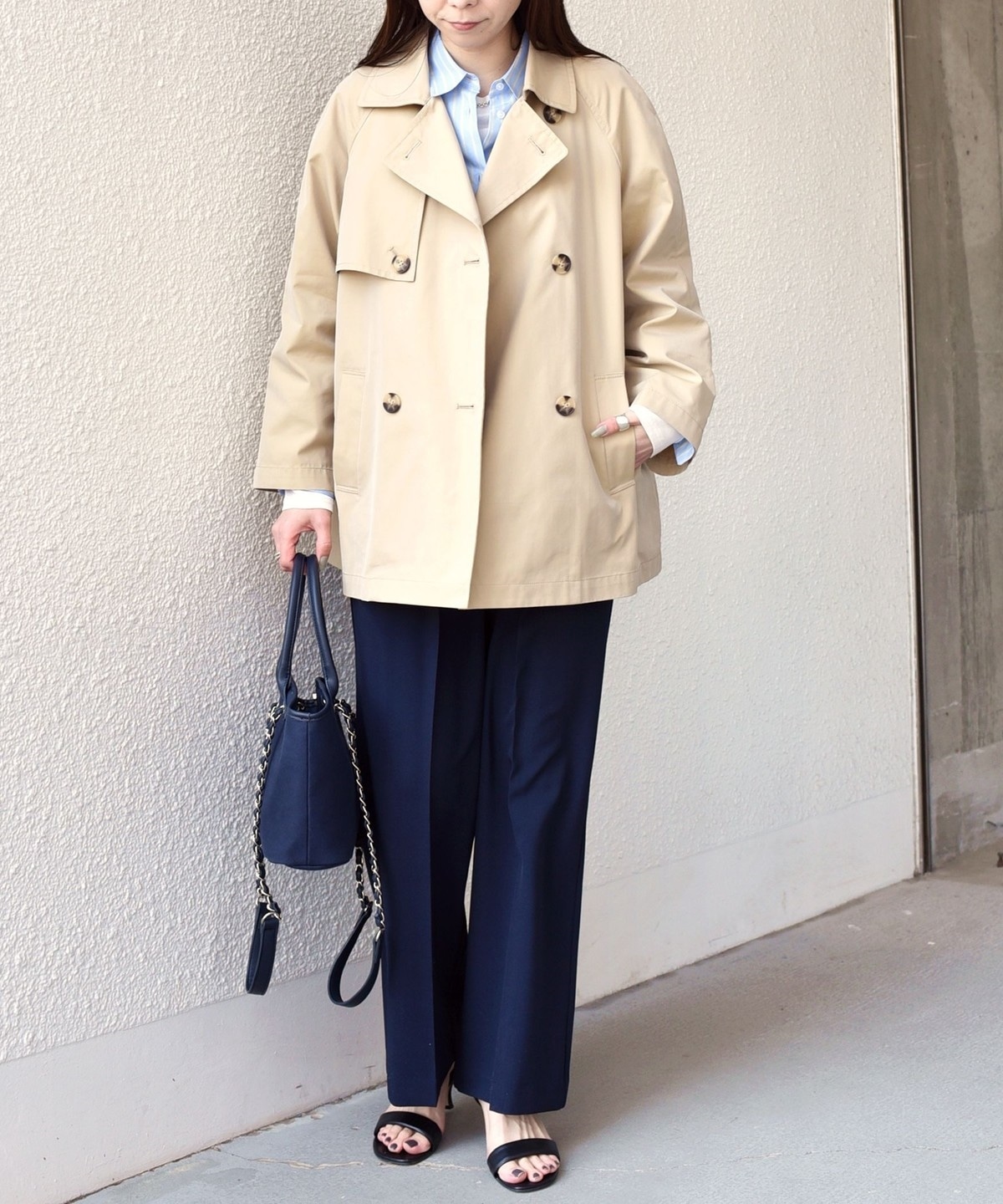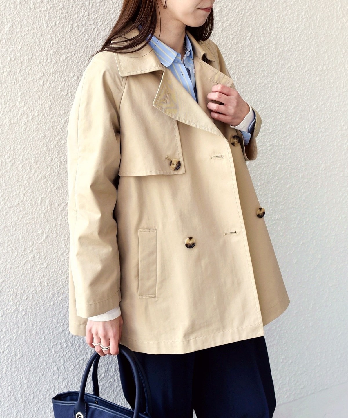 ややオーバーなシルエットで、ショート丈のトレンチコート。