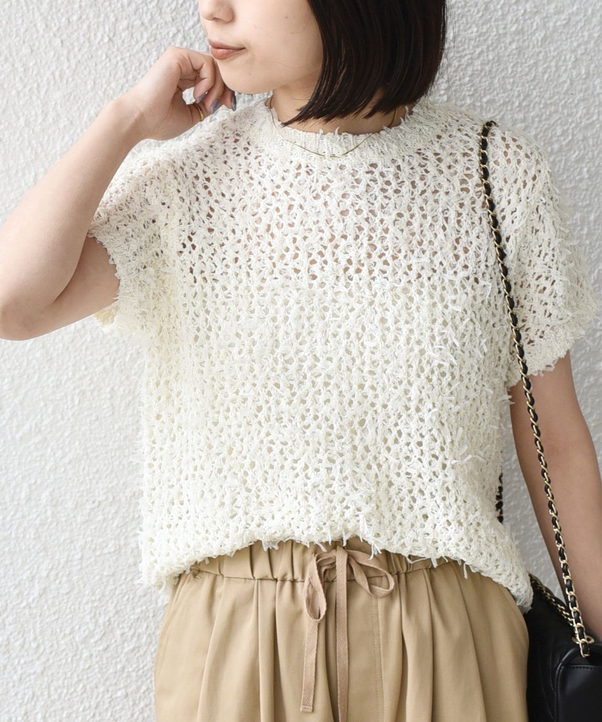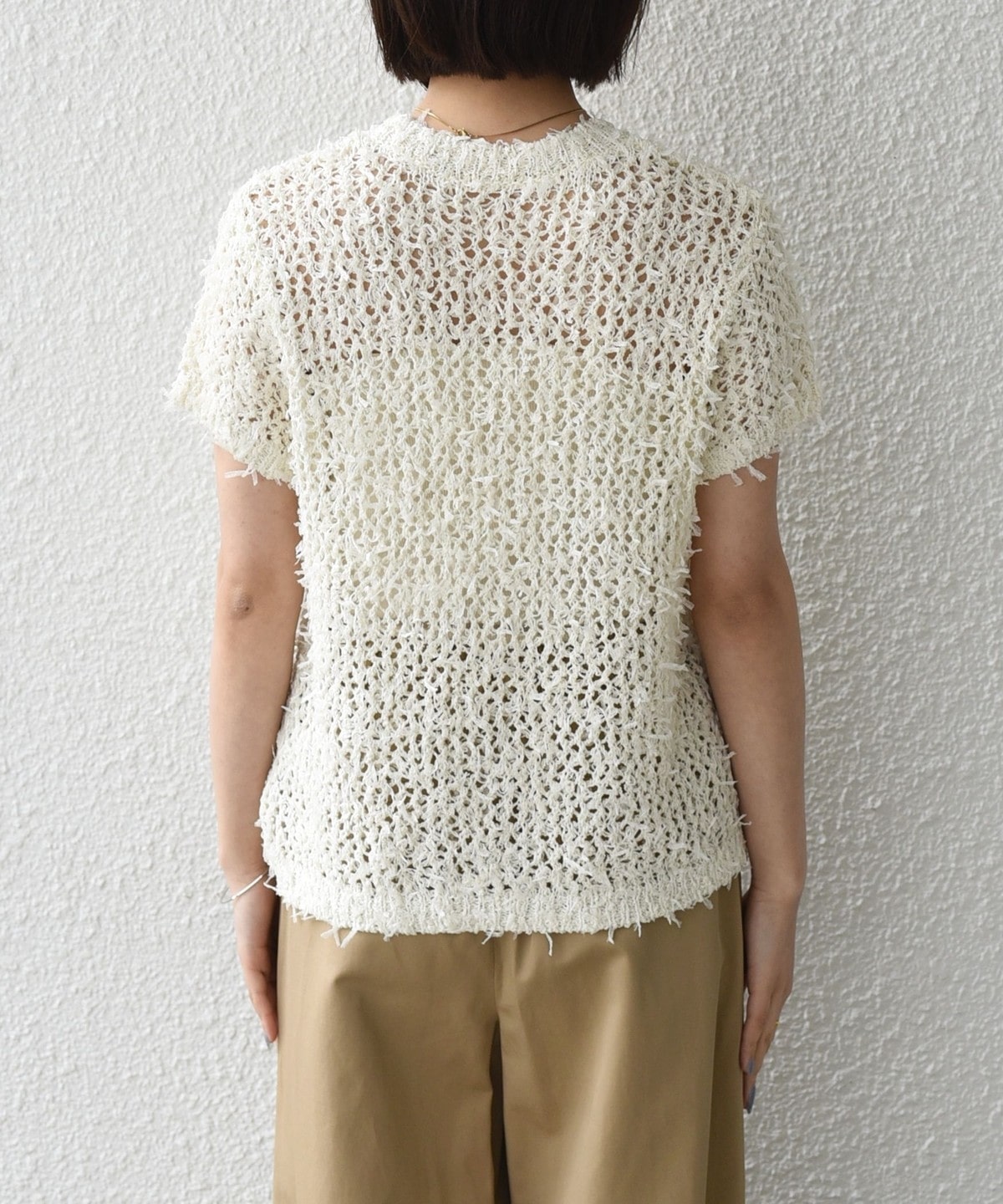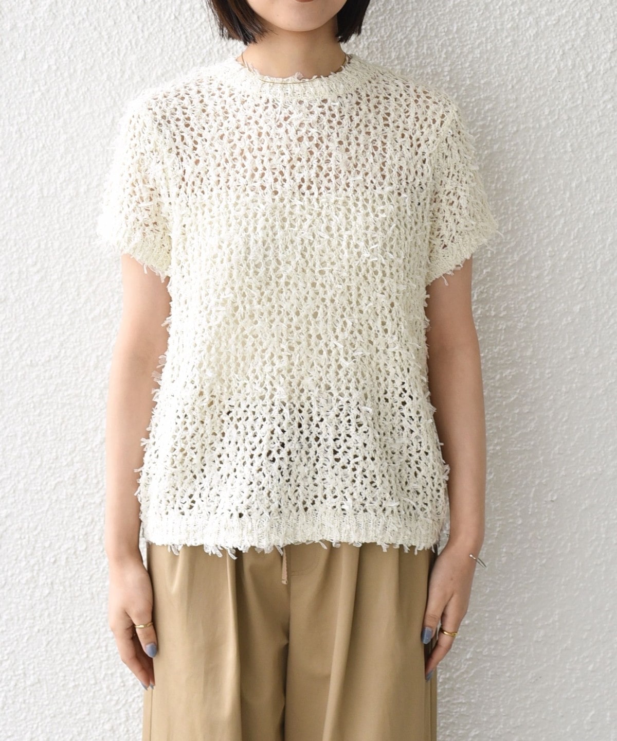 チュールテープを引きそろえた、表情豊かな編地が目を惹くサマーニット。
