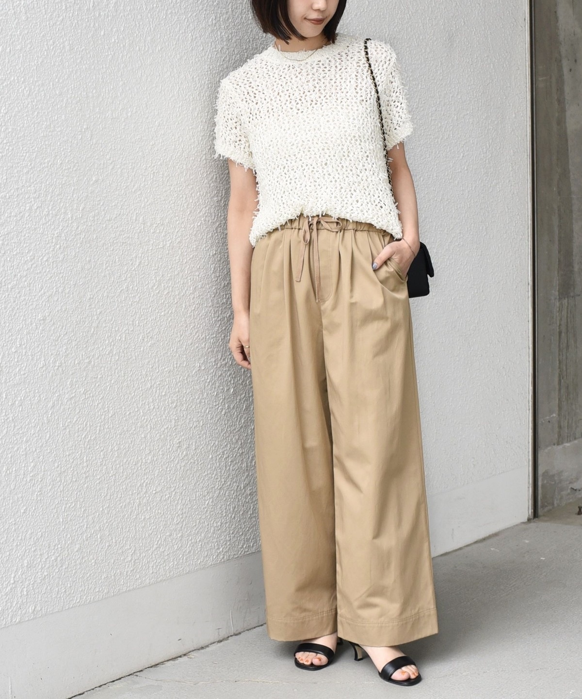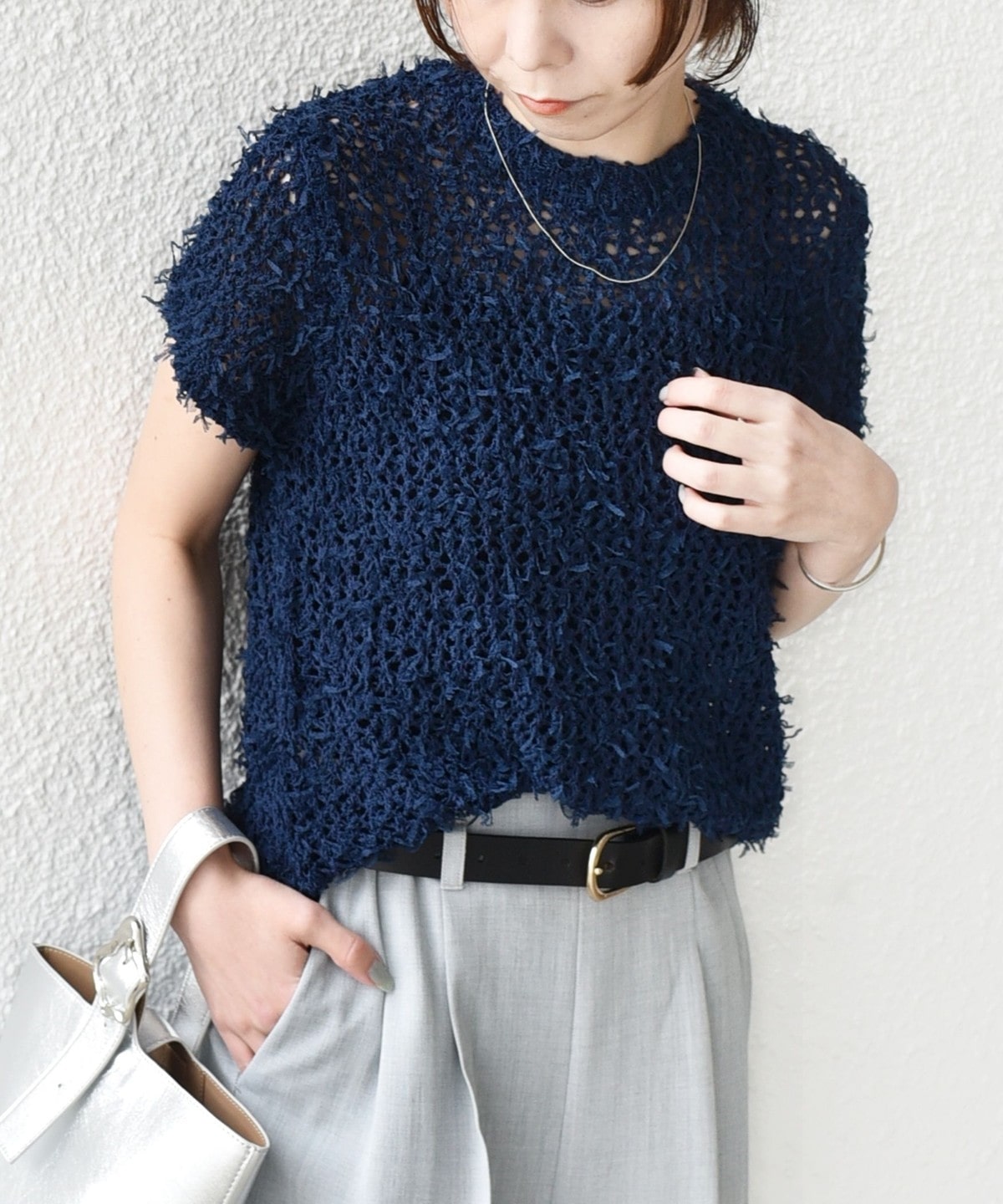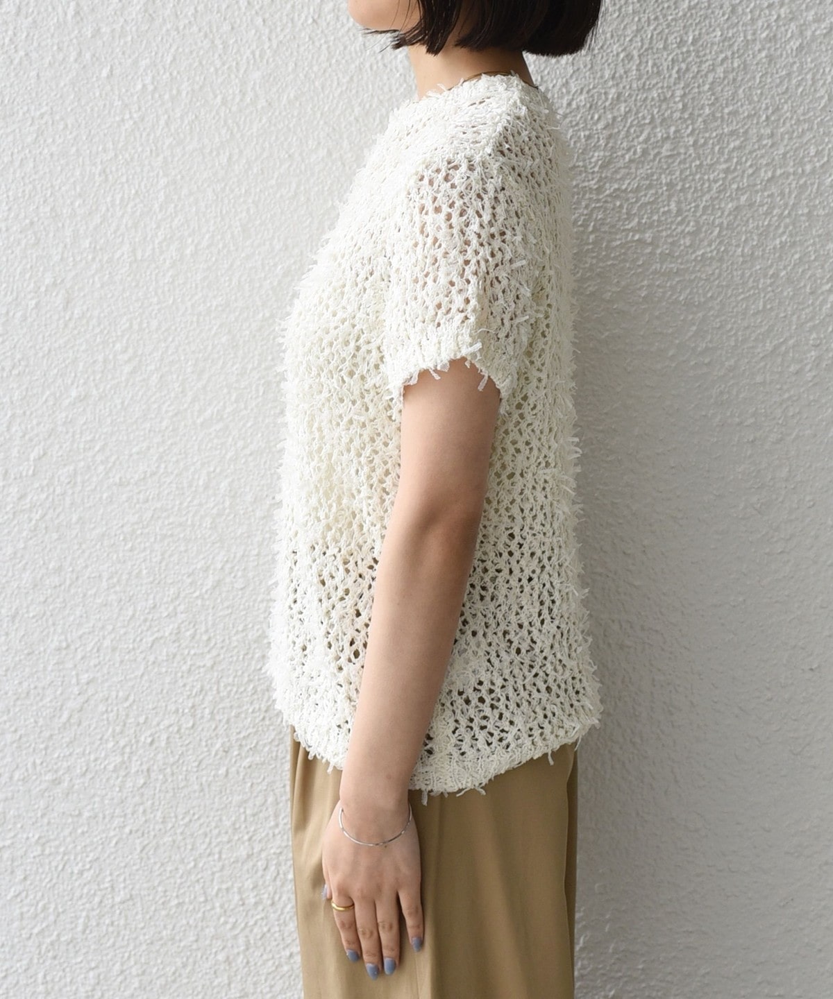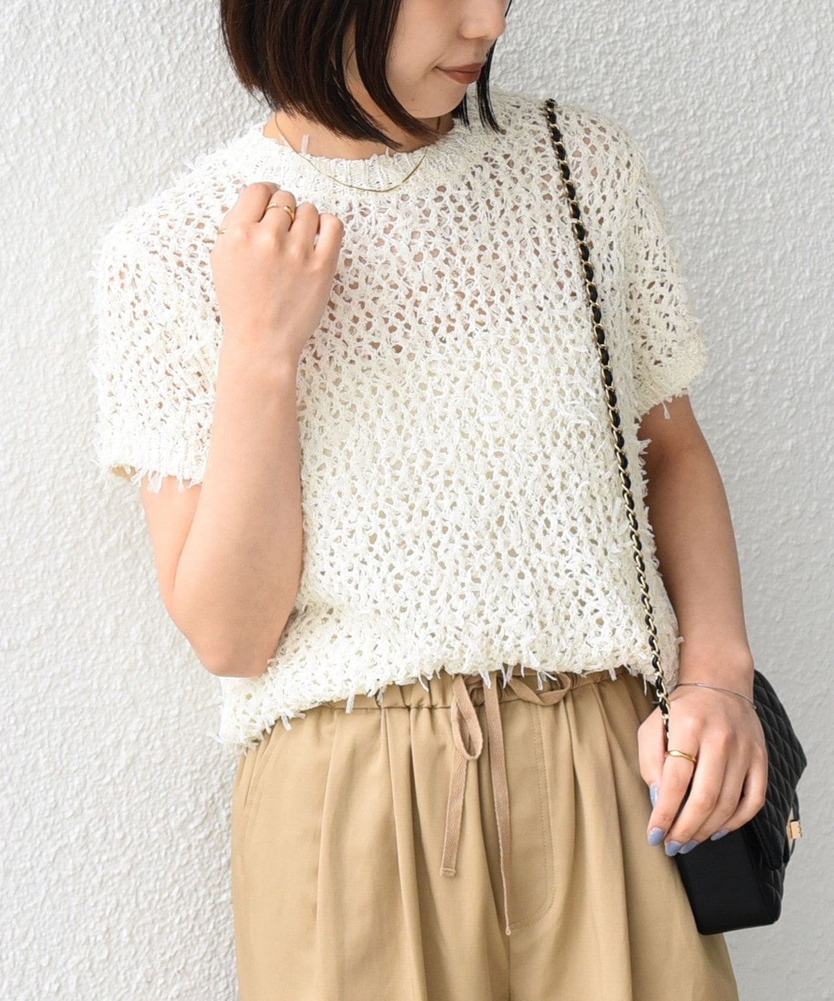 チュールテープを引きそろえた、表情豊かな編地が目を惹くサマーニット。