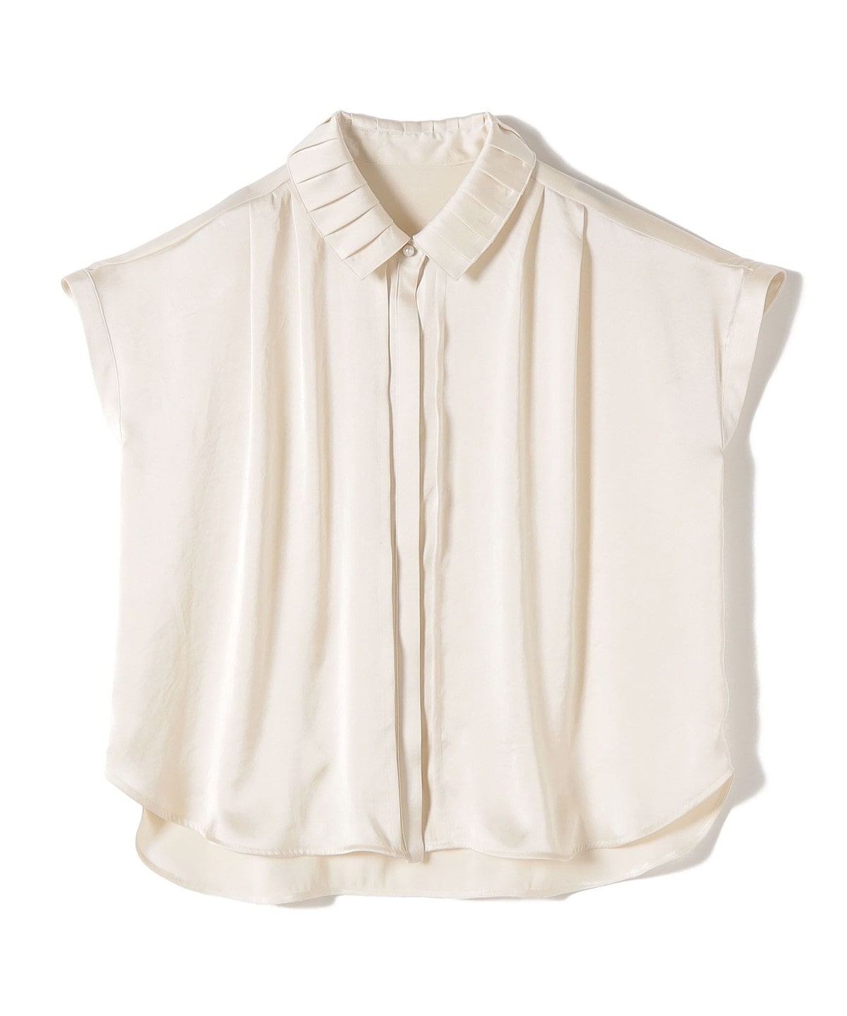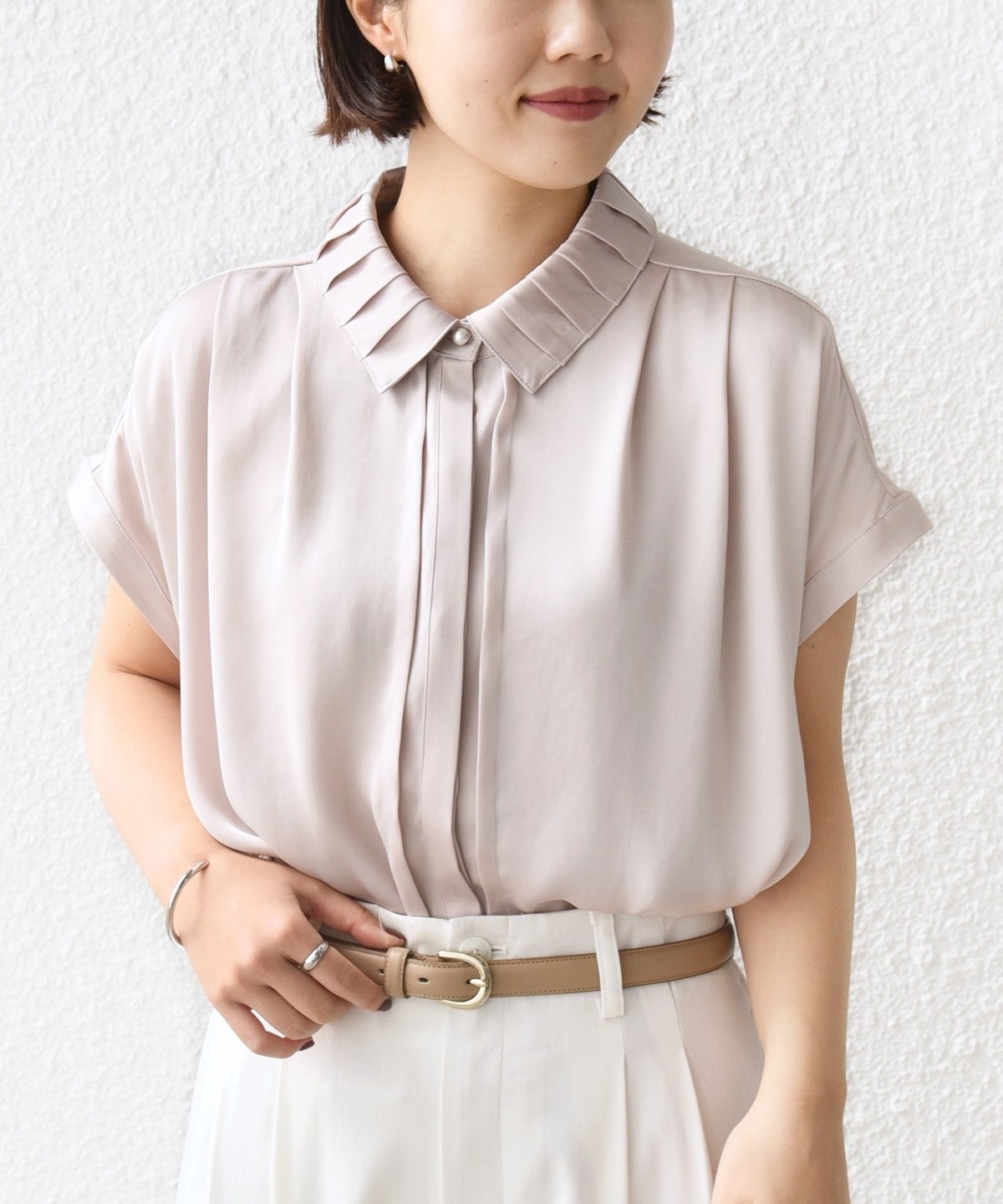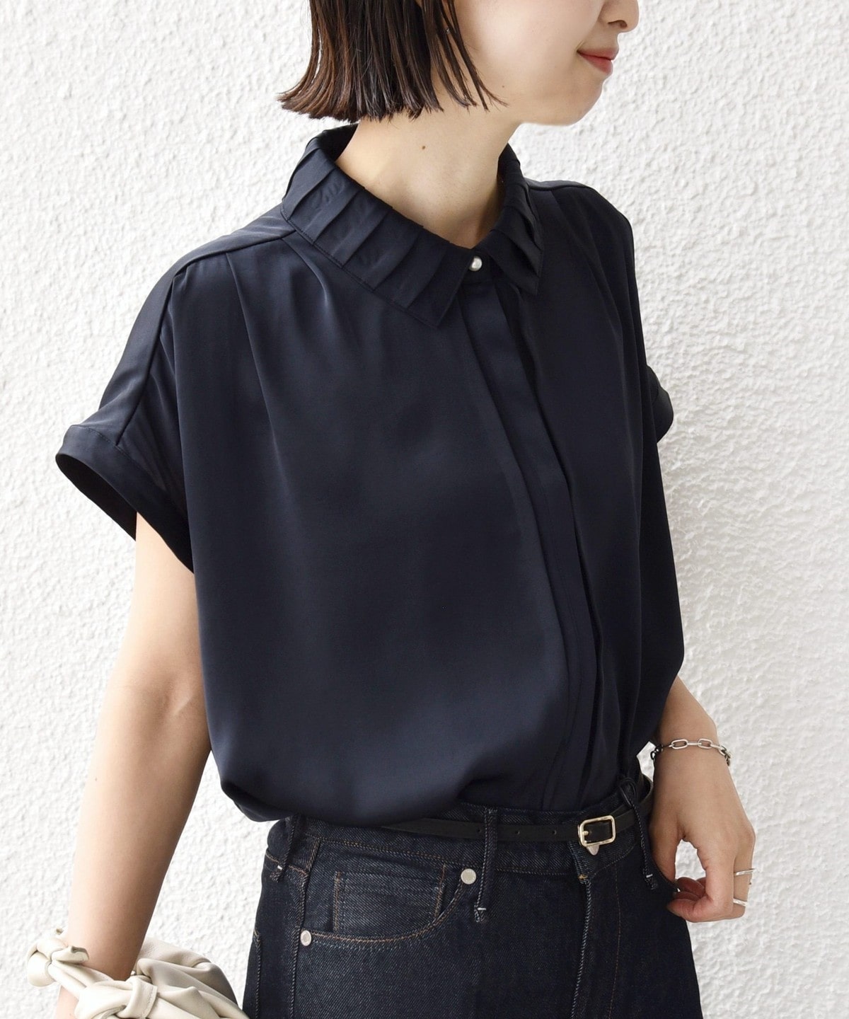 繊細なタックプリーツを施した襟が特徴的なデザインブラウス。