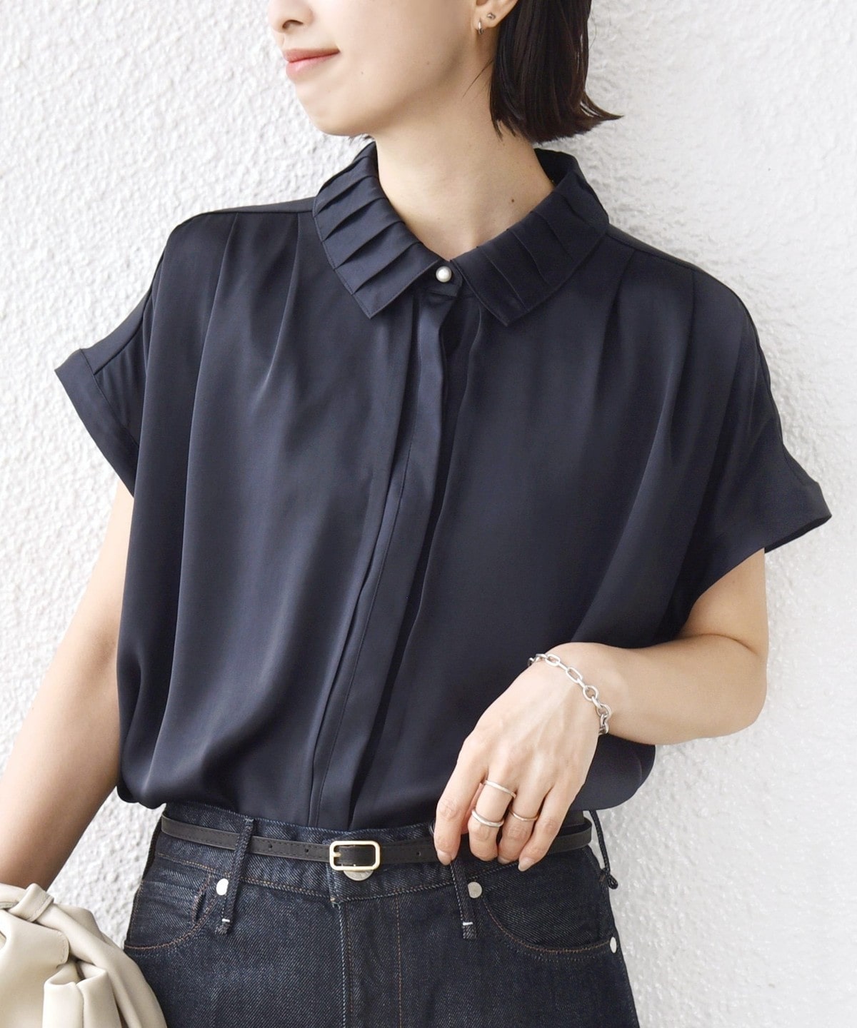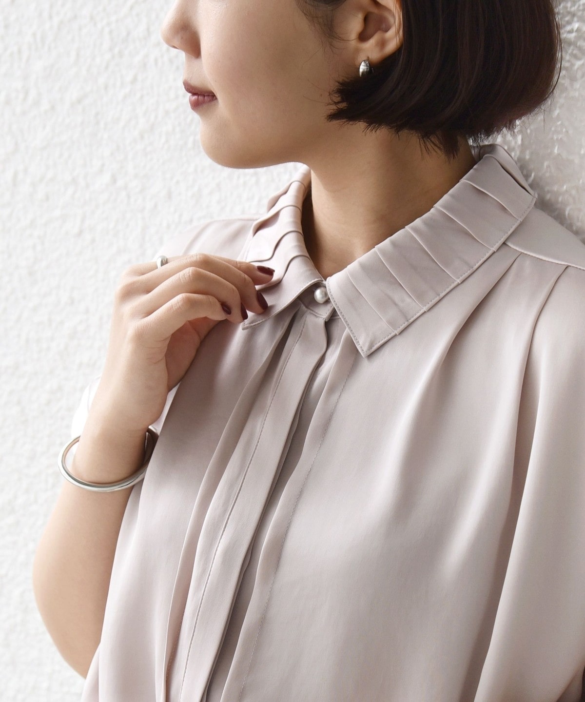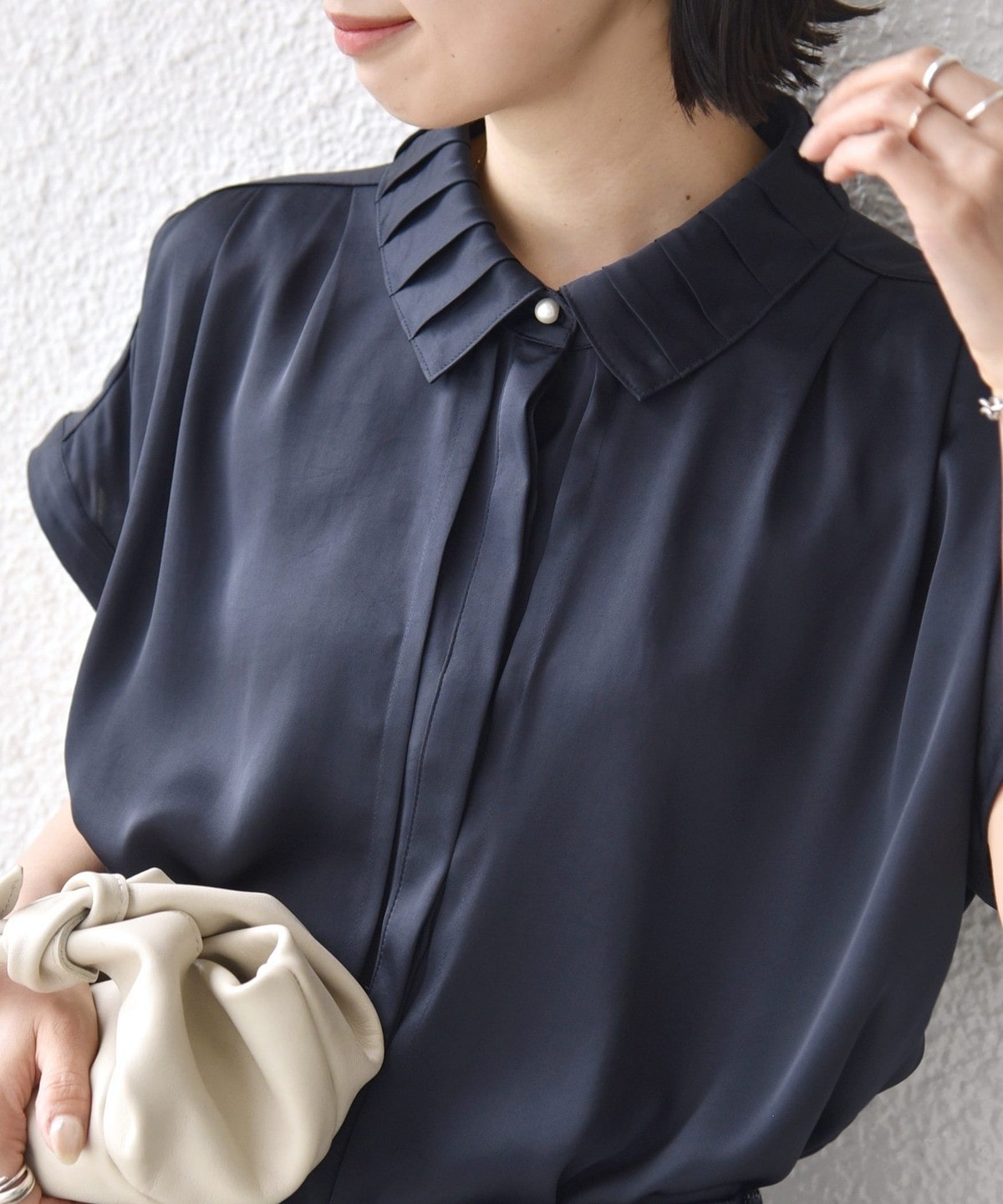 襟のデザインとパールモチーフがポイントになったアクセサリーいらずのブラウス