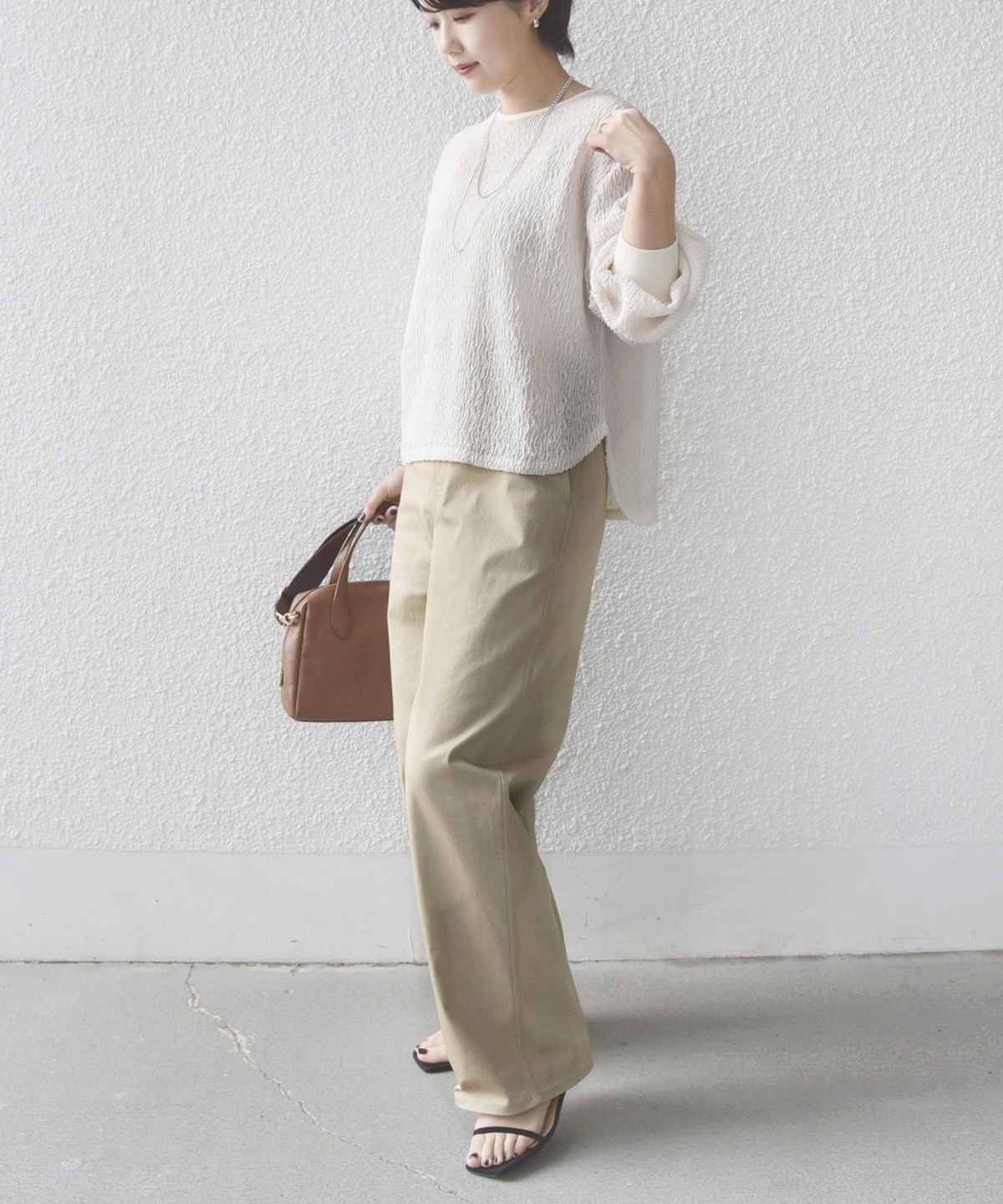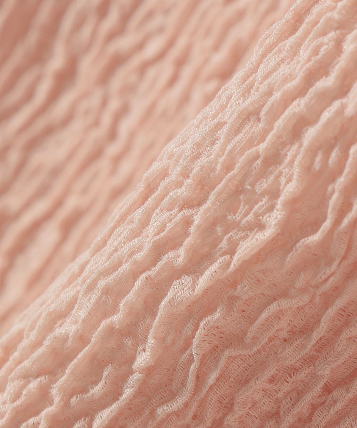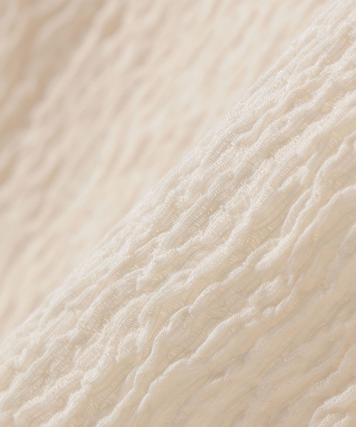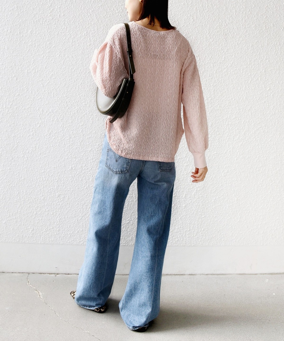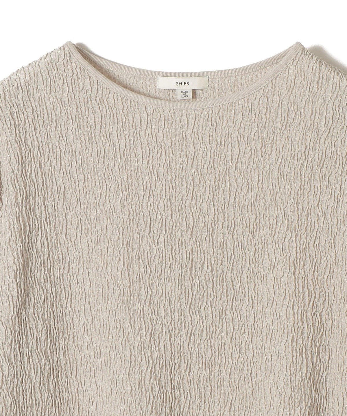 ポコポコとした表面感がかわいく、1枚で着映えするトップスです。