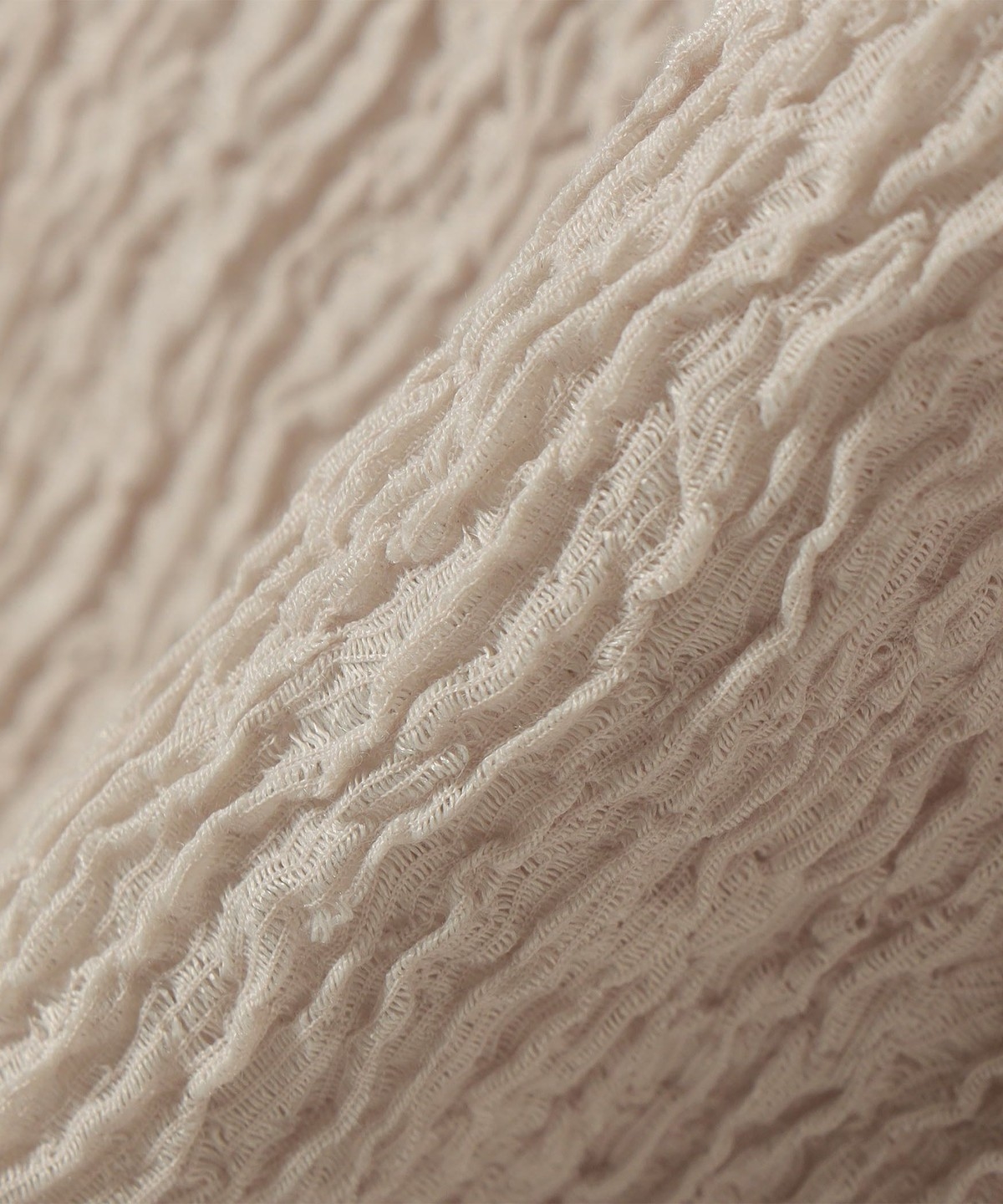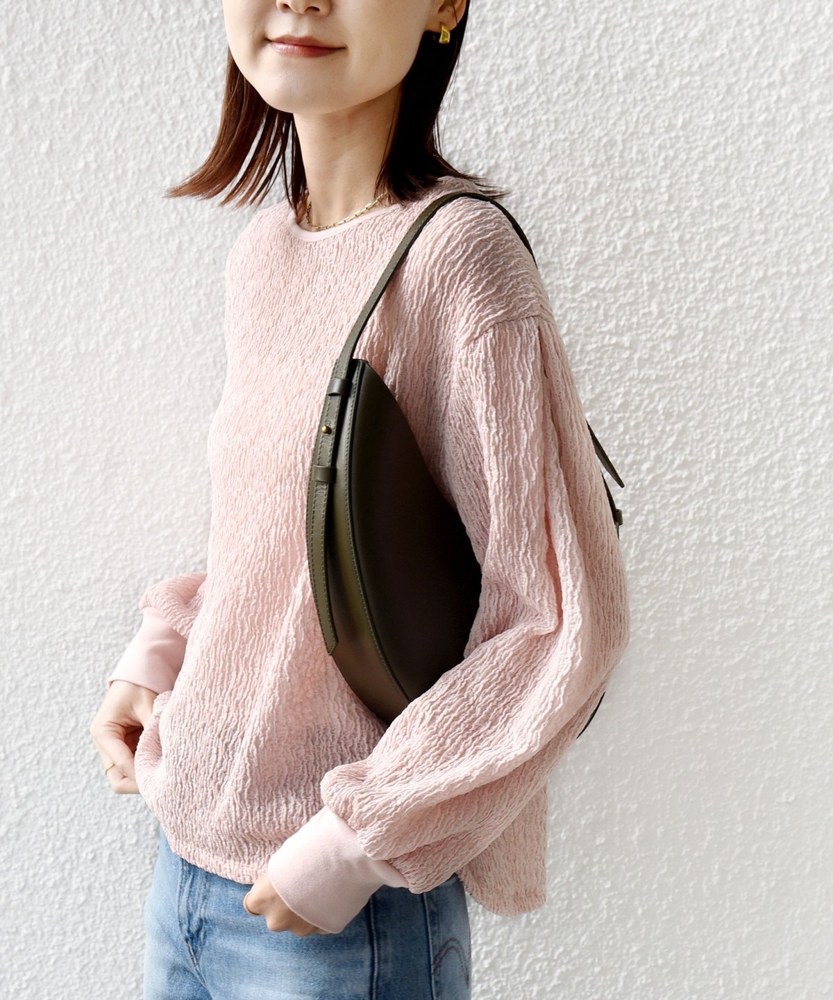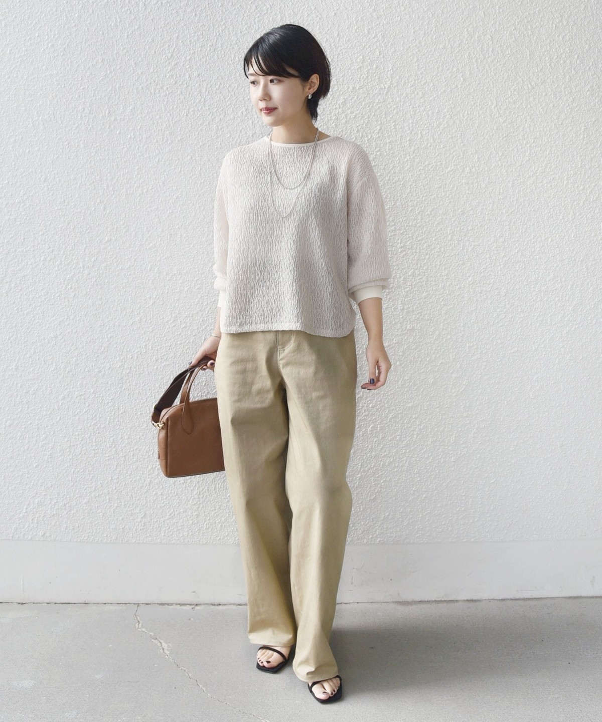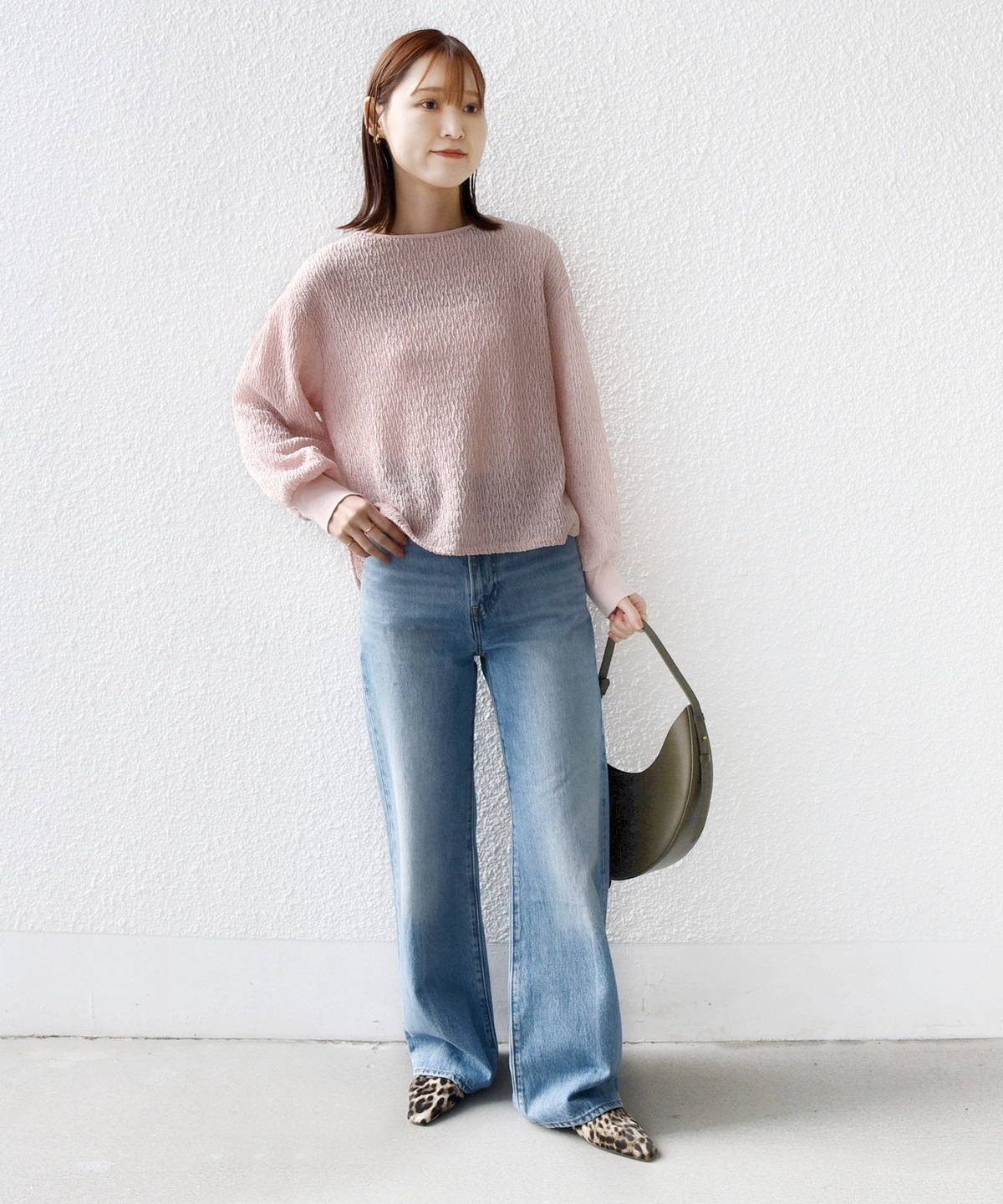 ポコポコとした表面感がかわいく、1枚で着映えするトップスです。