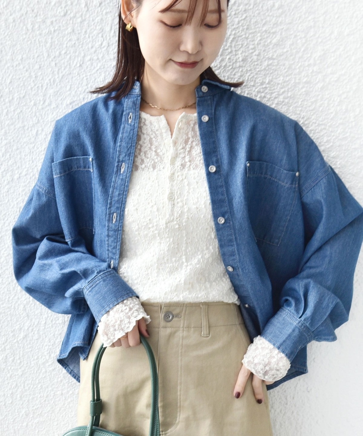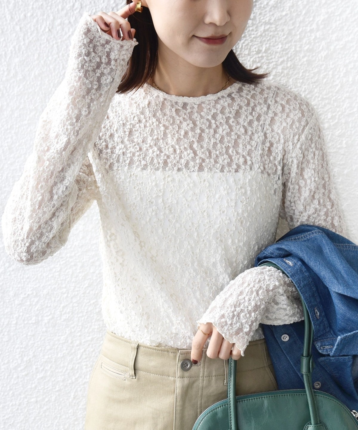 一枚で着用するのはもちろん、シャツやニット、スウェットなどとレイヤードして袖口からレースをのぞかせる着こなしがおすすめ。