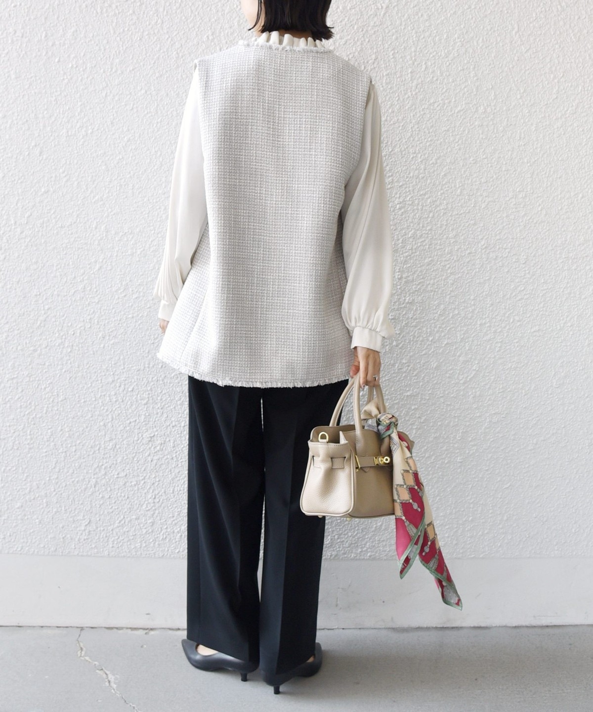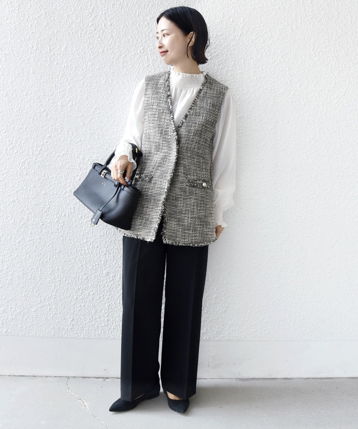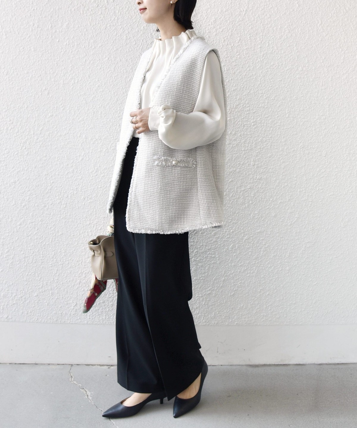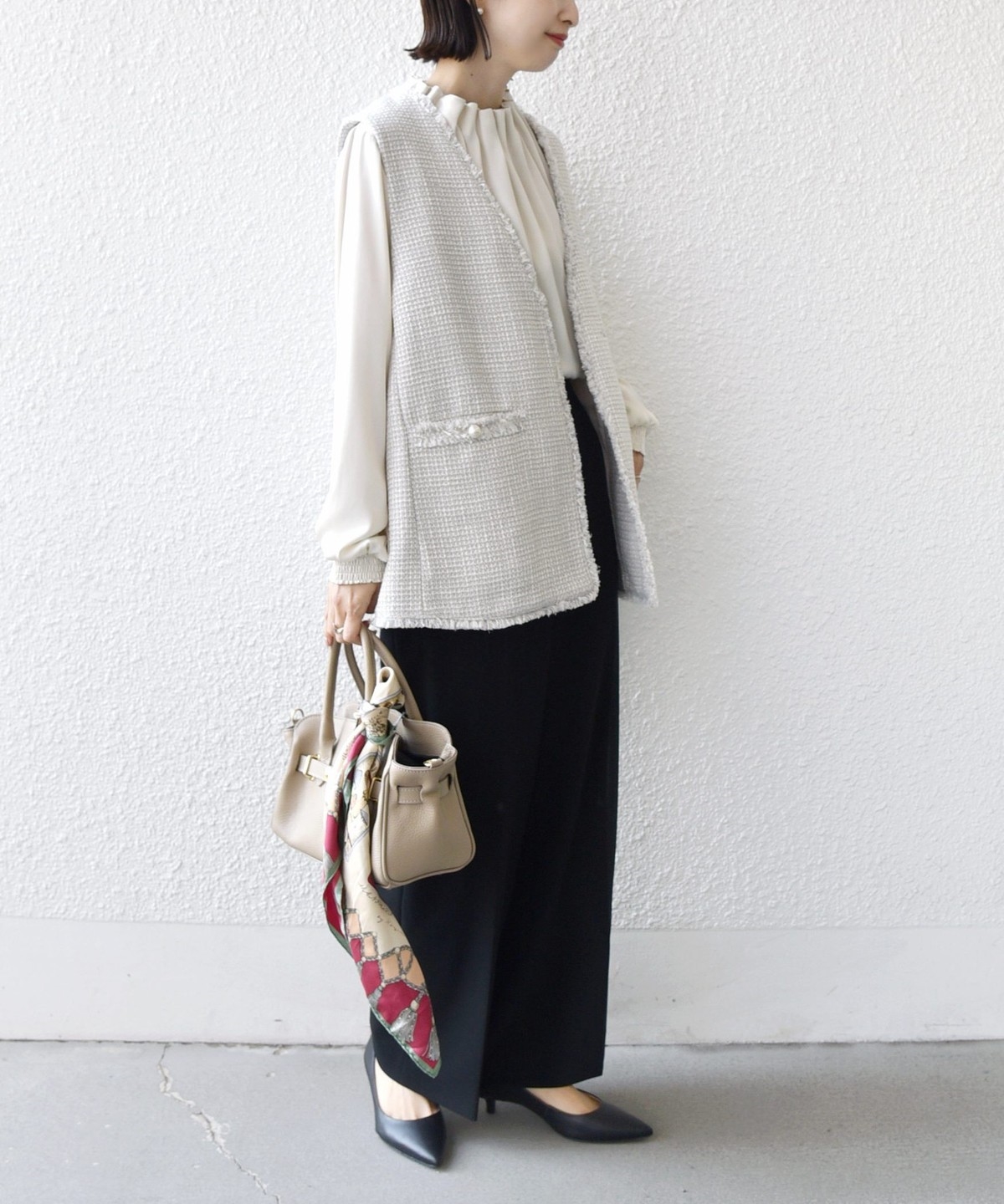 ツイード素材のジレやジャケットとも相性が良い万能なデザインなので、お手持ちのトップスに合わせて幅広くご活用いただけます。