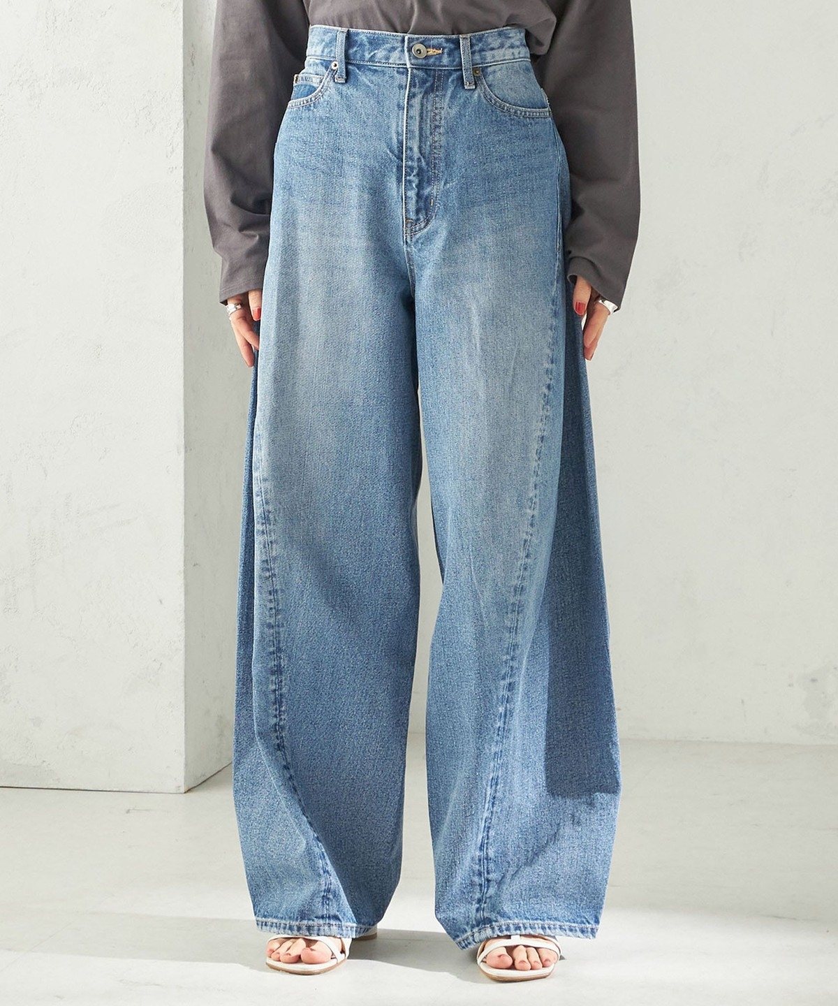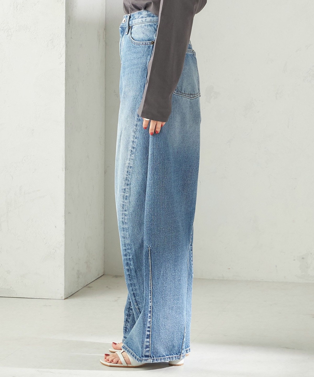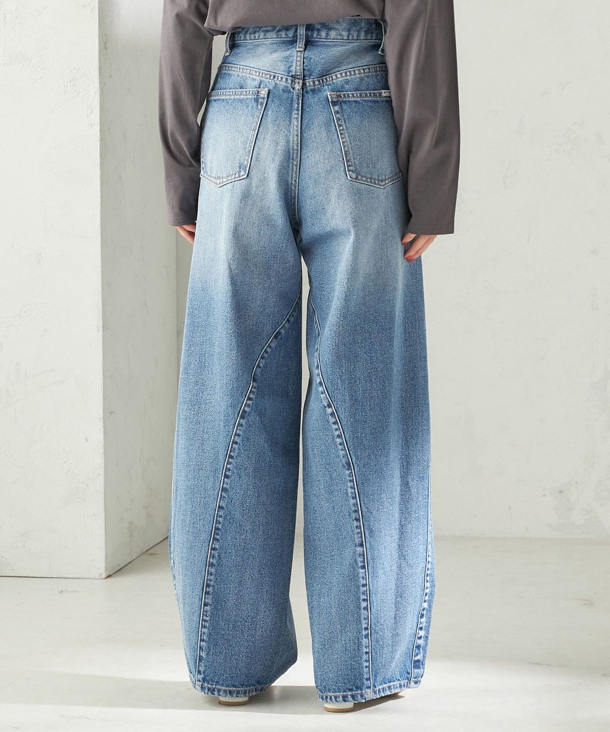 程よい厚さと前後の立体感に加え、バレルレッグデザインによる落ち感のある丸みと程よいボリューム感が特徴です。