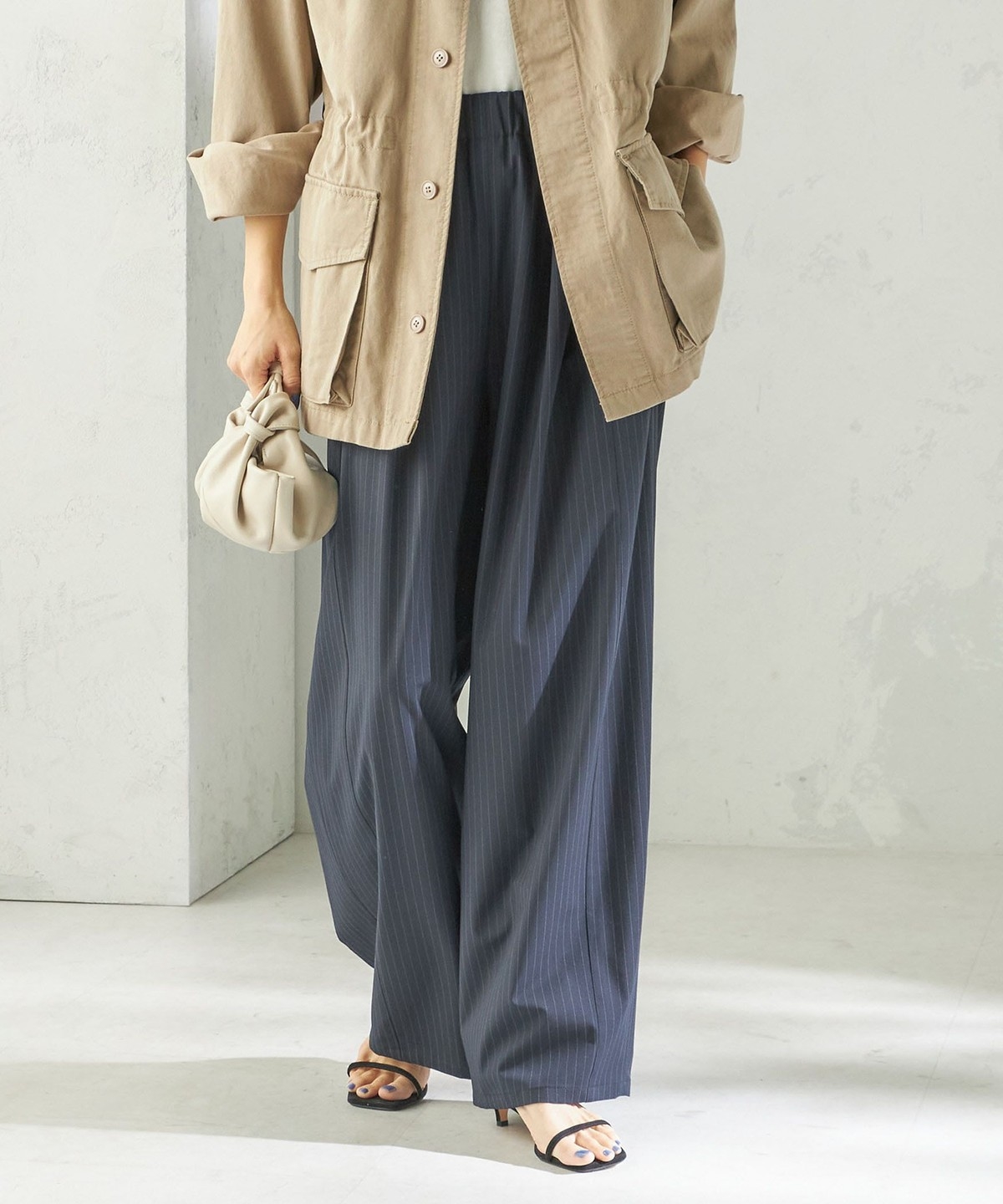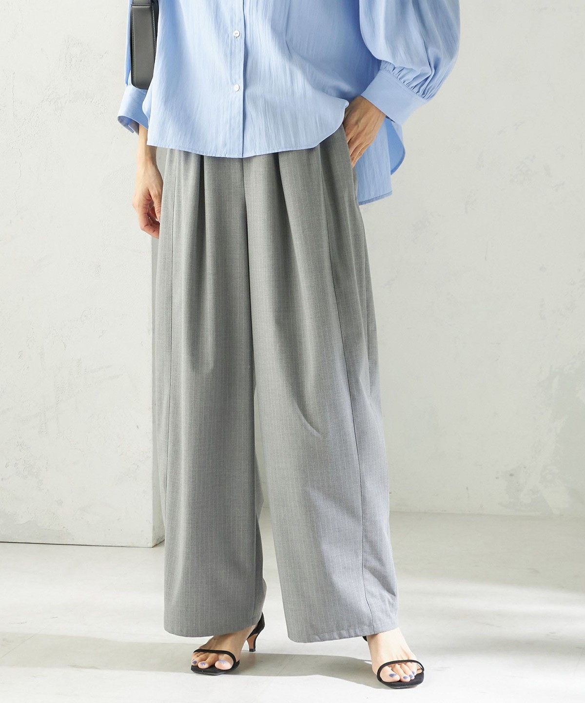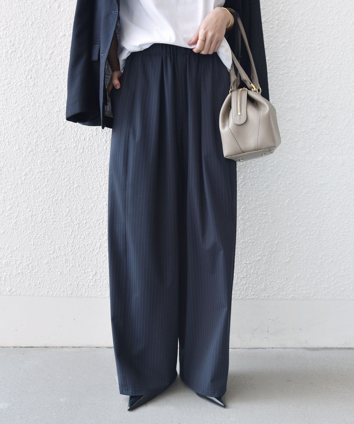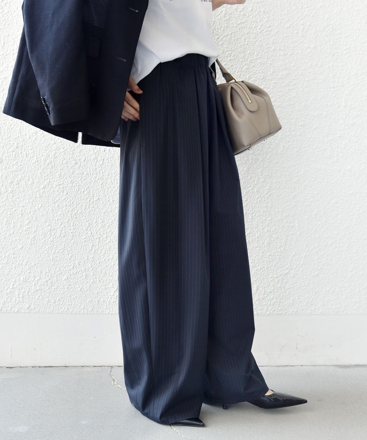 《予約》〈手洗い可能〉トロ ピン ストライプ ウエスト ギャザー パンツ