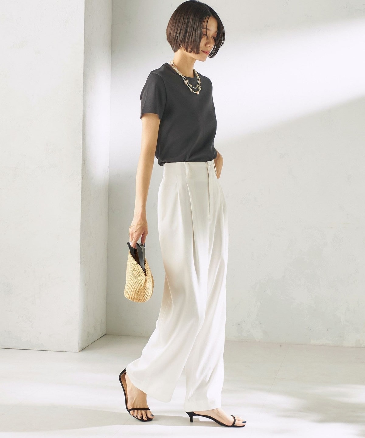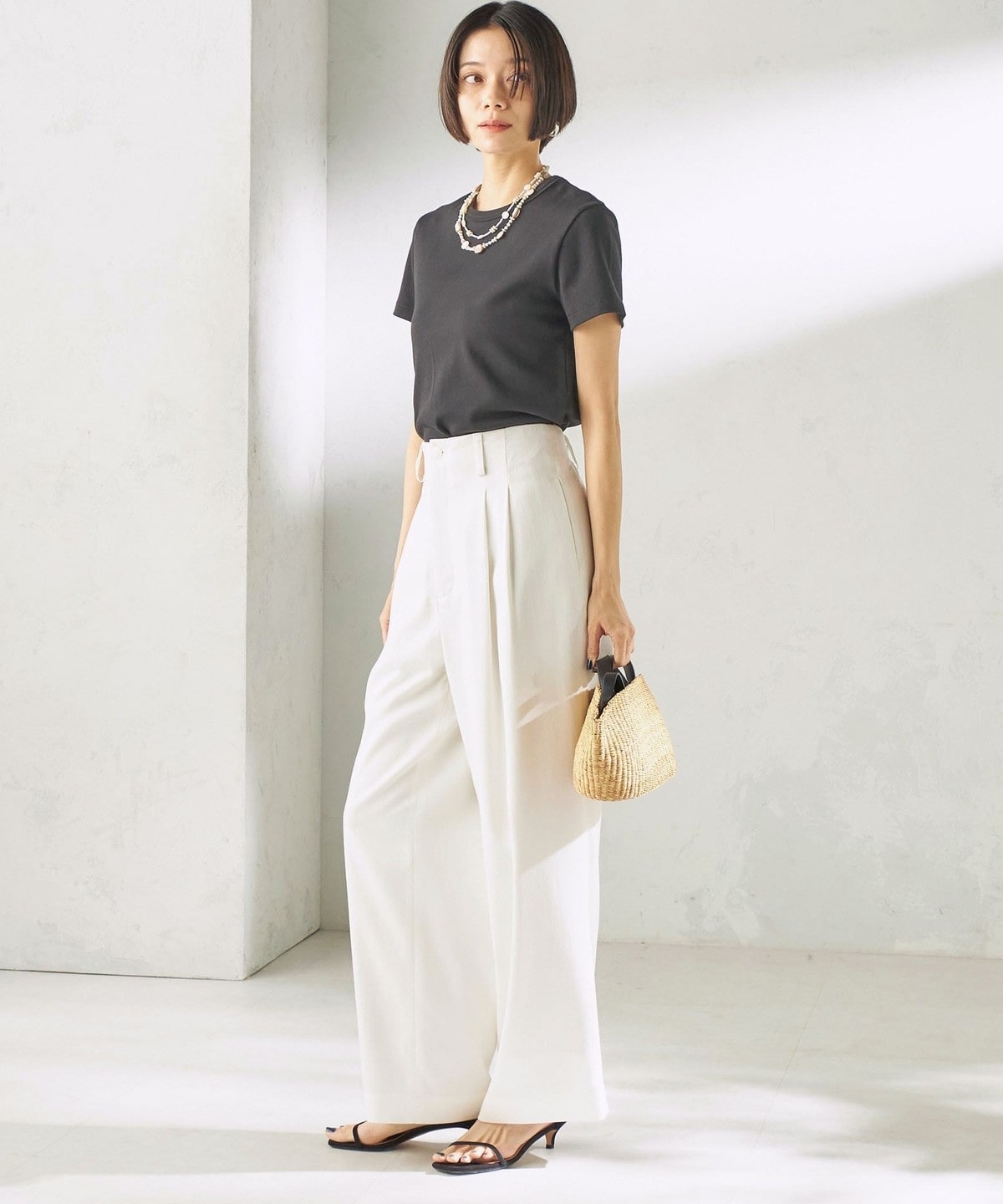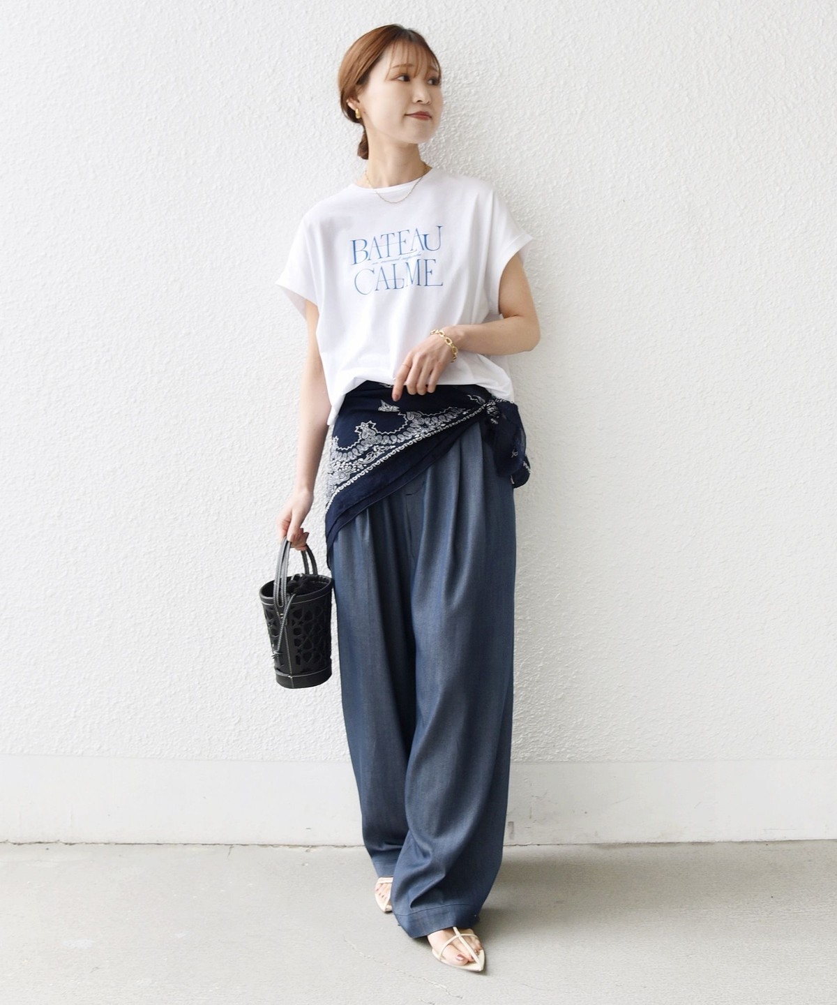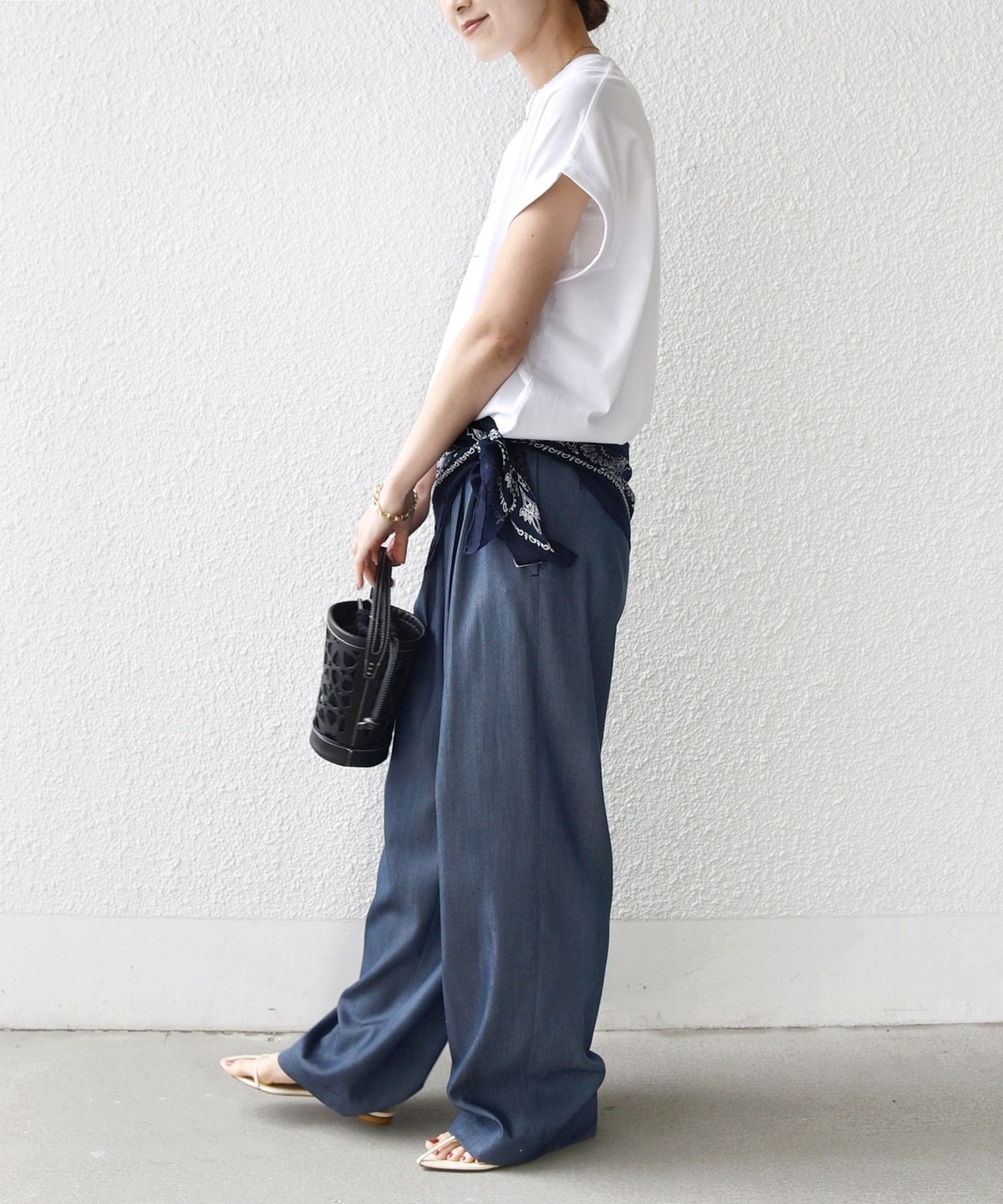 Tシャツ合わせでもカジュアルになりすぎず、大人っぽく仕上がります。