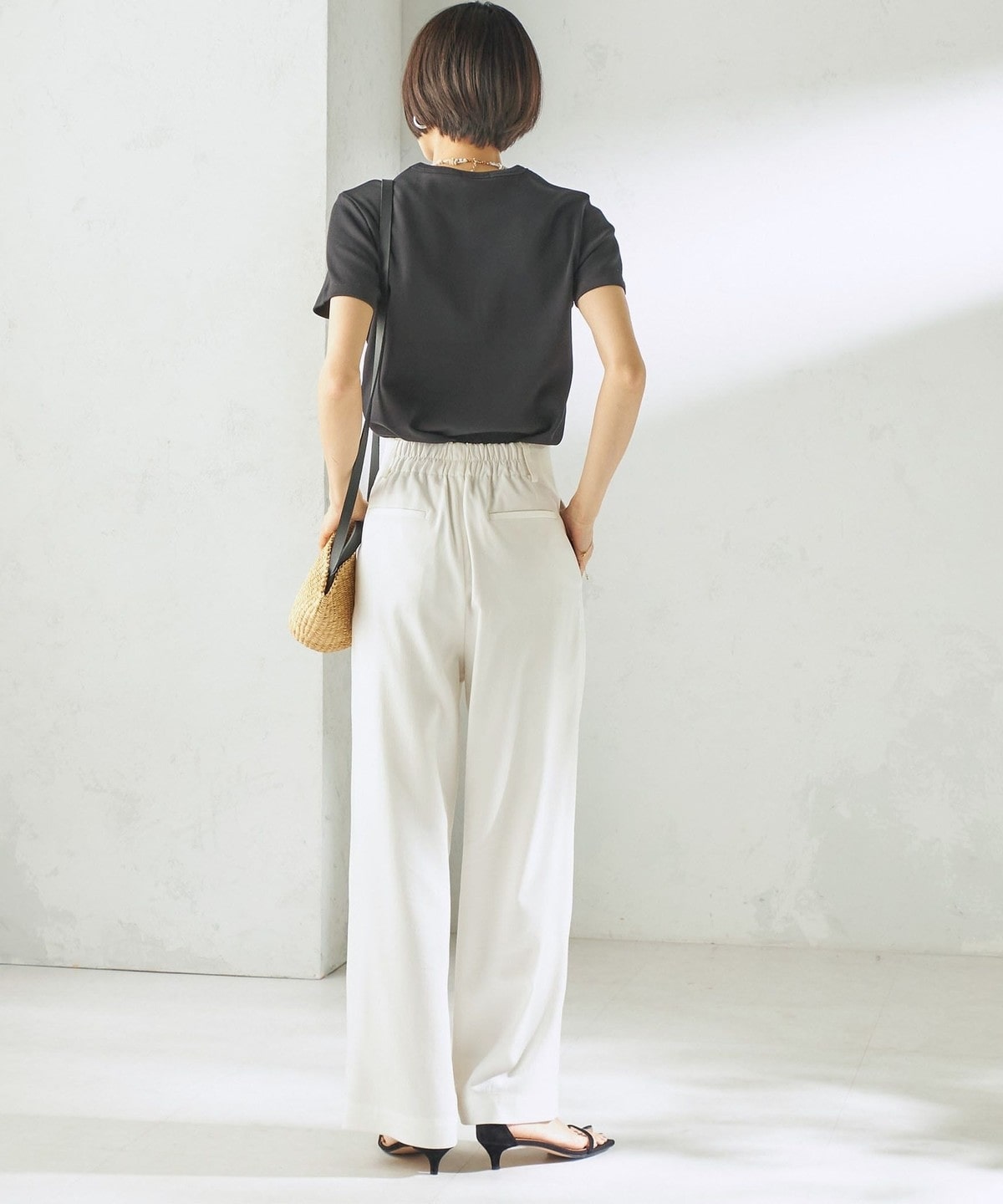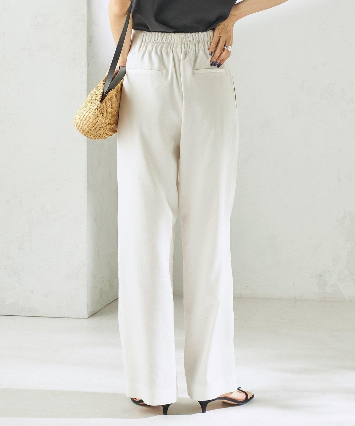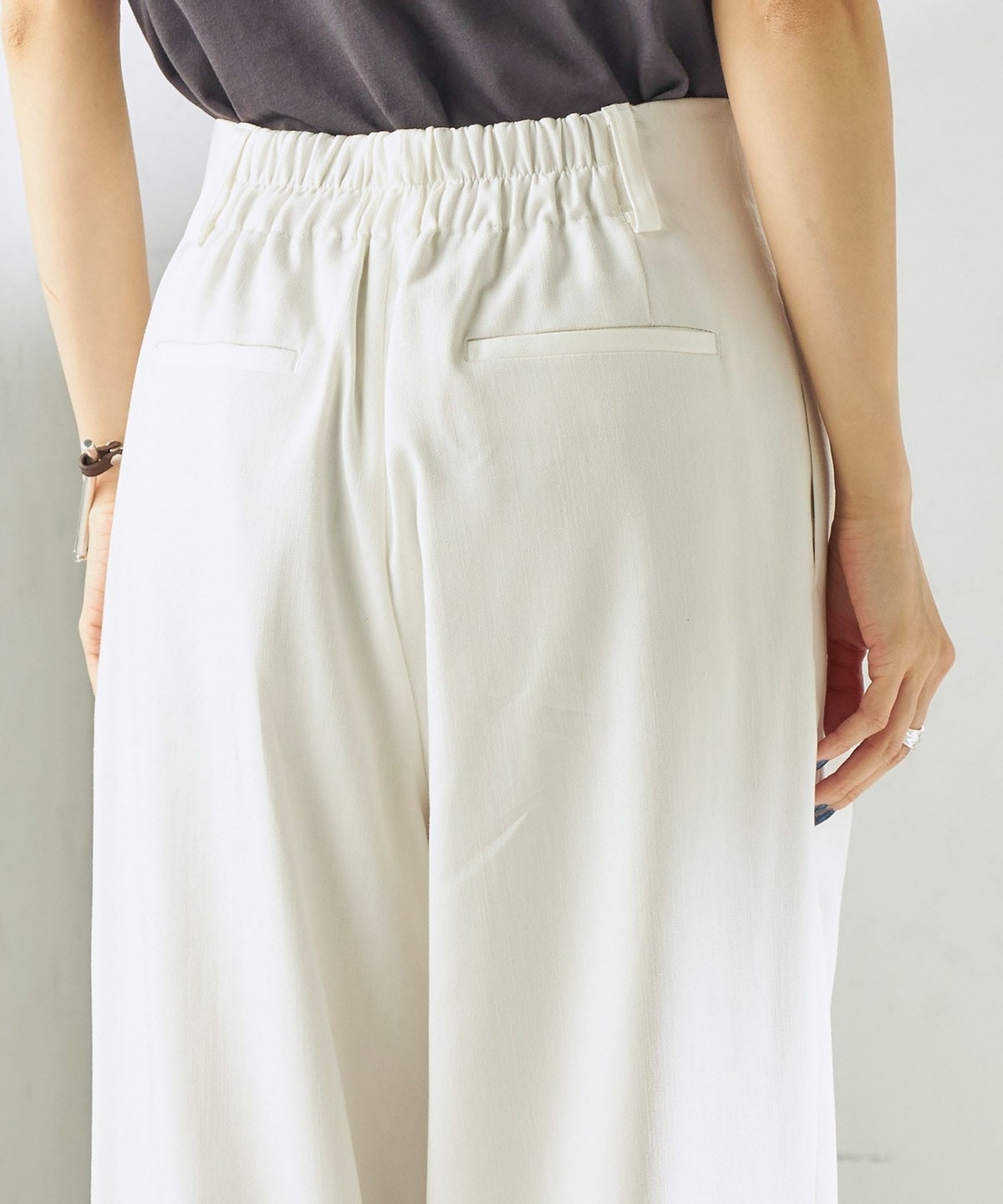 ウエストは切り替えのないすっきりとしたデザインで、腰まわりをよりスマートに見せてくれます。