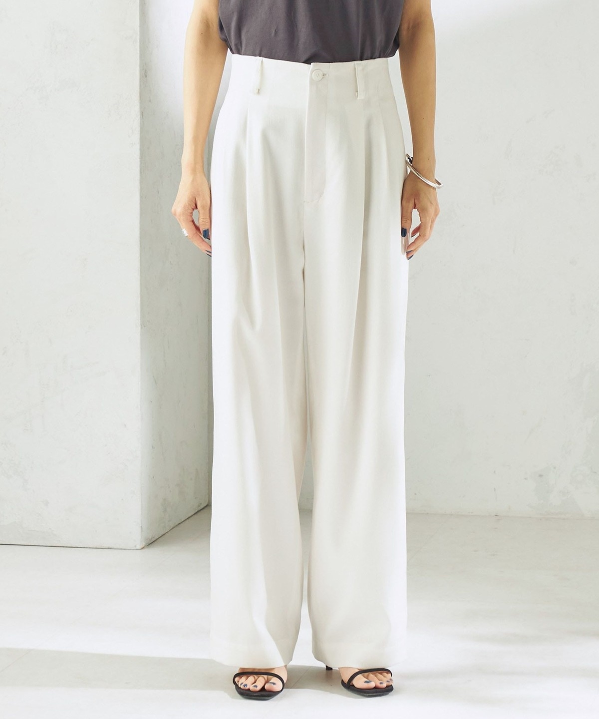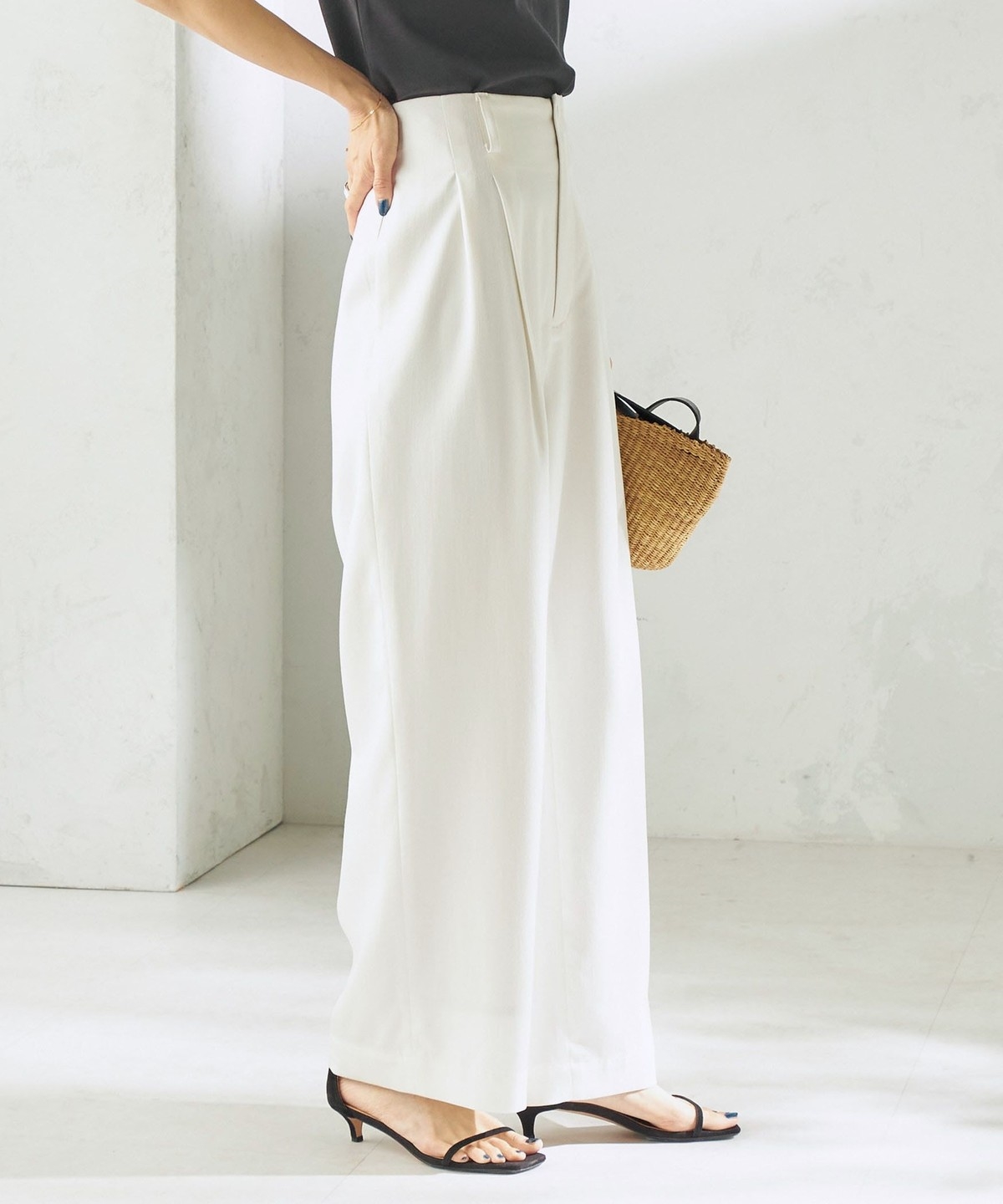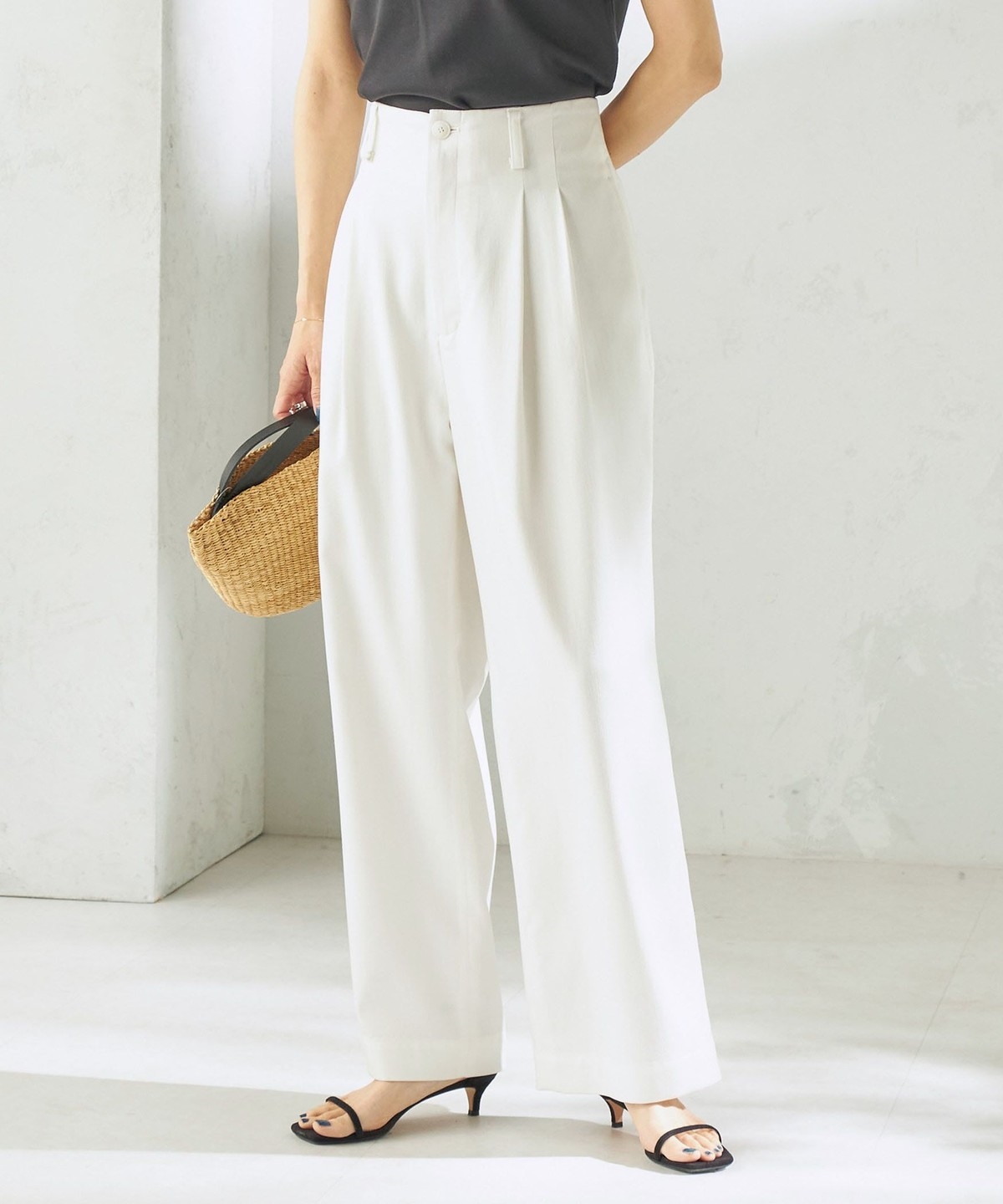 腰位置を高く見せる設計と2タック仕様で、お腹まわりをカバーしながらスタイルアップが叶うタックワイドパンツ。