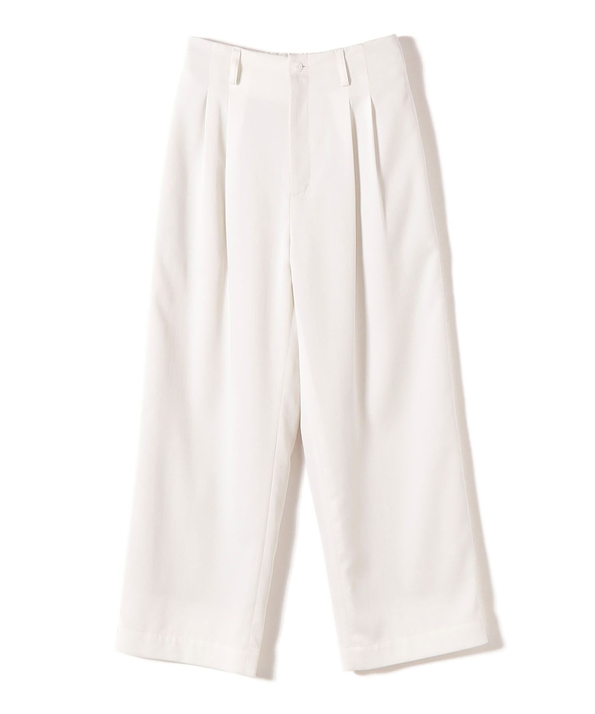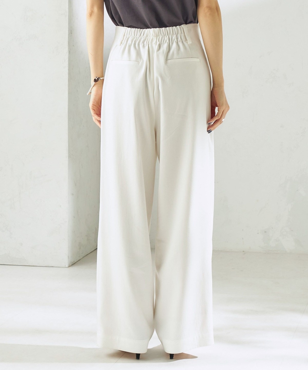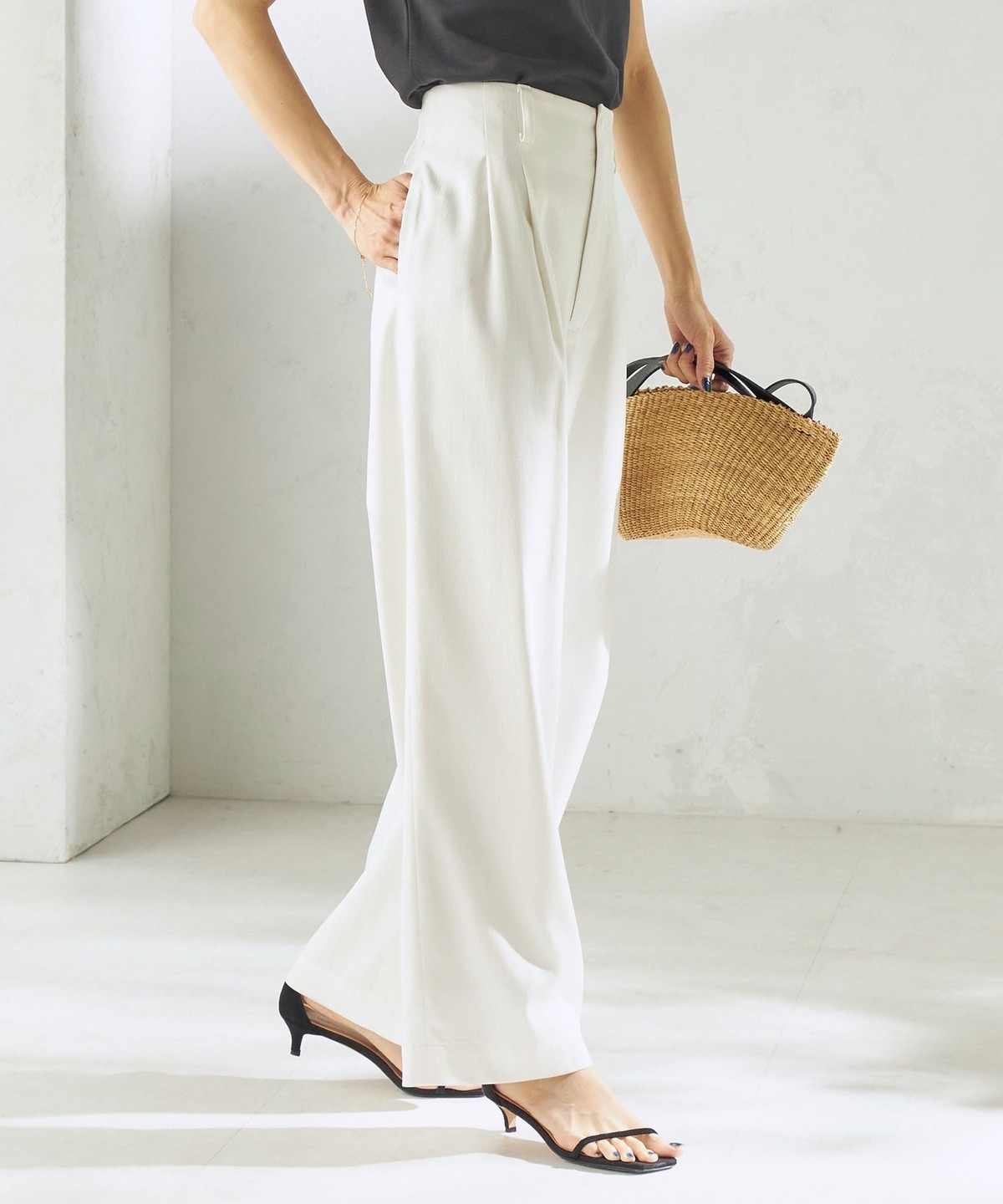 腰位置を高く見せる設計と2タック仕様で、お腹まわりをカバーしながらスタイルアップが叶うタックワイドパンツ。