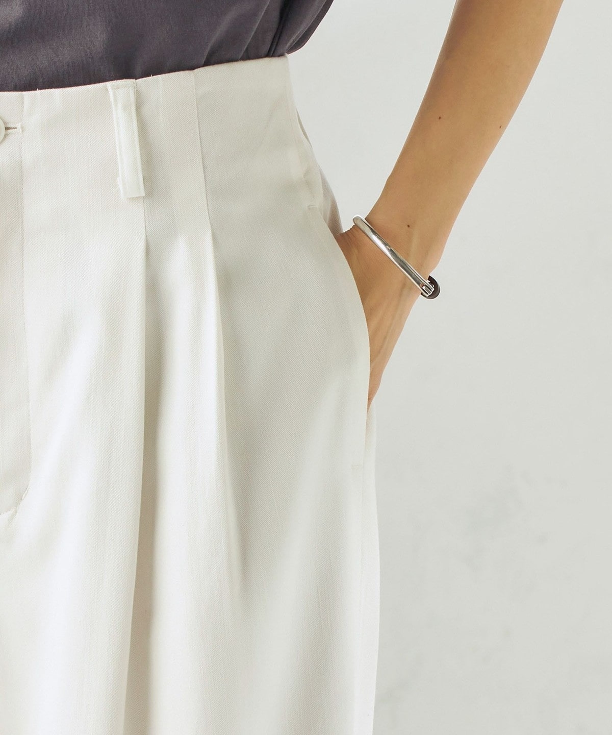 センタープレスはあえて途中までにすることで、きちんと感がありながらも程よく抜け感のある印象に。