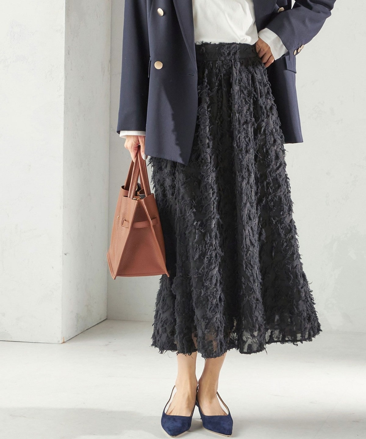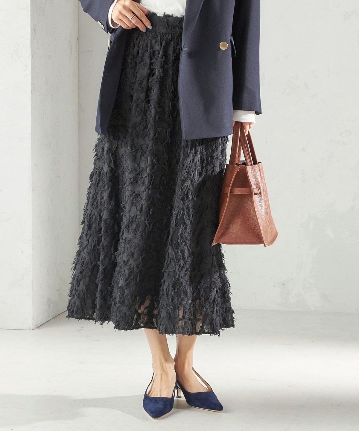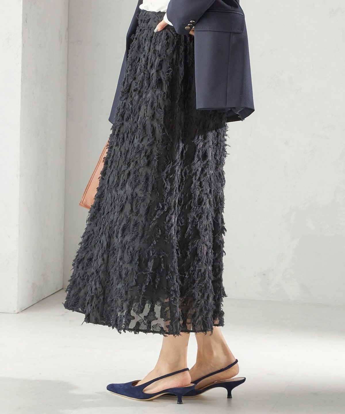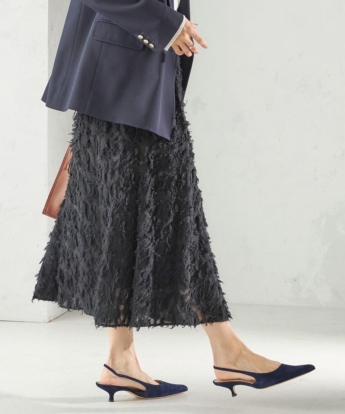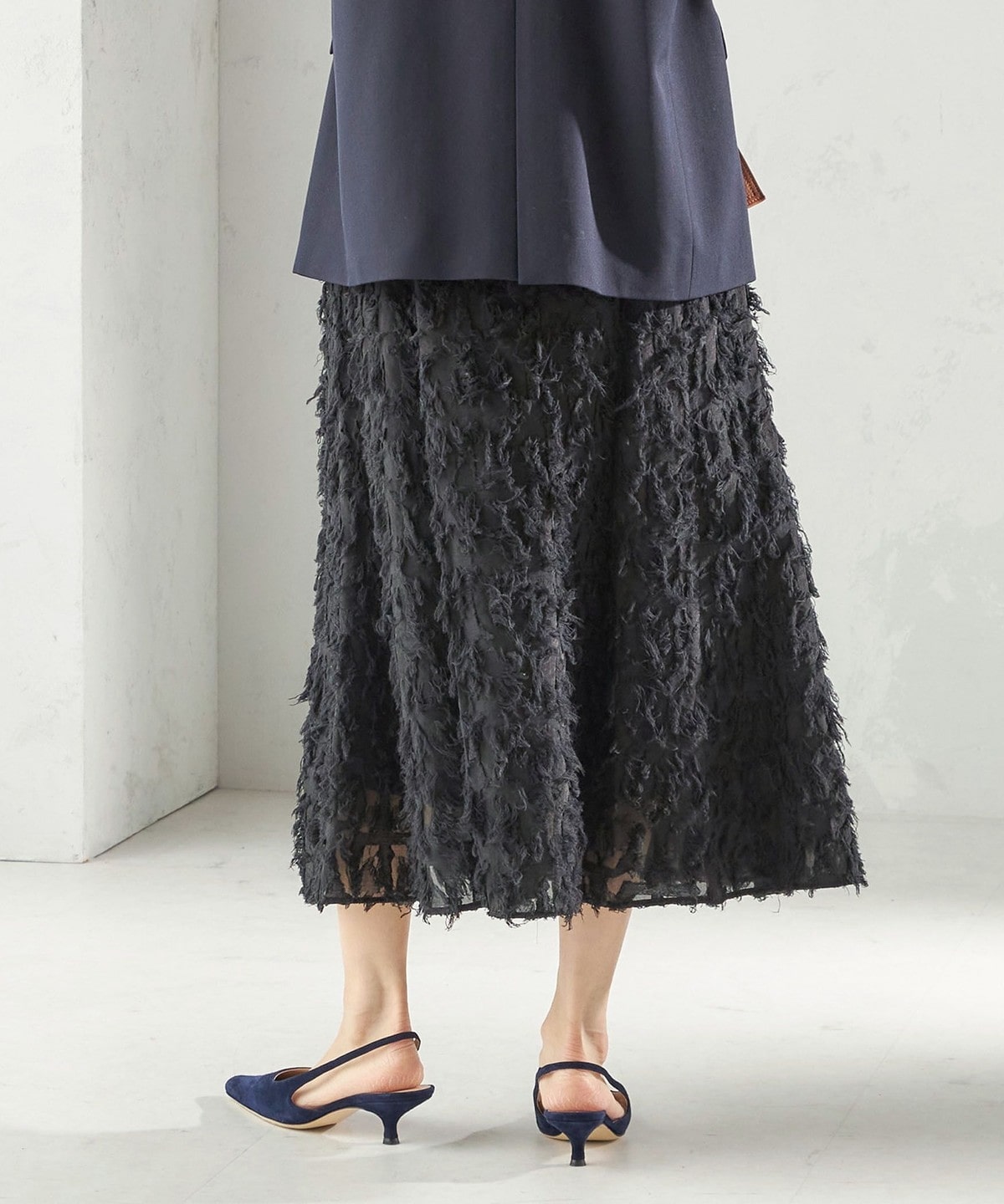 毛足の長いカットジャカードを採用した、華やかなフレアスカート。