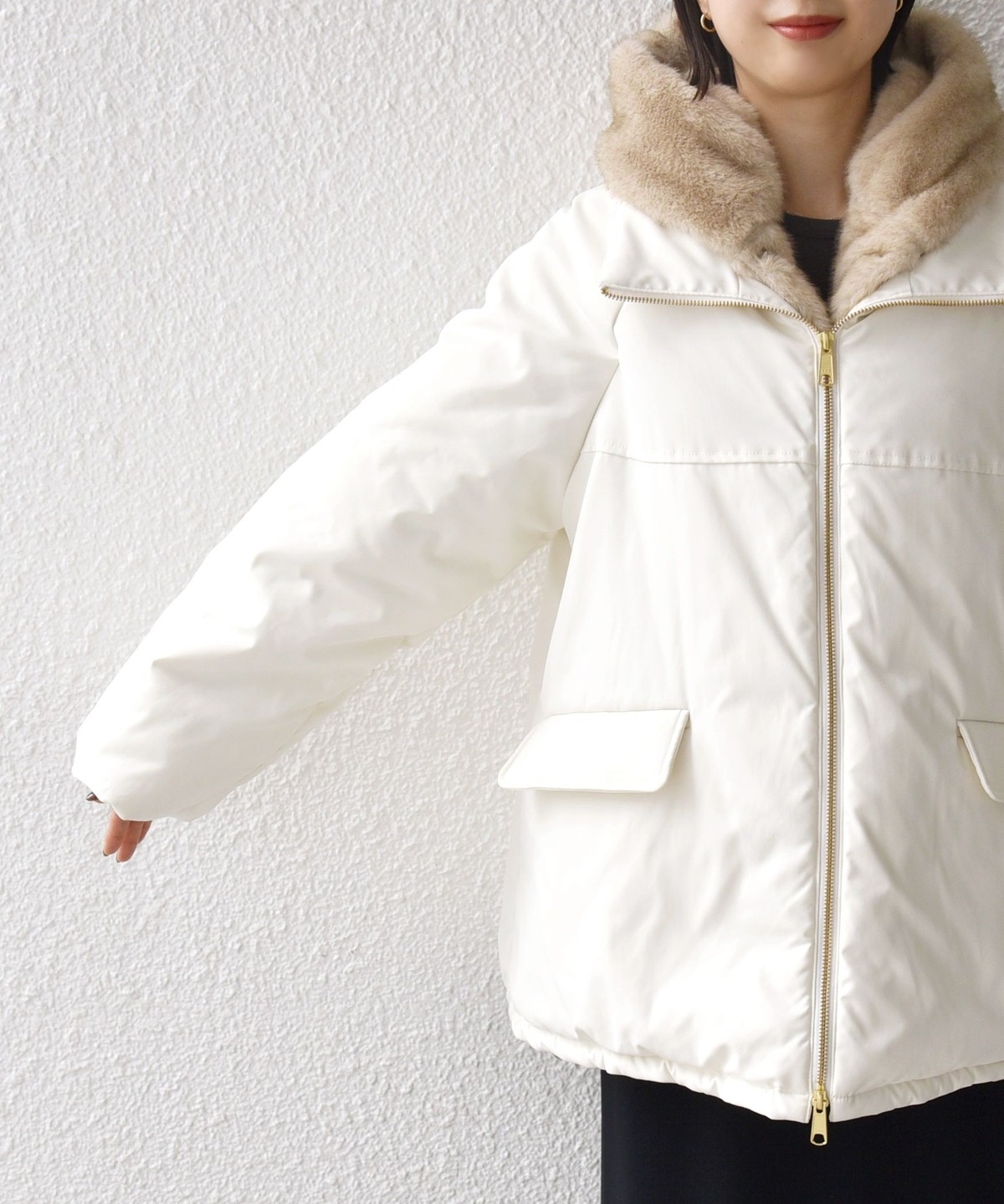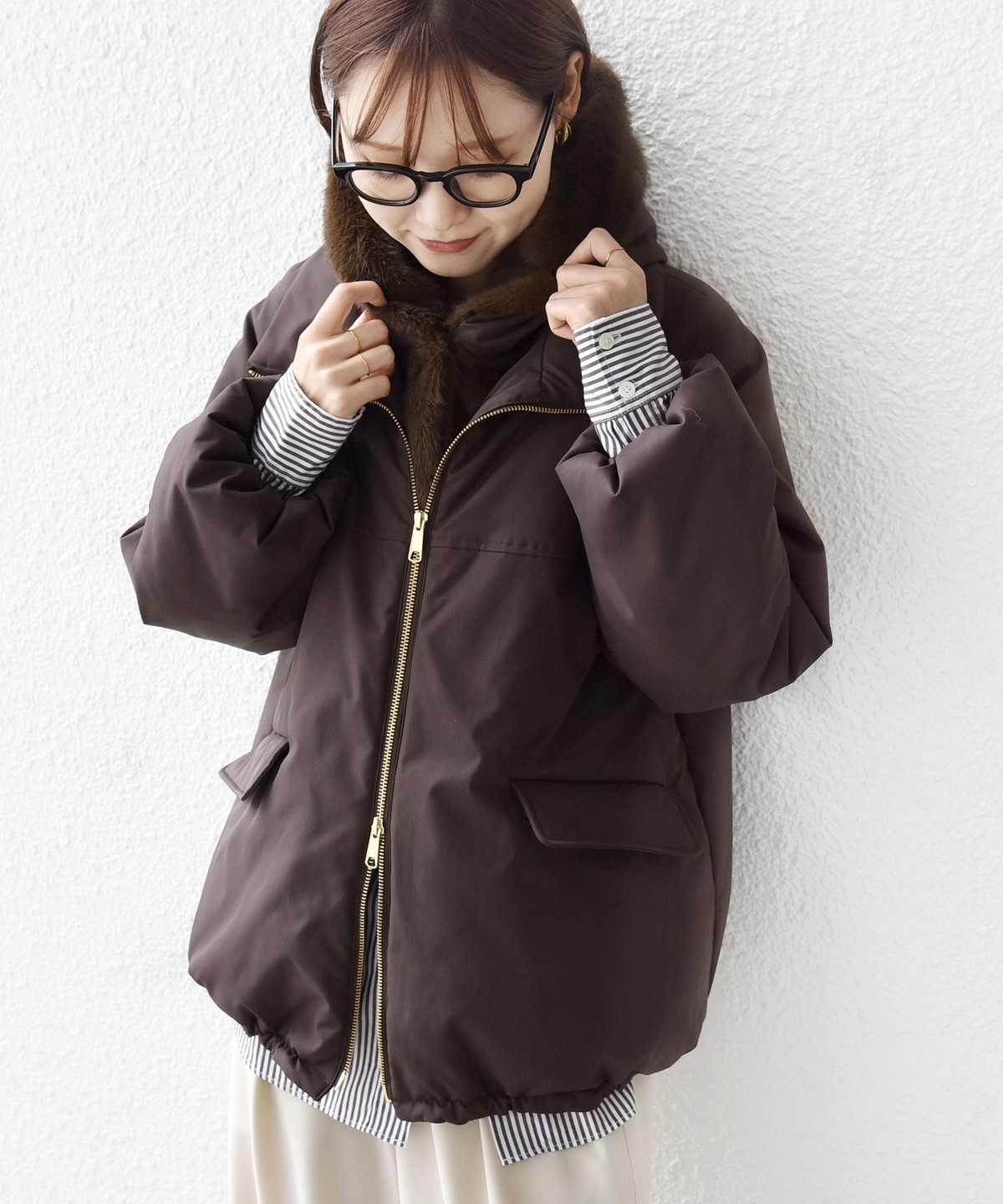シンプルな中綿ジャケットにフェイクファーのフードが映えるデザイン。