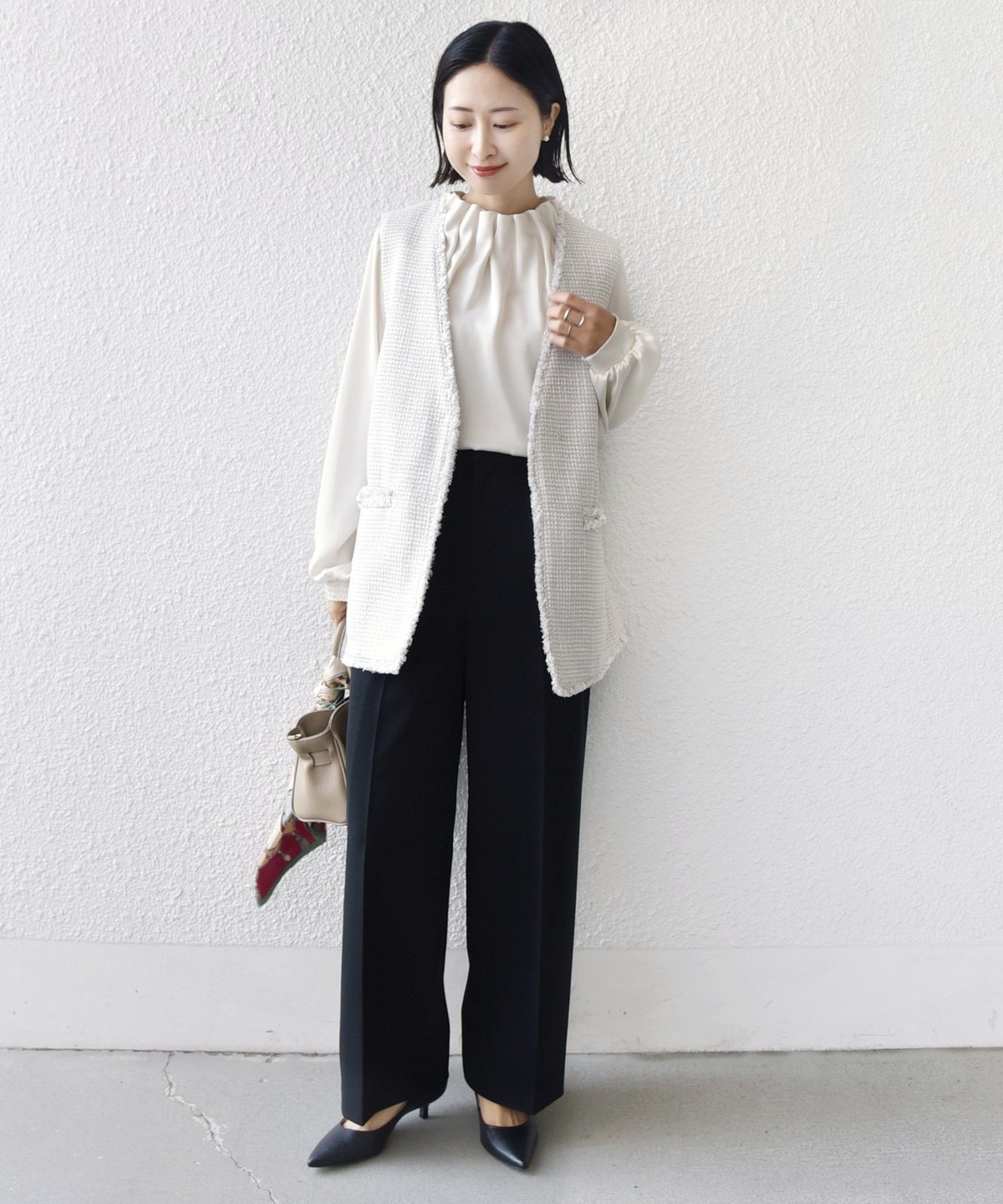 すっきりとしたシルエットで、テーパードパンツ・ワイドパンツ・スカートなど幅広いボトムと好相性。