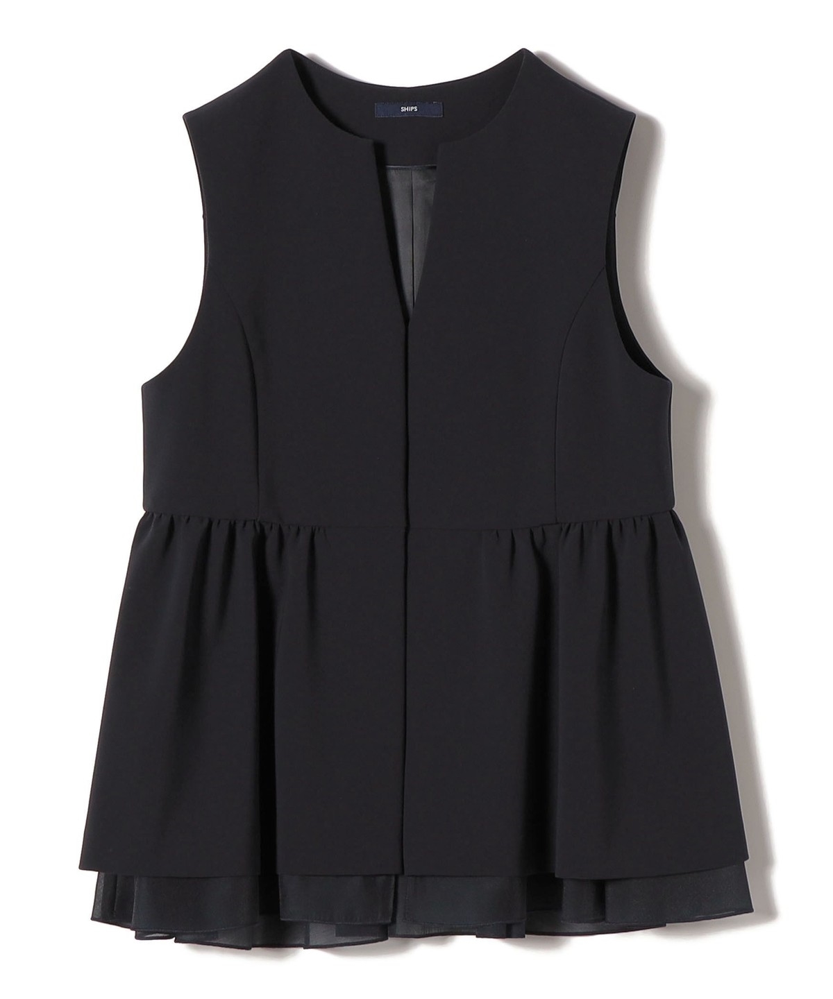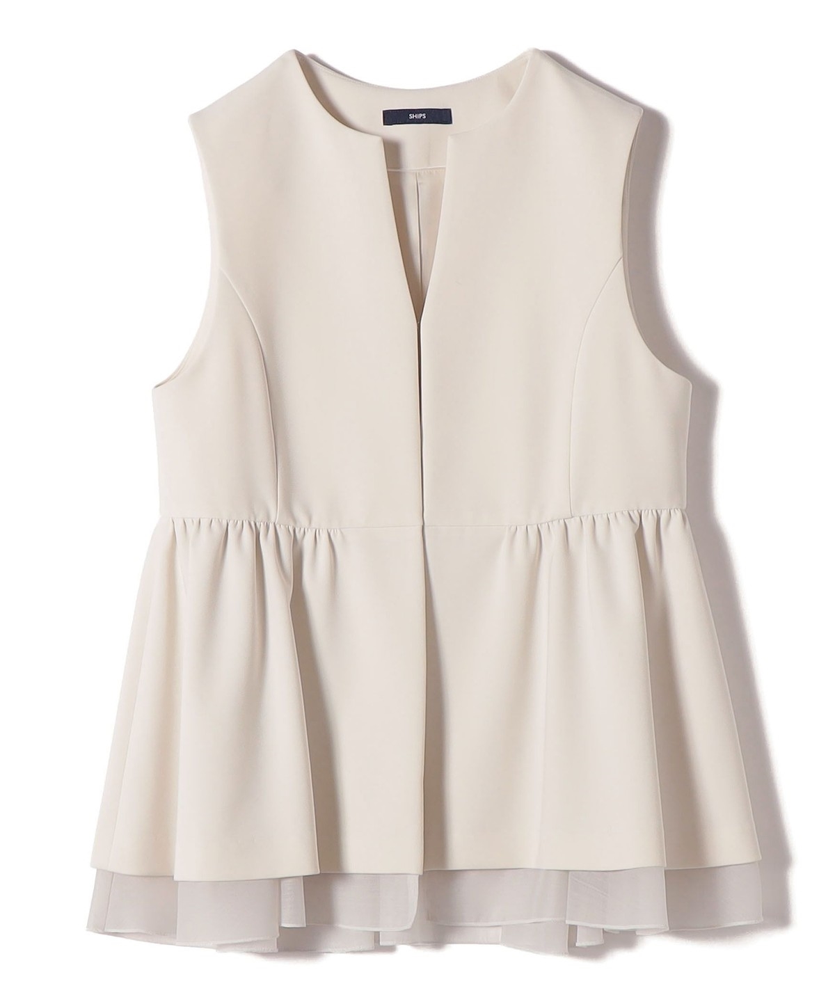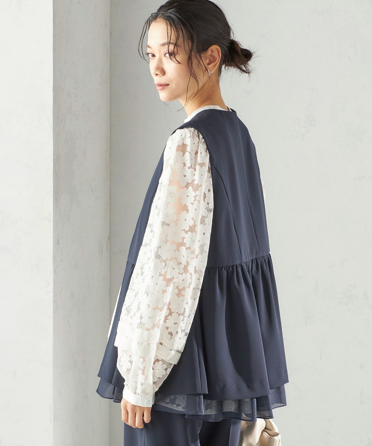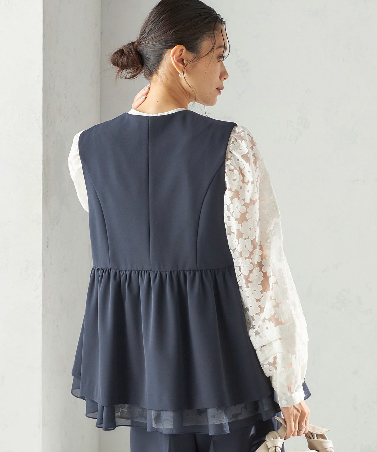 裾から重ねたオーガンジーが覗く、一枚で映えるデザインジレ。