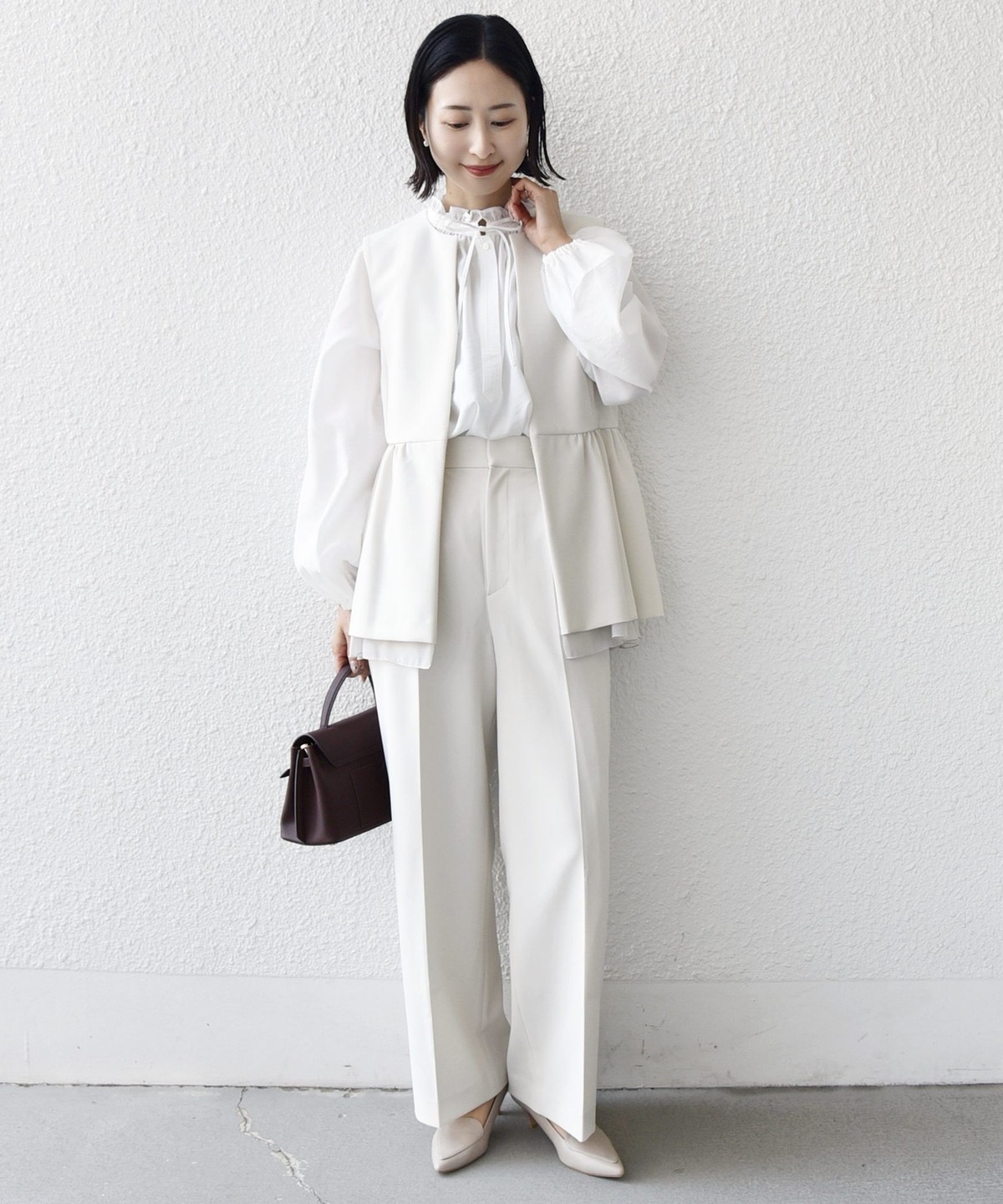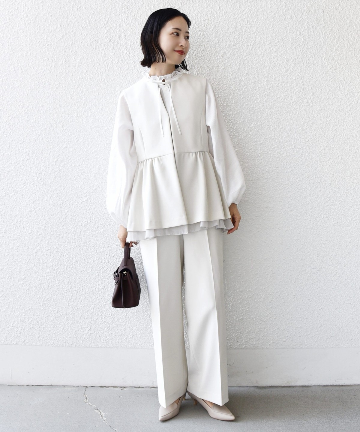 インナーはシンプルなハイネックブラウスやタートルニット・クルーネックニットのインナーなどと合わせていただけるとバランスが◎