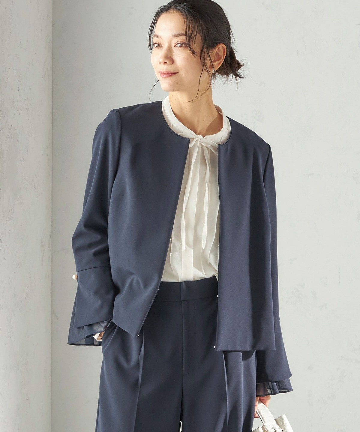 袖口にパールモチーフボタンを使用し羽織るだけで華やかになるような一枚。