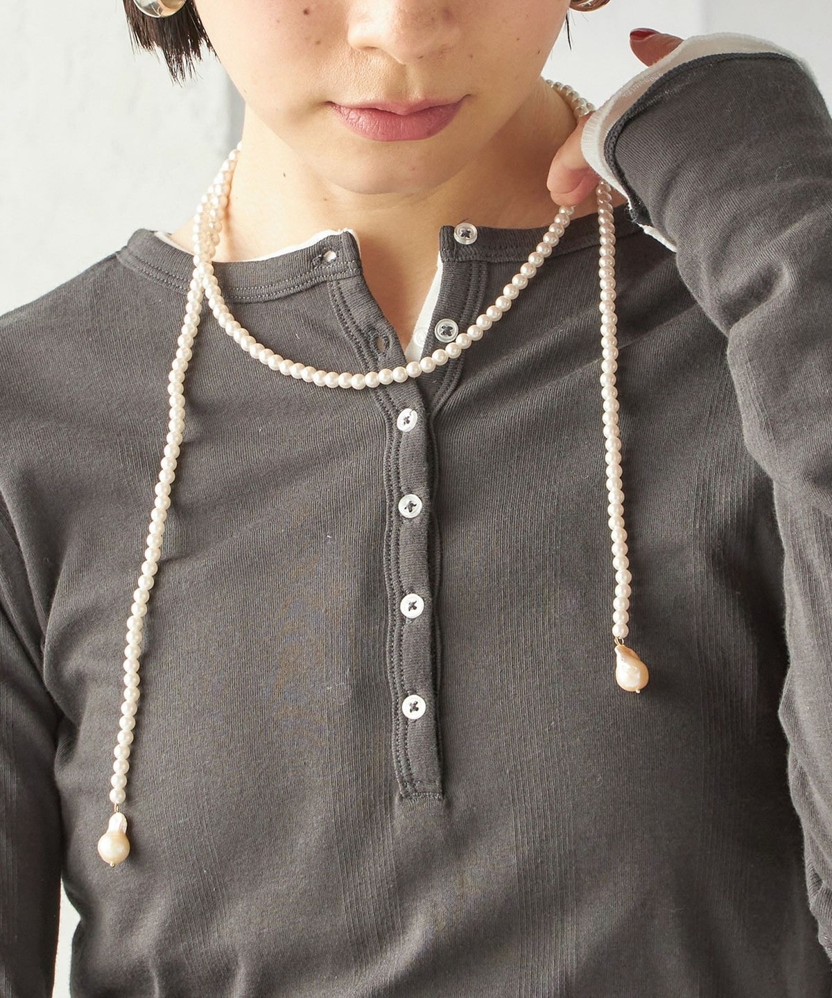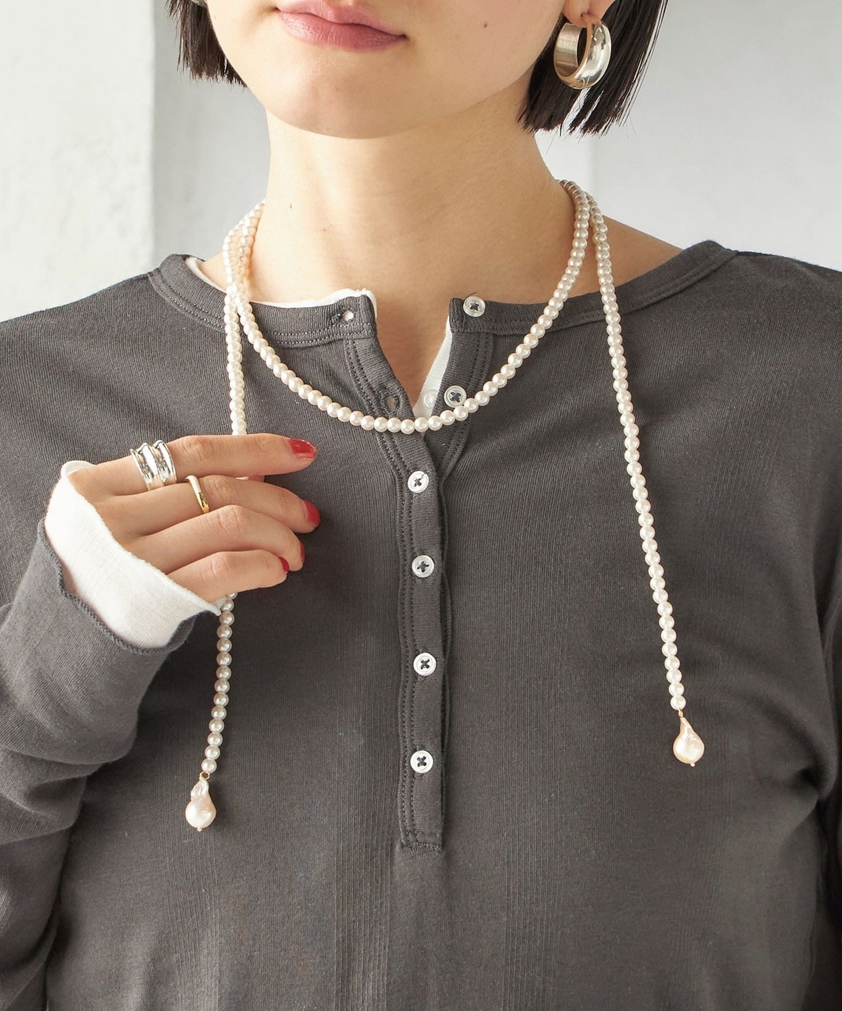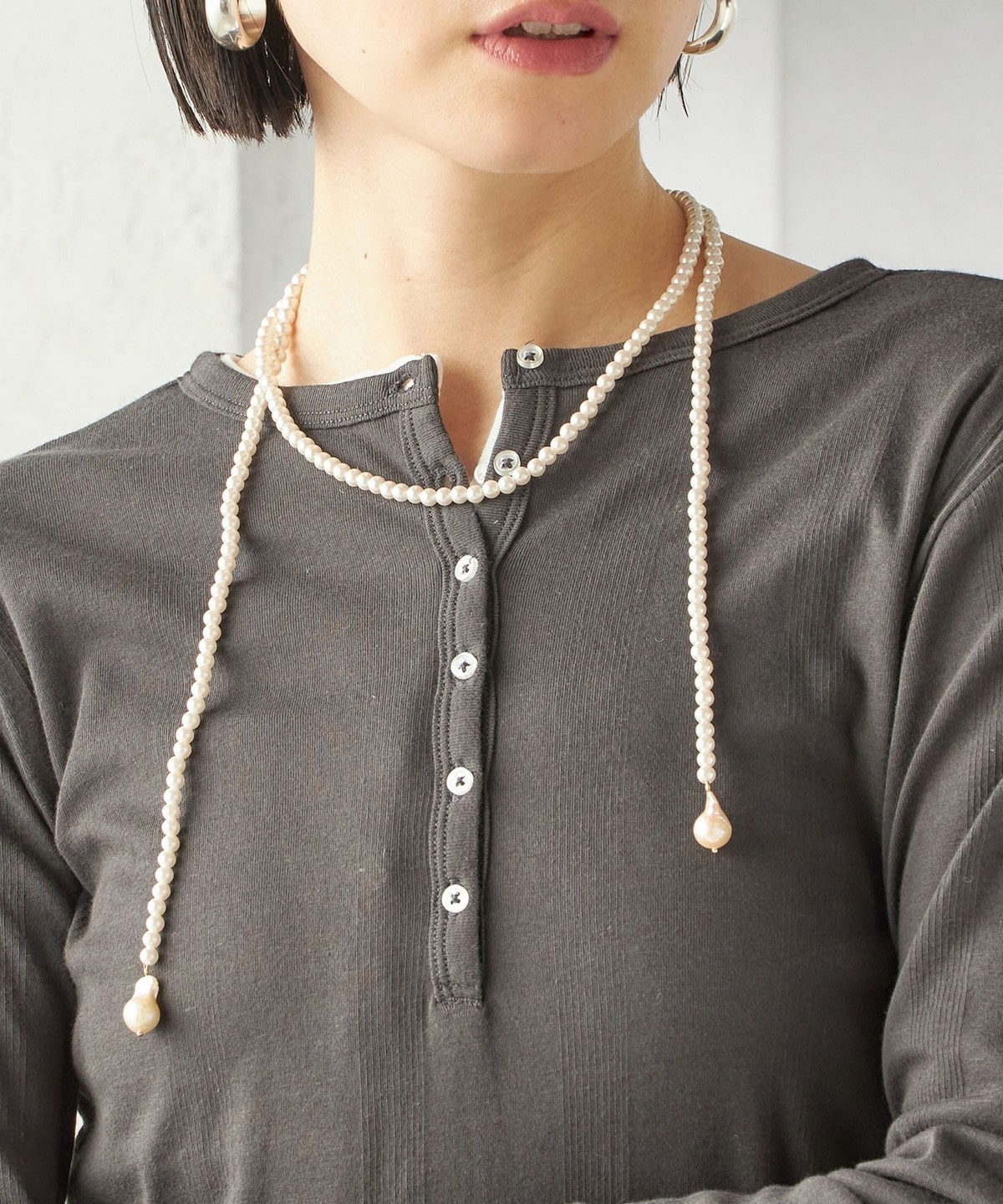 プラスチックパールと淡水バロックパールを使用した、シンプルながら存在感のあるラリエットネックレスです。