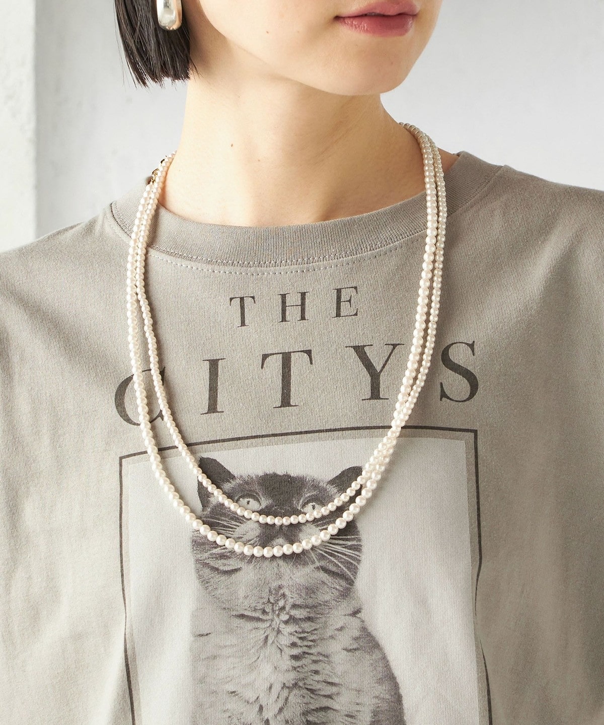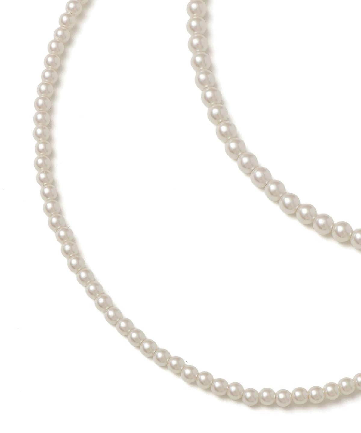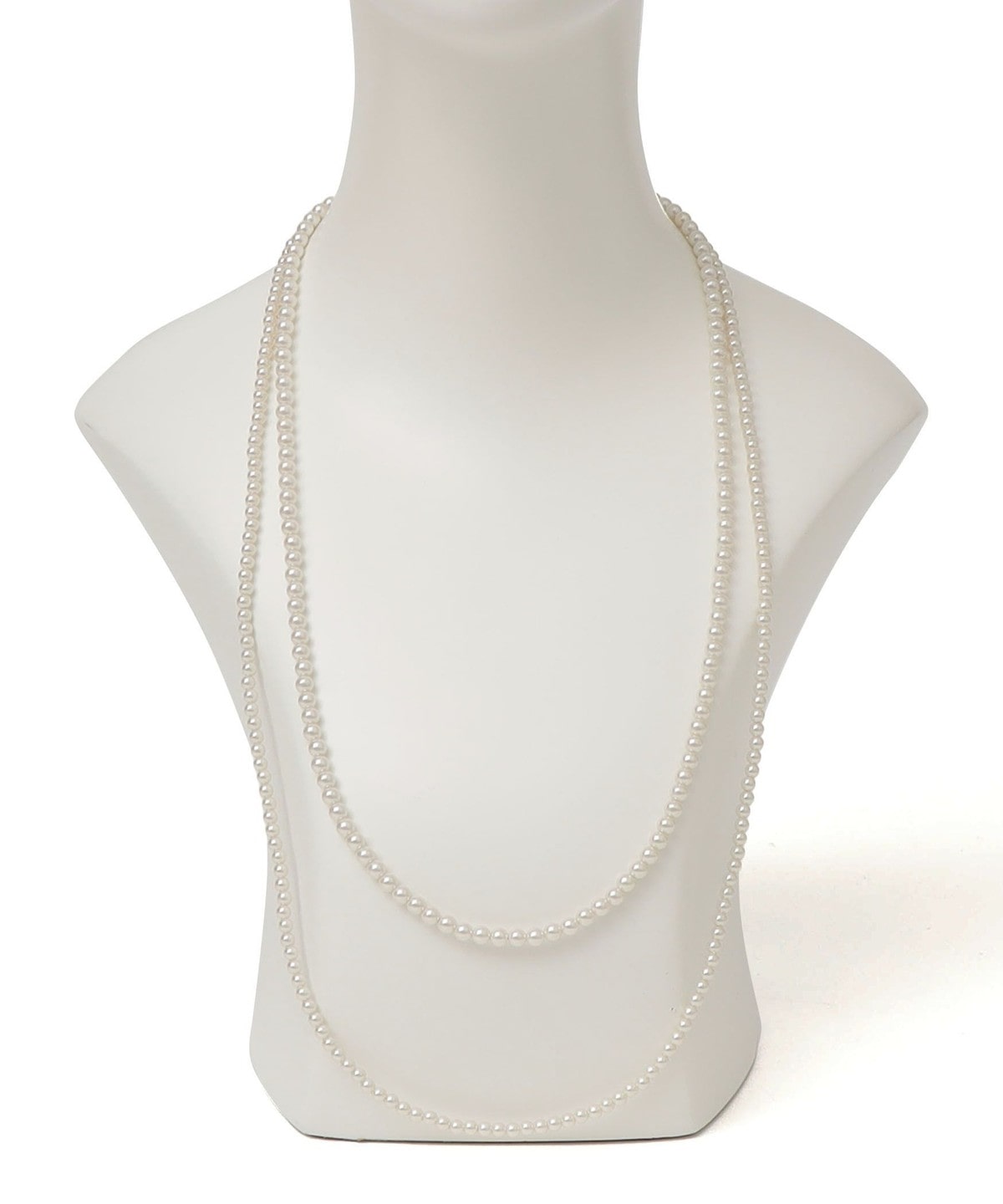 長さ約63cm(パールモチーフ5mm玉)と、長さ約76cm(パールモチーフ4mm玉)を2連にした、マルチウェイのネックレスです。