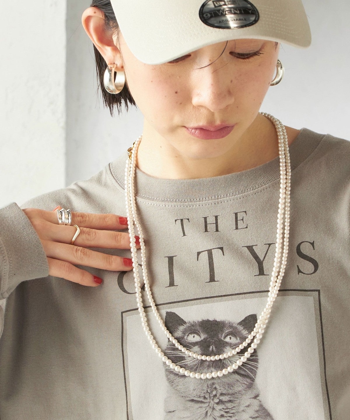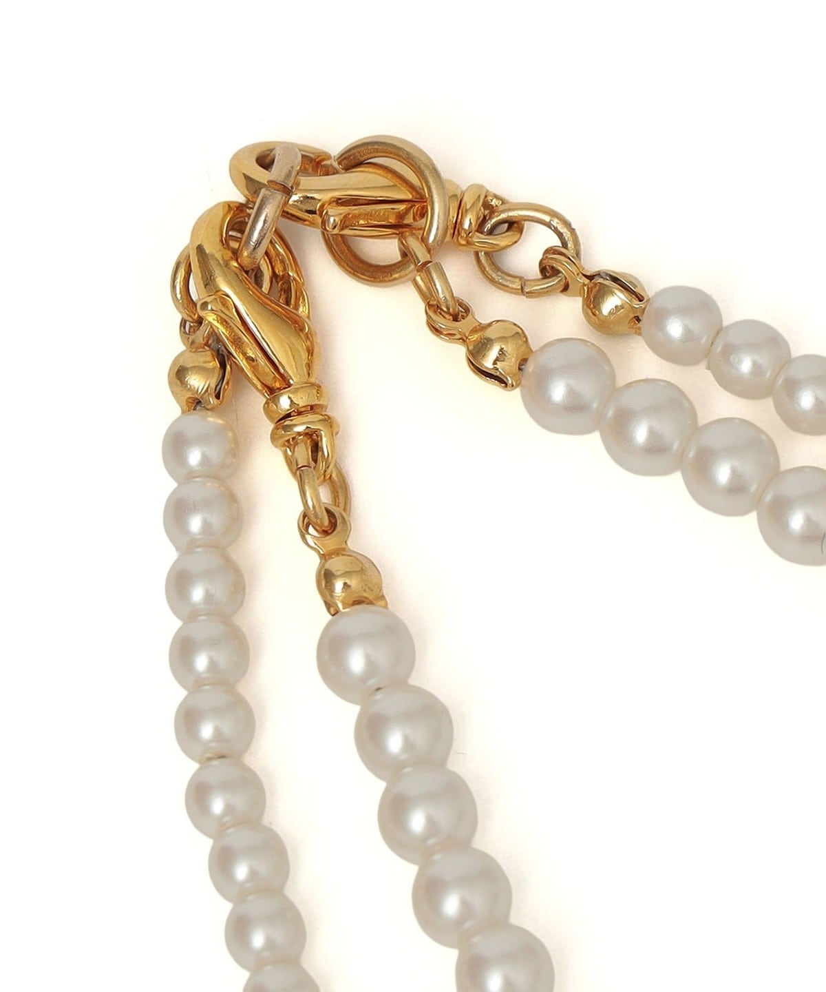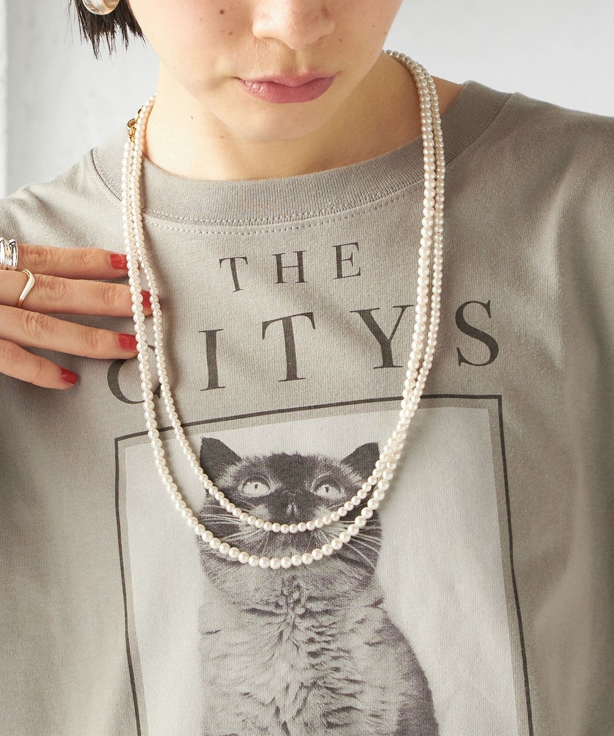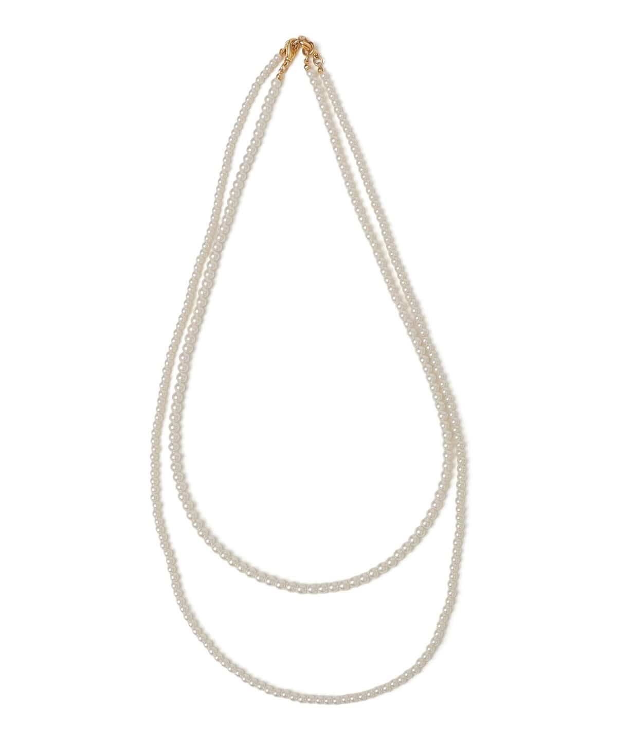 長さ約63cm(パールモチーフ5mm玉)と、長さ約76cm(パールモチーフ4mm玉)を2連にした、マルチウェイのネックレスです。