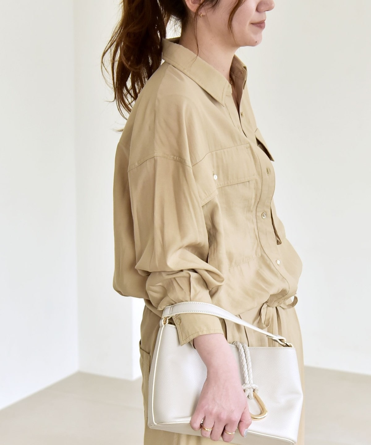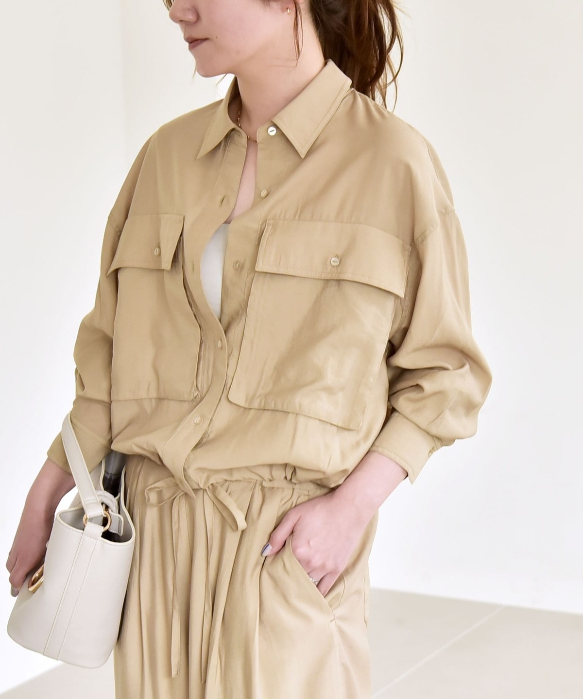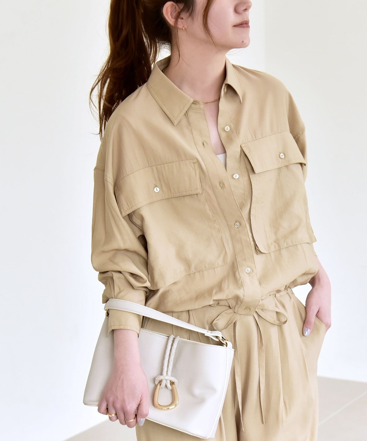 ベージュは同素材のパンツ(品番:613-11-0029)とセットアップで、オールインワンのように着るとこなれ感が出て◎